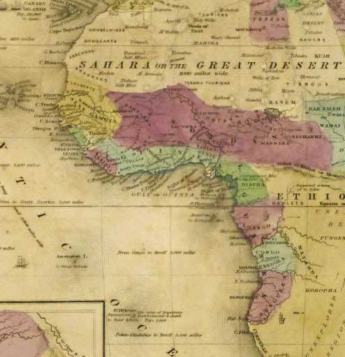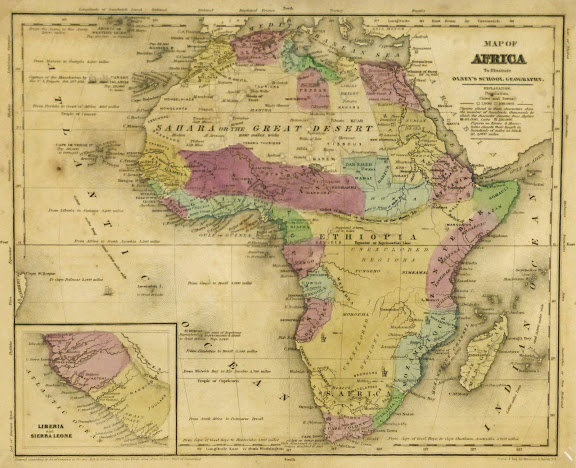 Antique copper engraved map of Africa by Sherman & Smith, 1844. Original hand color. Shows African tribes, rivers, colonies, explorations. Note unexplored regions with source of the Nile river still unknown by western explorers. Inset of Liberia.
