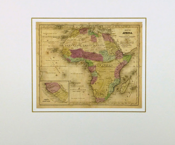 Original antique map displayed on a white mat with a gold border. Mat fits a standard-size frame. Archival plastic sleeve and Certificate of Authenticity included. Map, 11″L x 9″H; mat, 20″L x 16″H.