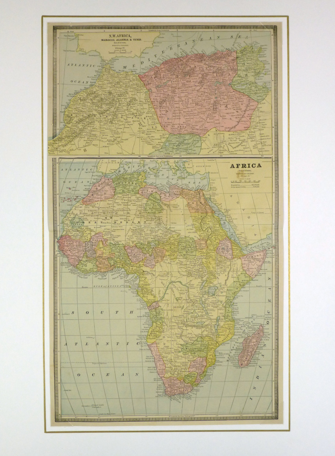Original antique map on paper displayed on a white mat with a gold border. Mat fits a standard-size frame. Archival plastic sleeve and Certificate of Authenticity included. Map, 11.75″L x 10.5″H; mat, 18″L x 24″H.