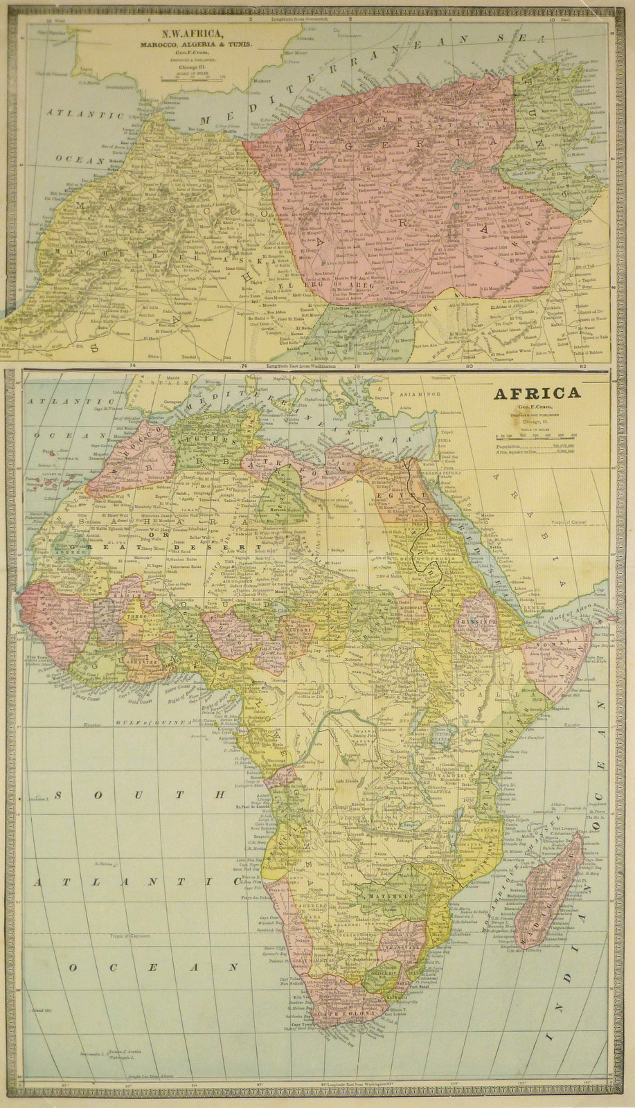 Bright engraved map of Africa and North Africa, 1890. Shows borders, tribes, rivers, mountains, and towns.