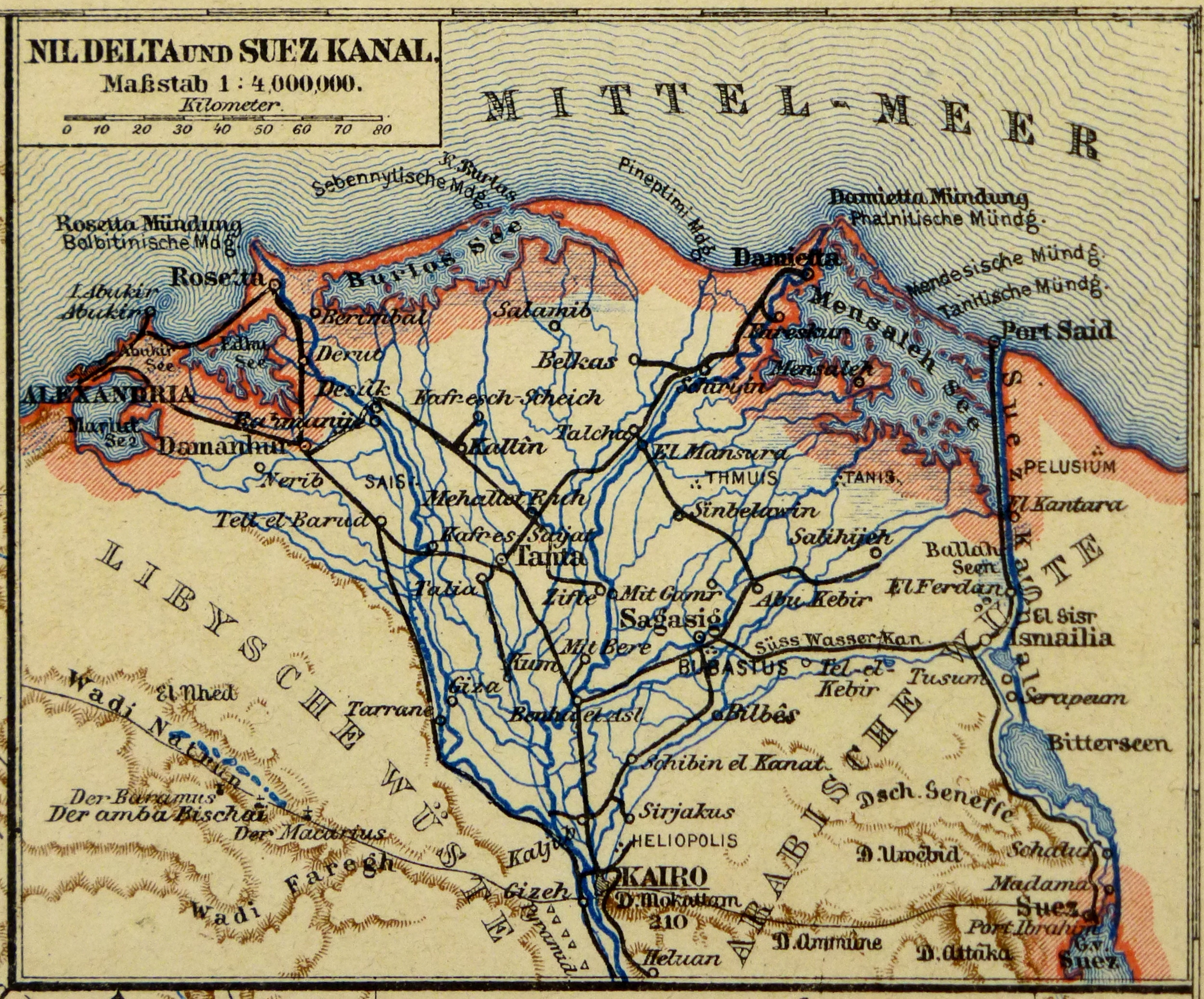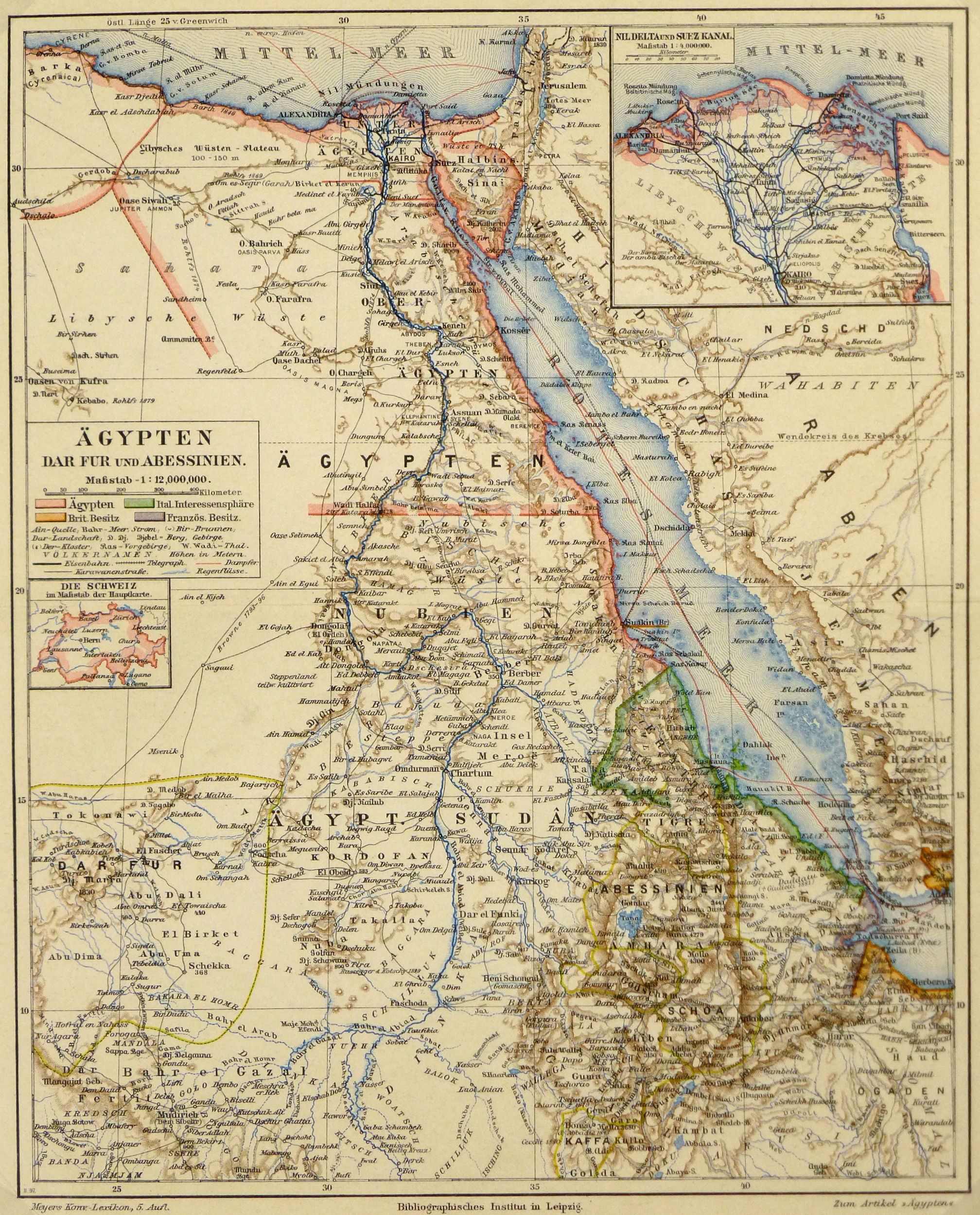 Captivating antique map of the Nile river with Egypt, Sudan and Ethiopia from circa 1880. Shows rivers, mountains, borders and towns. Note many trails and index of colonies left margin.