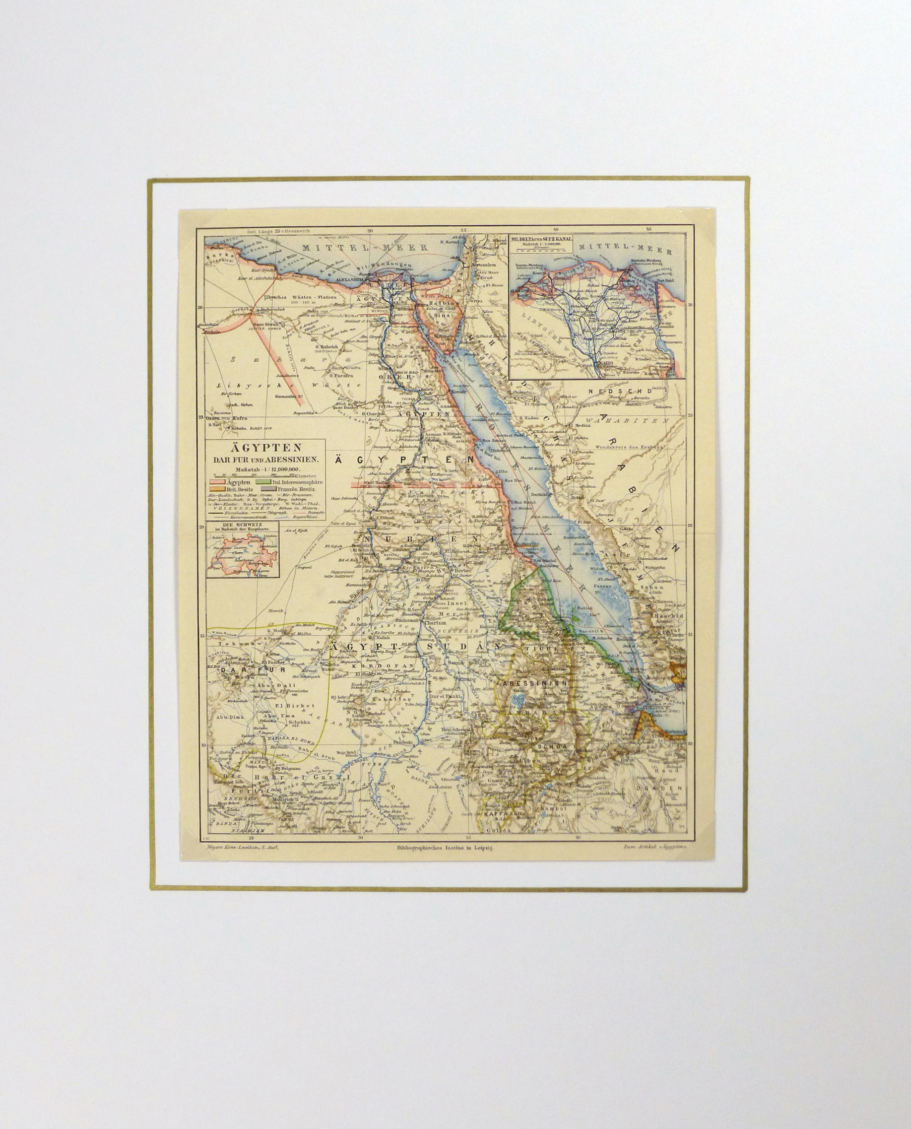 Original antique map on paper displayed on a white mat with a gold border. Mat fits a standard-size frame. Archival plastic sleeve and Certificate of Authenticity included. Map, 9″L x 11″H; mat, 16″L x 20″H.