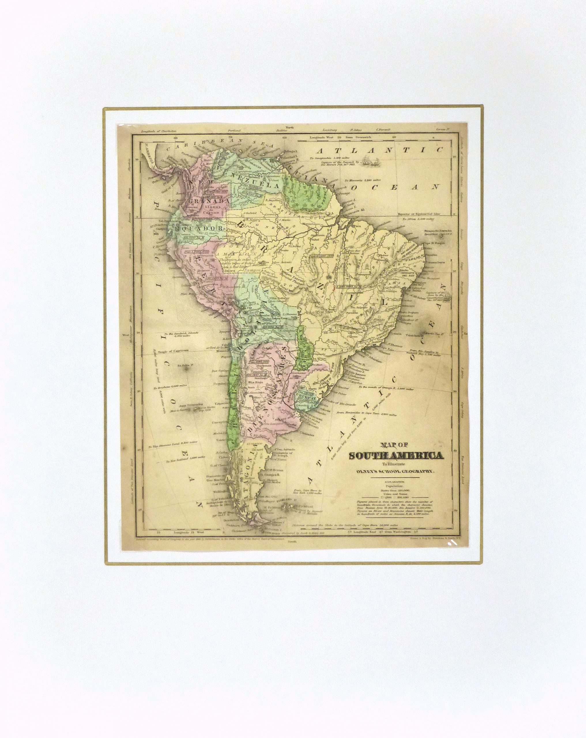 Antique map of South America, 1844. Shows the early country borders, mountains, rivers and towns. Original hand-color. Note Bolivia still has access to the Pacific , Patagonia is independent of Argentina or Chile. Panana is part of Colombia.