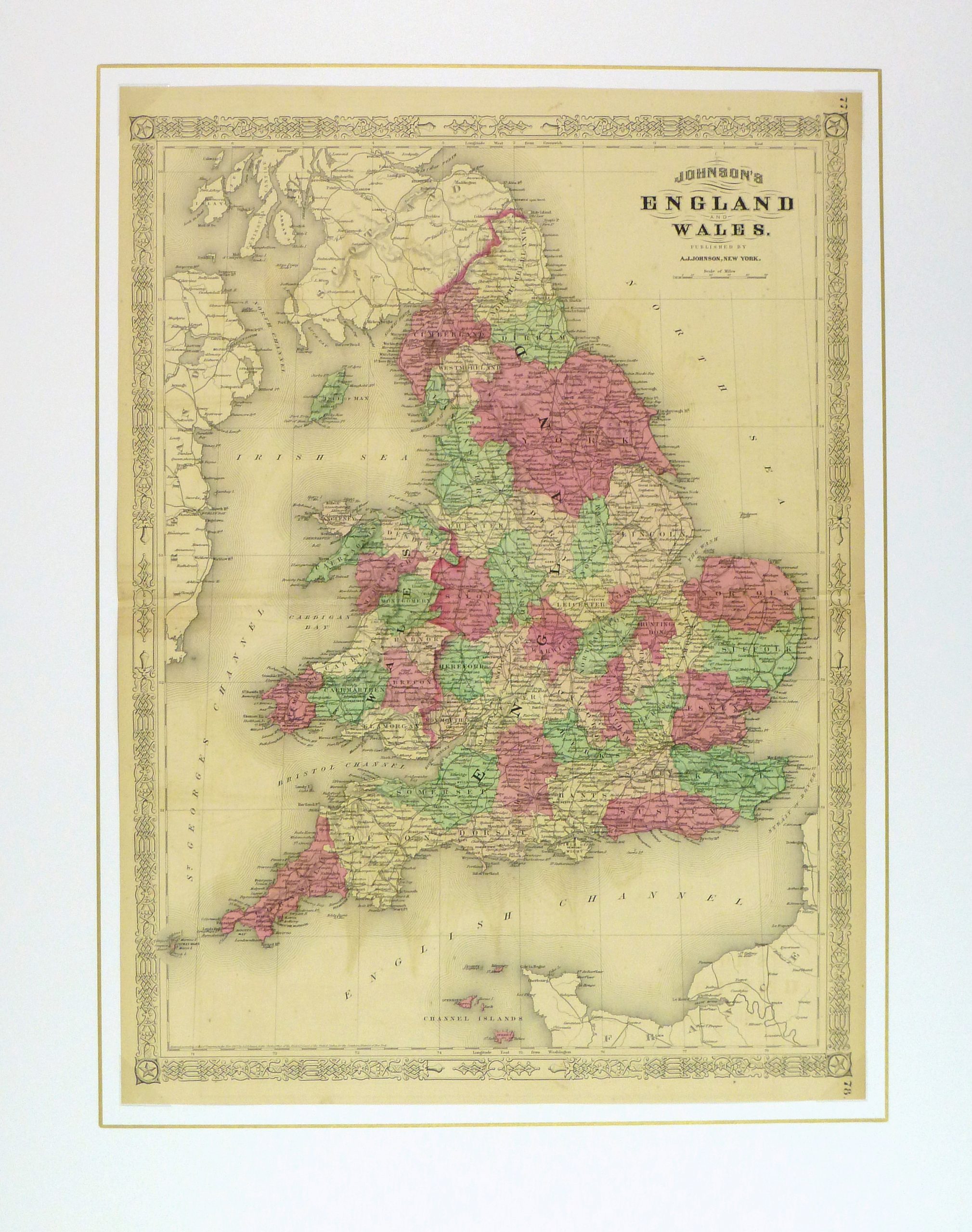 Over 100 year old antique map of England and Wales from 1868. Shows counties, railroads, rivers, and towns.