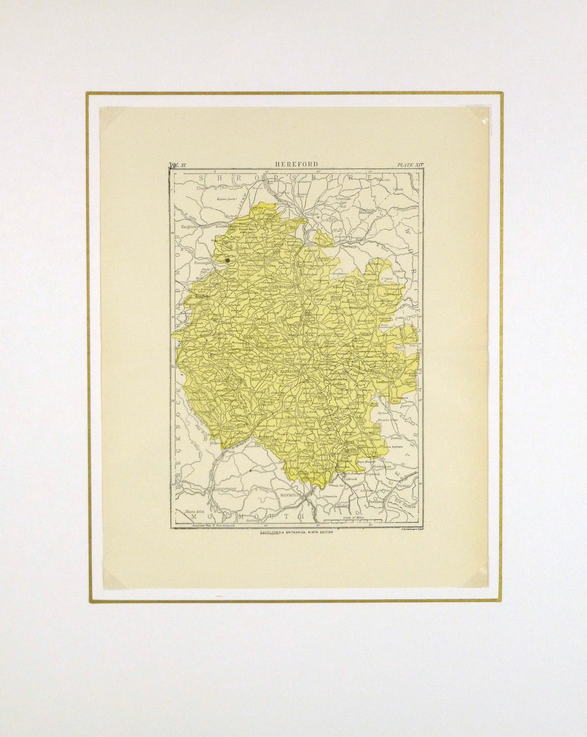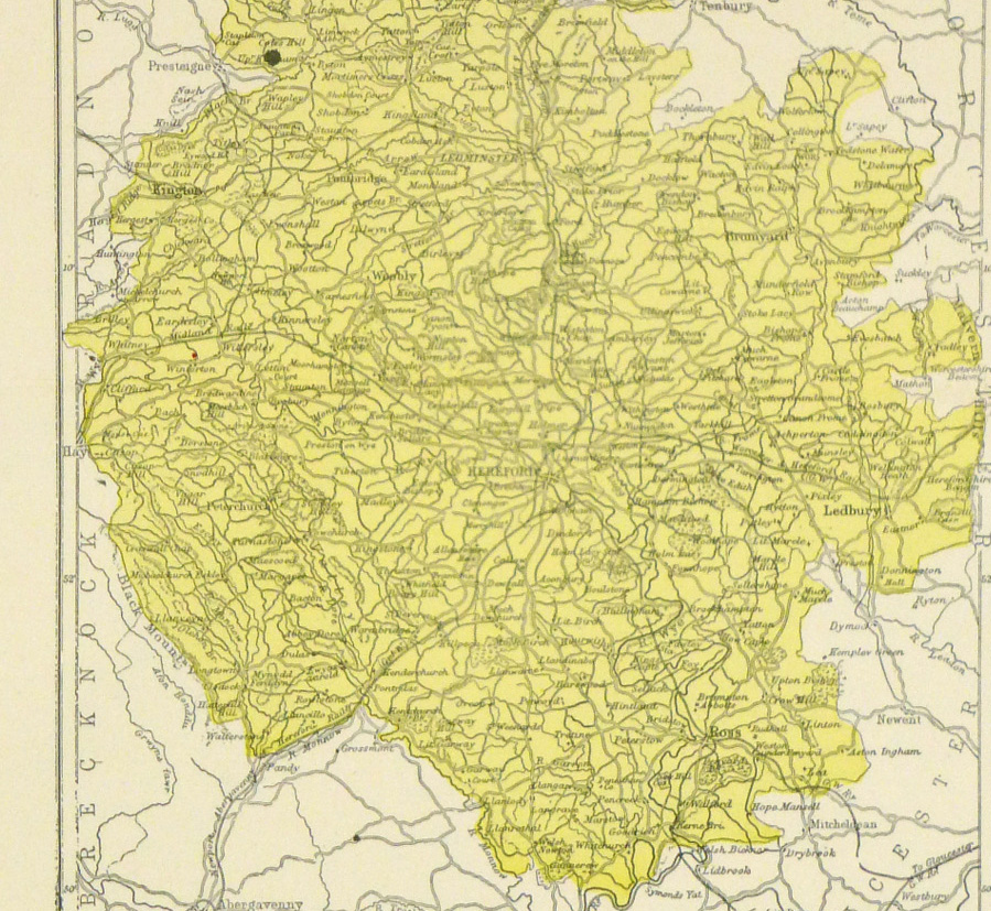 Antique map of Hereford, England from circa 1880. Shows county and towns.