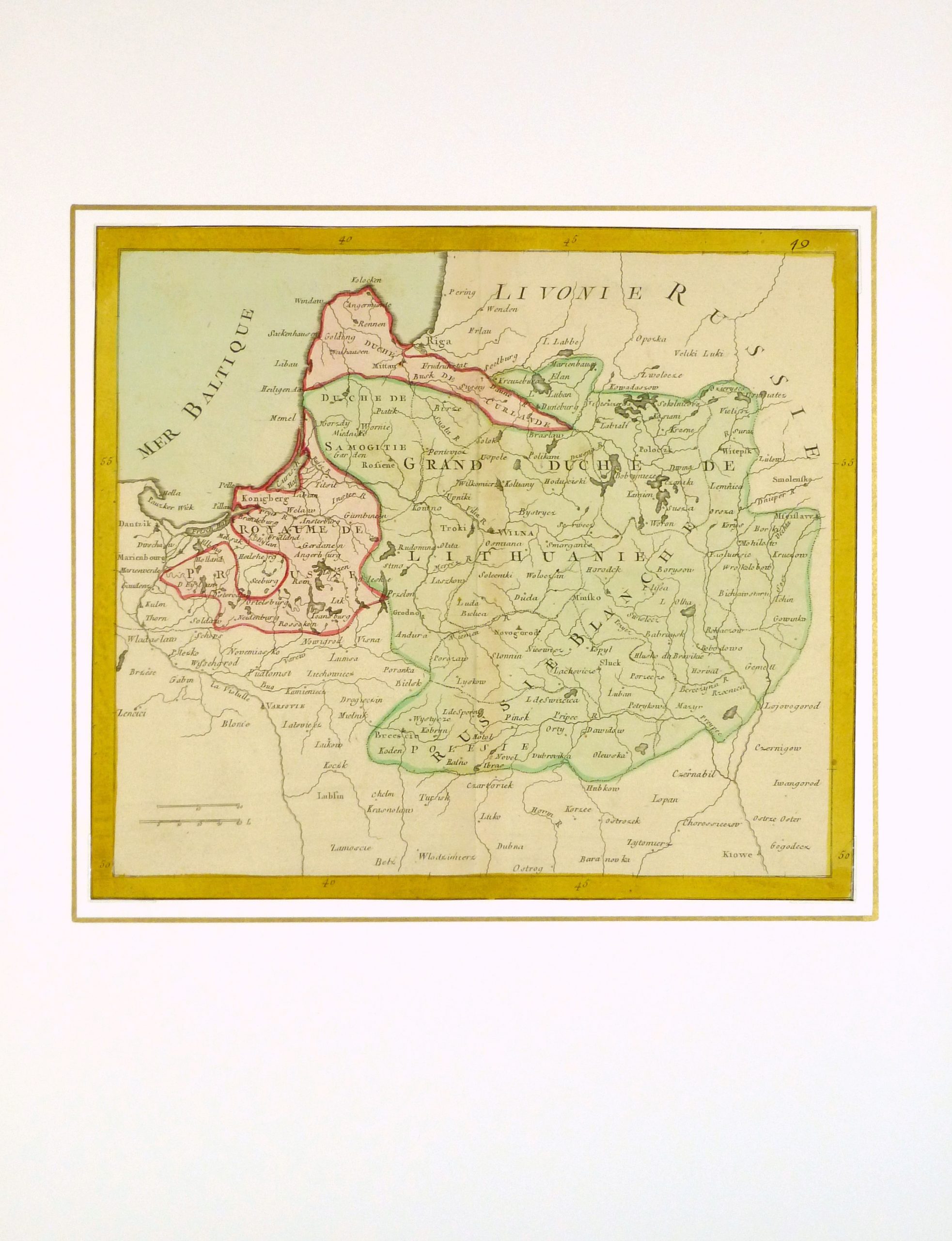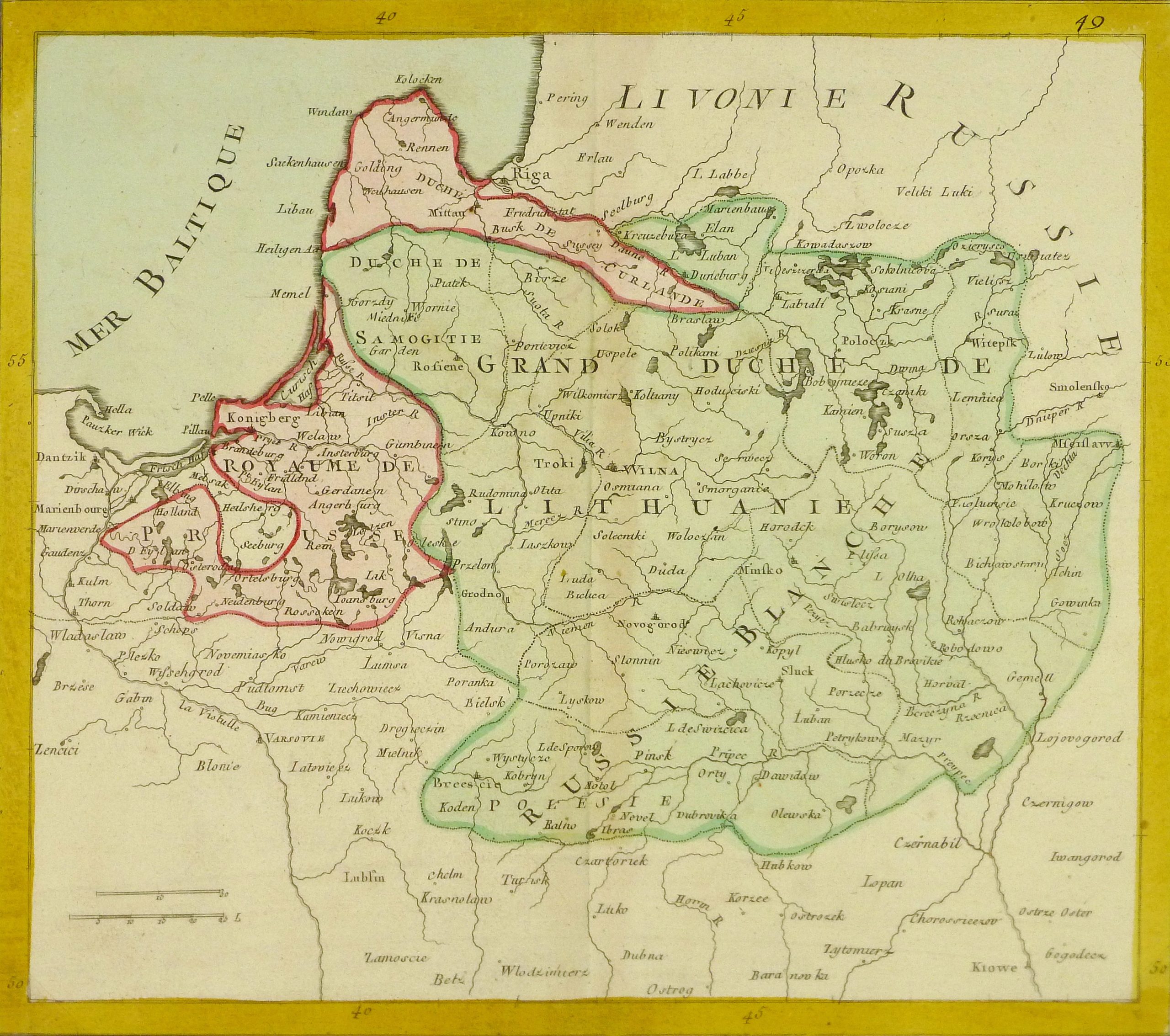 Antique engraved map of the Kingdom of Lithuania, circa 1770, an area seldom figured on maps. Original hand color.