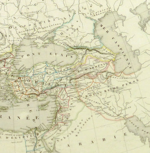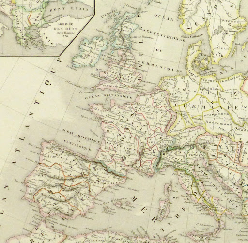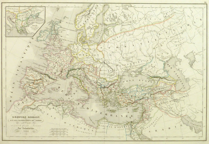 Antique hand-colored copper engraved map of the Roman Empire and the Barbaric North by Delamarche from 1845.