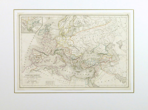 Original antique map on paper displayed on a white mat with a gold border. Mat fits a standard-size frame. Archival plastic sleeve and Certificate of Authenticity included. Map, 17.25″L x 12″H; mat, 24″L x 18″H.