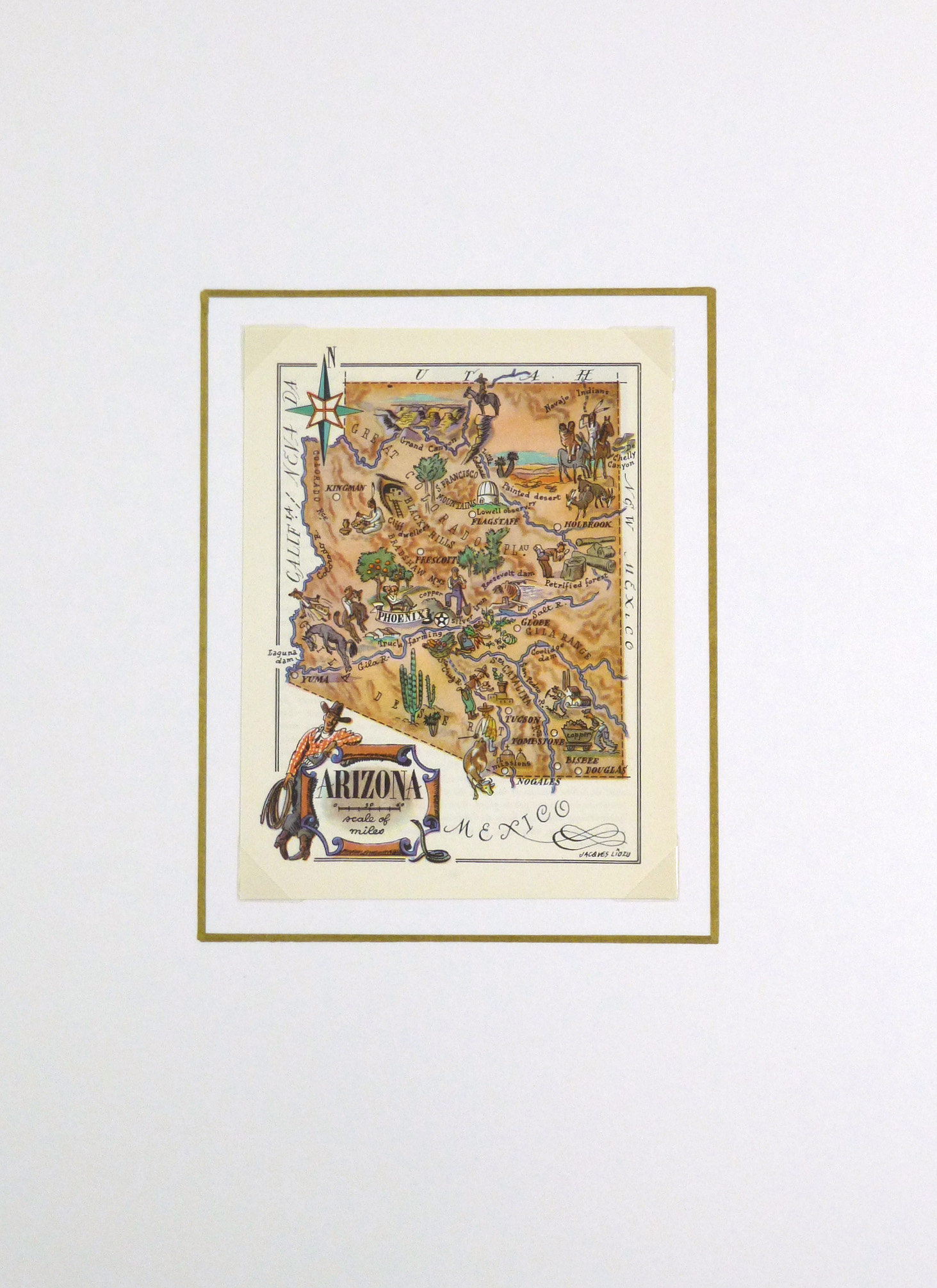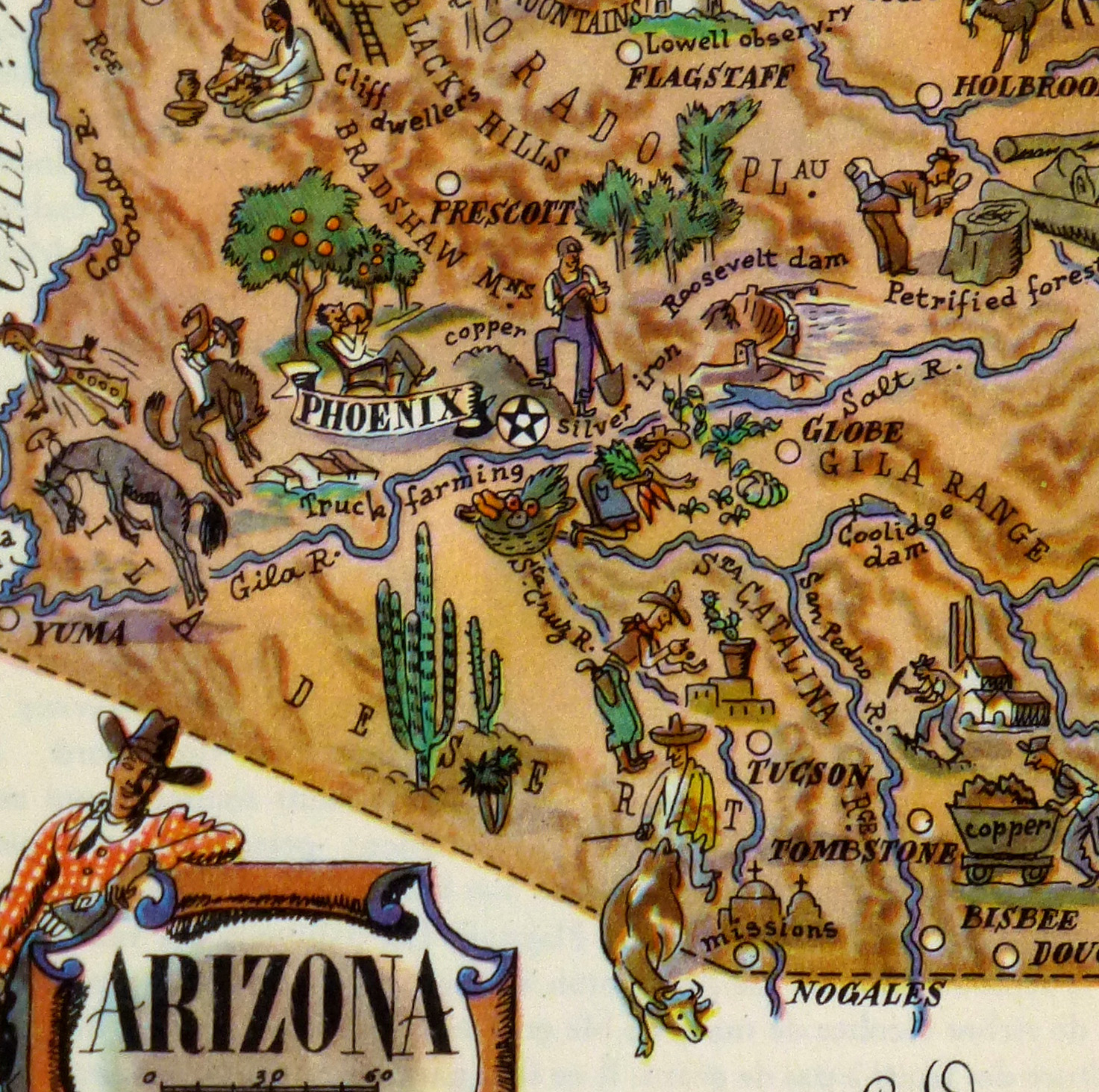 Bright and colorful offset lithograph pictorial map of Arizona from 1946. Note many historical and cultural sites depicted in playful designs, adorned with elaborate title cartouche.