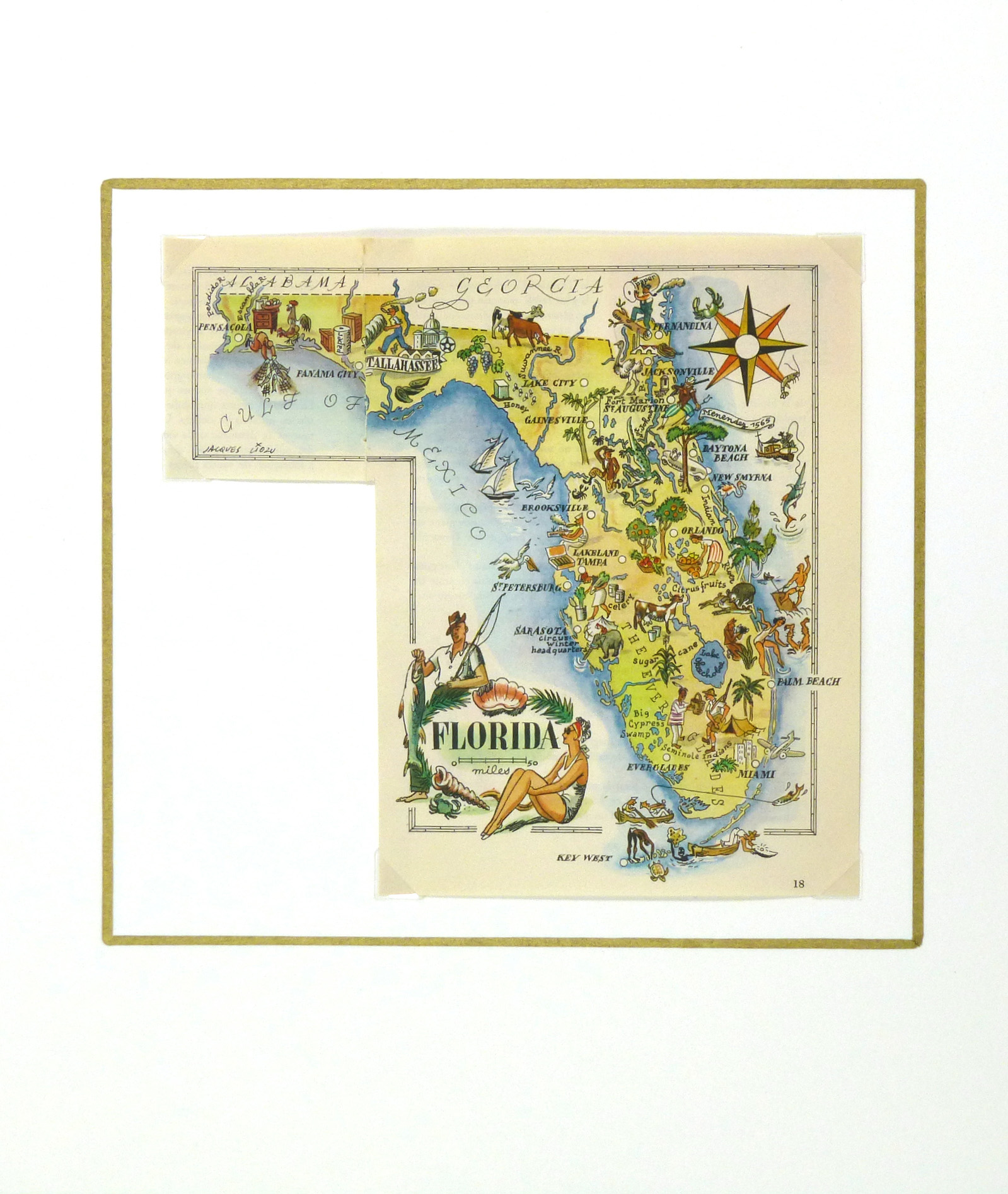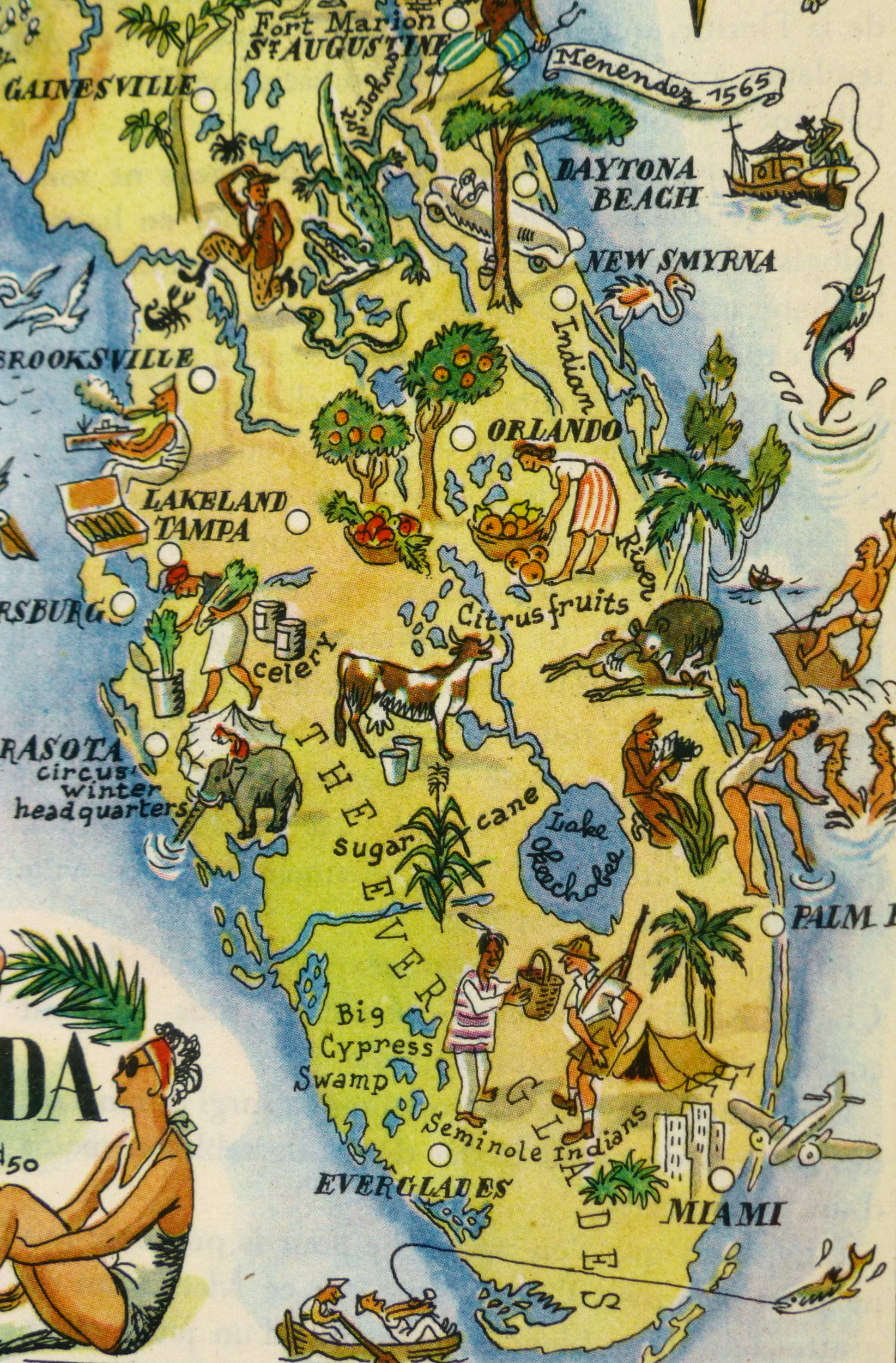 Bright and colorful offset lithograph pictorial map of Florida from 1946. Note many historical and cultural sites depicted in playful designs, adorned with elaborate title cartouche.
