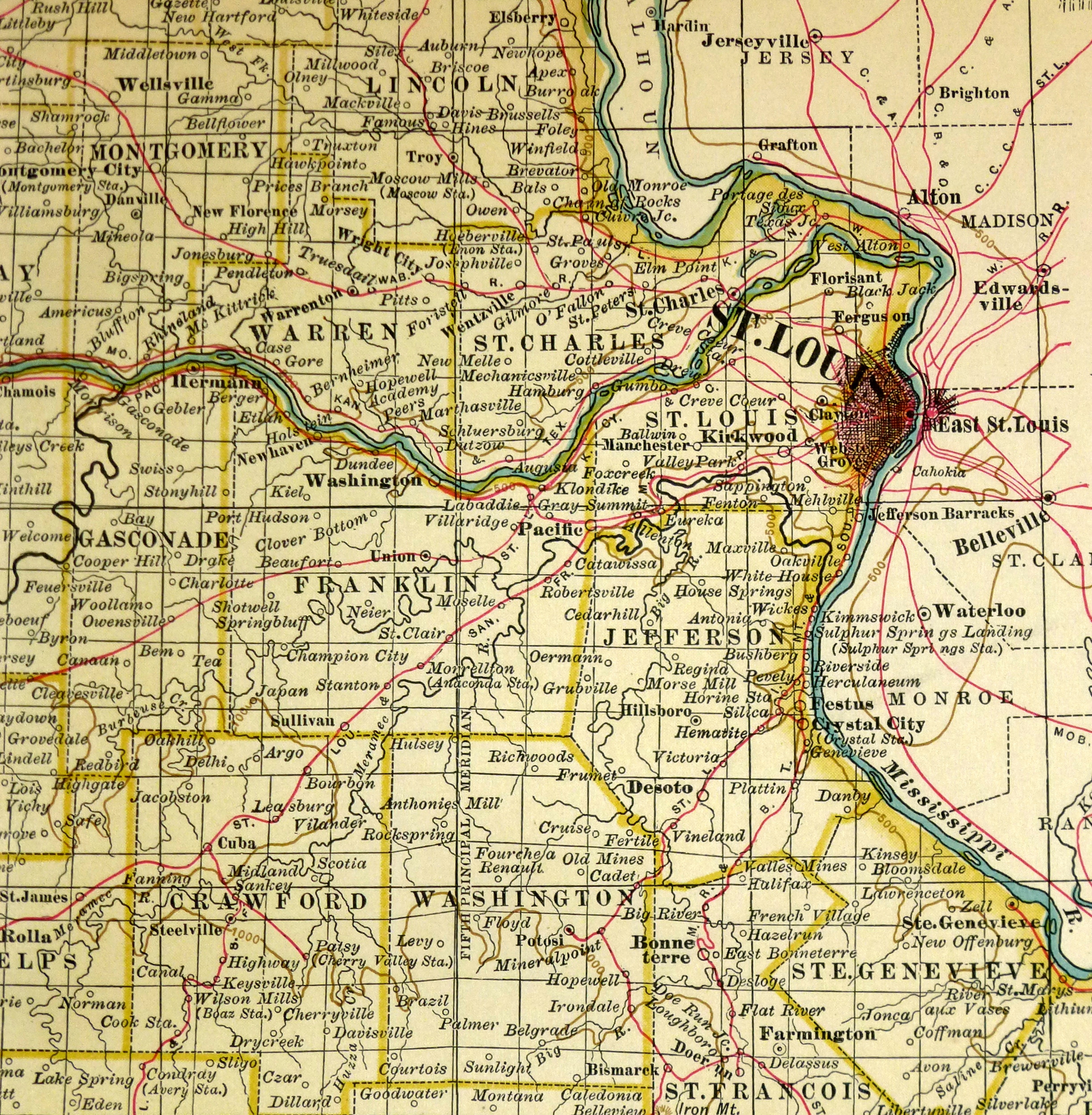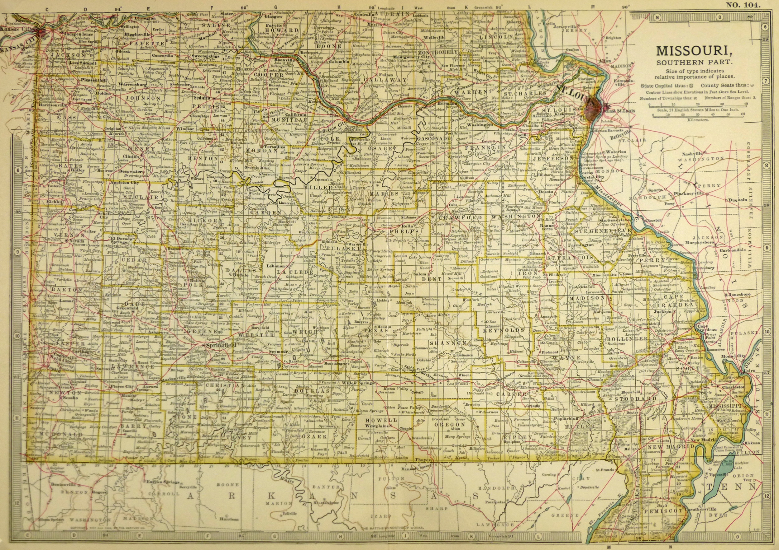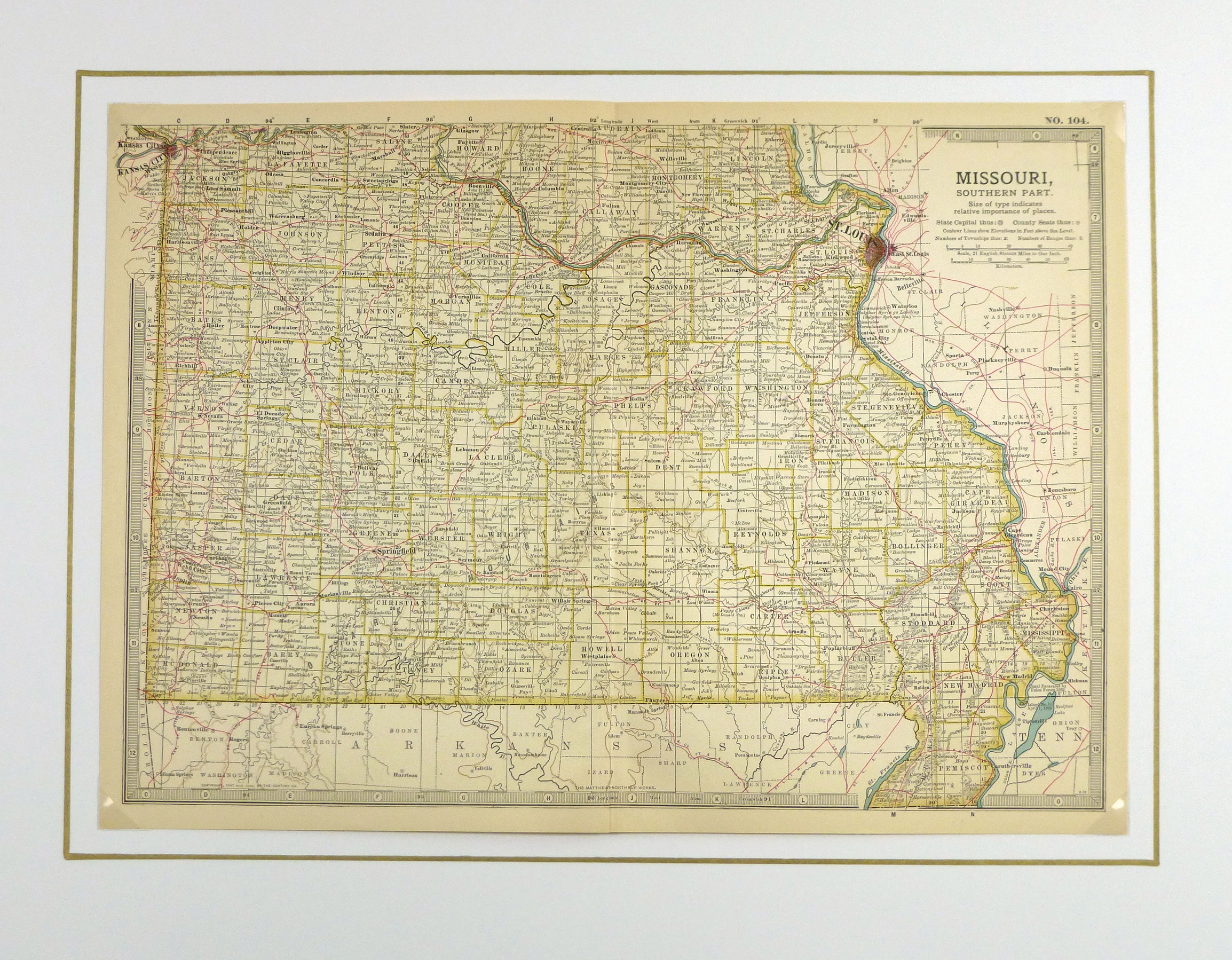 Vintage map of southern Missouri from 1902. Shows counties, townships, railroads, and towns. Desirable for its wealth of detail.