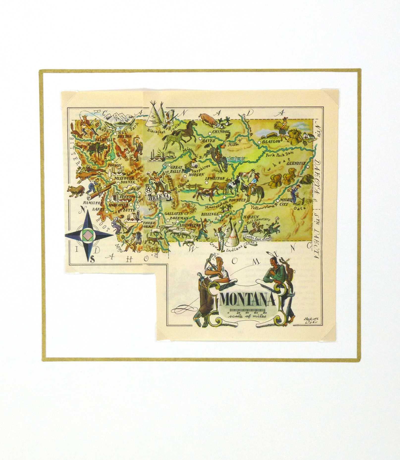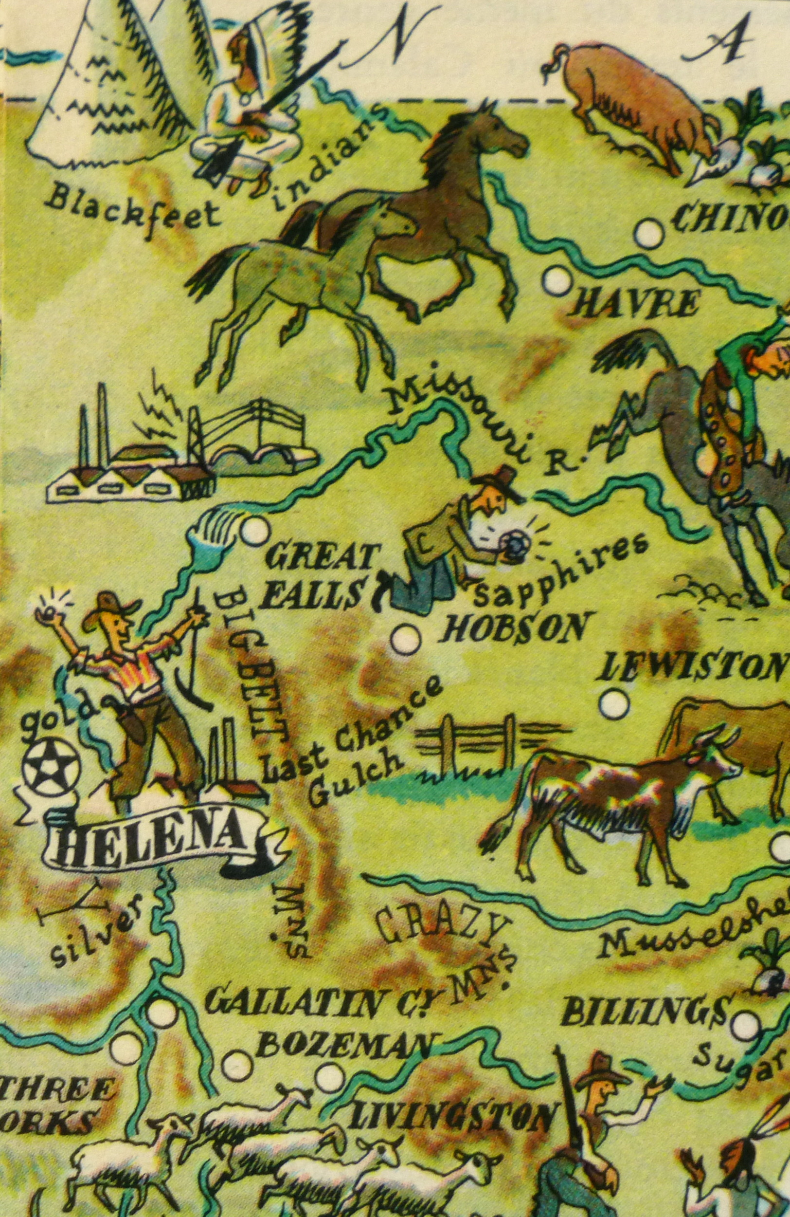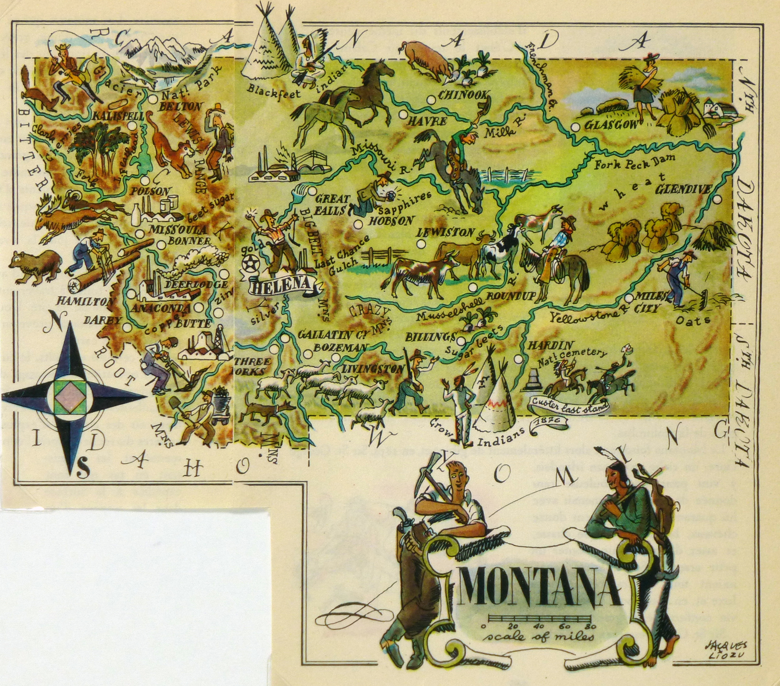 Bright and colorful pictorial map of Montana from 1946. Note many historical and cultural sites depicted in playful designs, adorned with elaborate title cartouche.