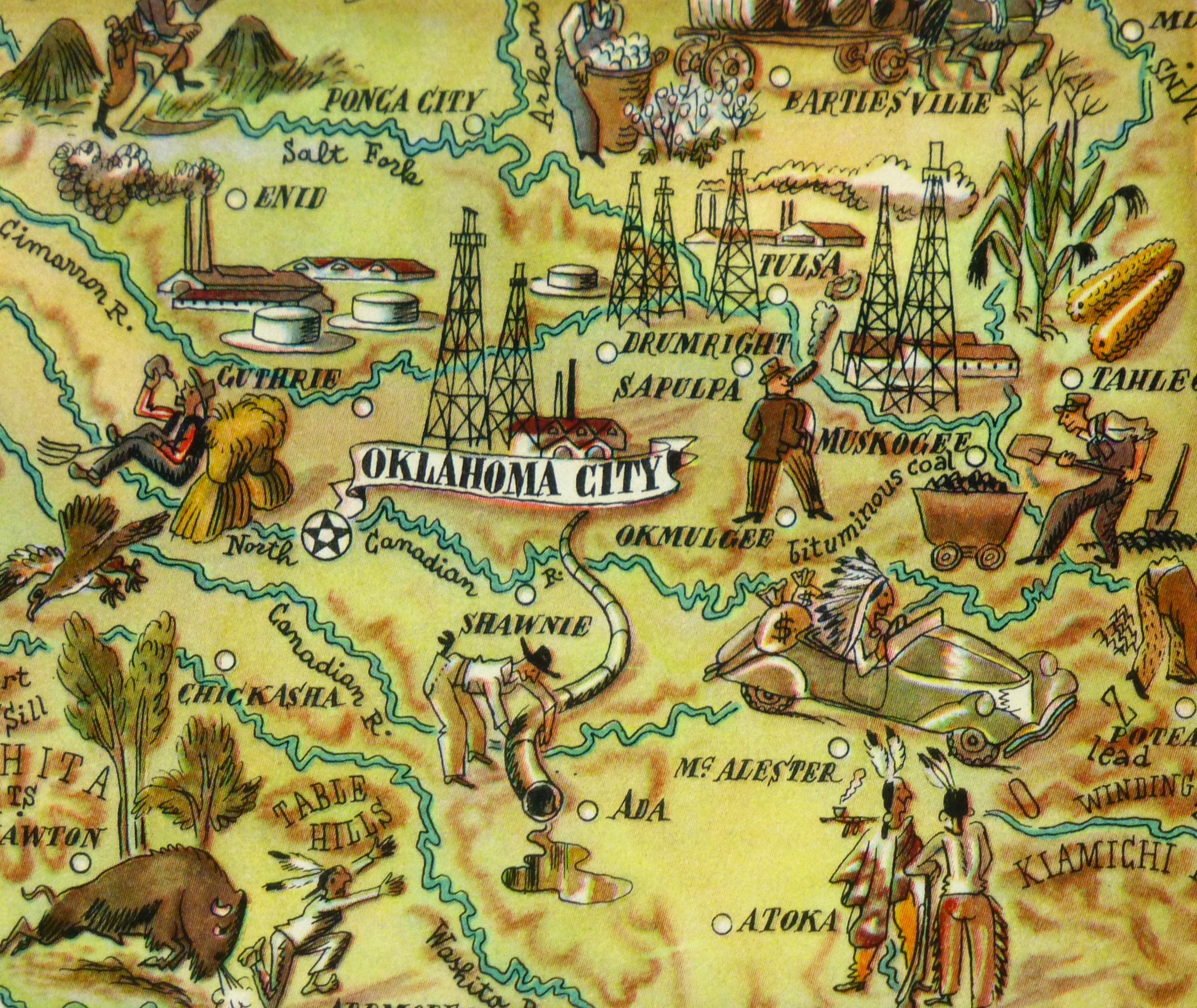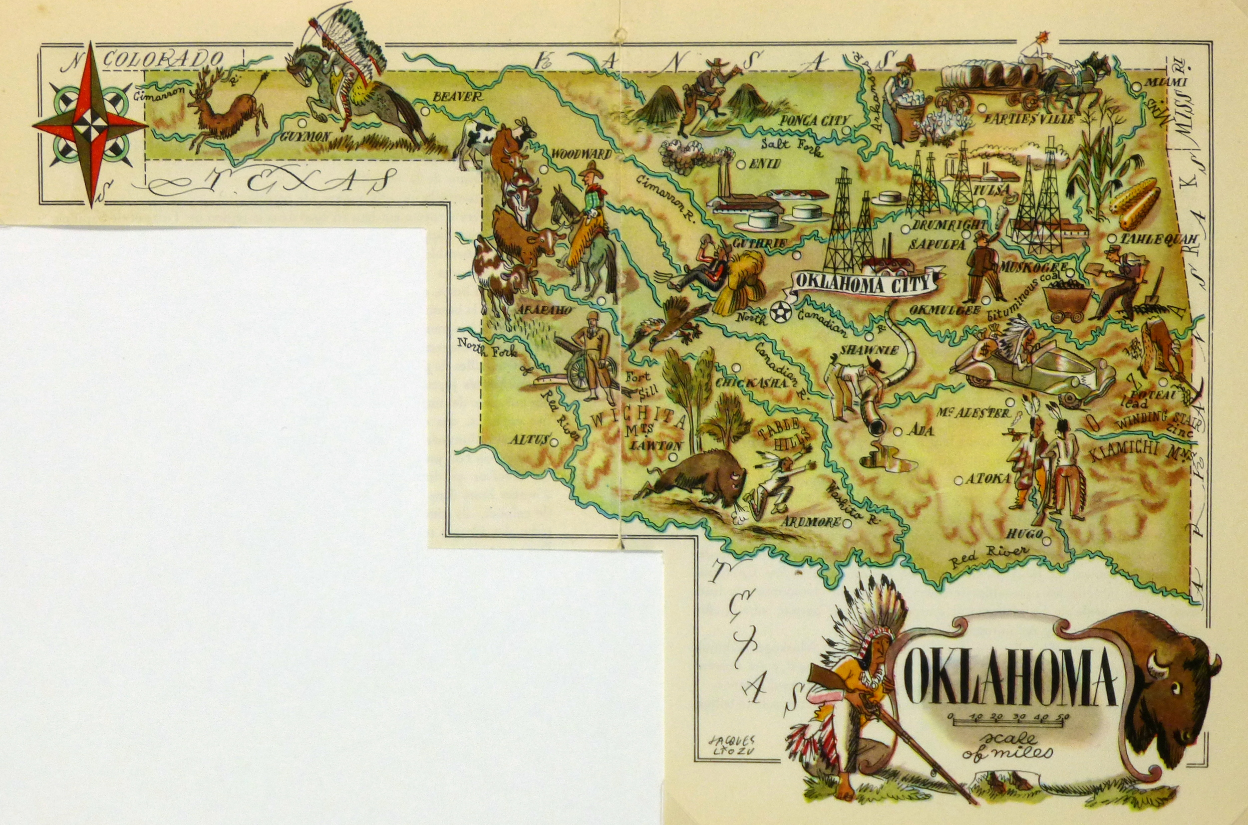 Bright and colorful pictorial map of Oklahoma from 1946. Note many historical and cultural sites depicted in playful designs, adorned with elaborate title cartouche.