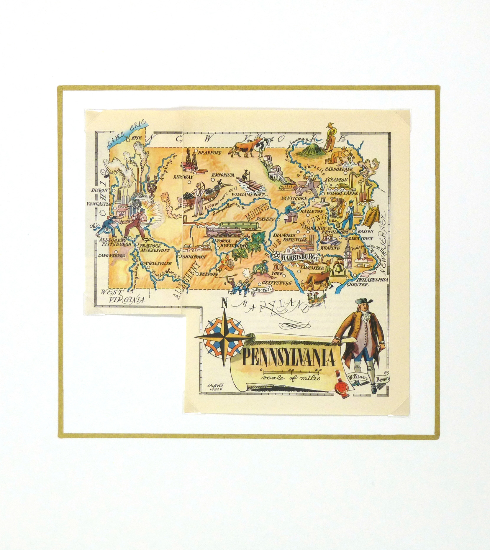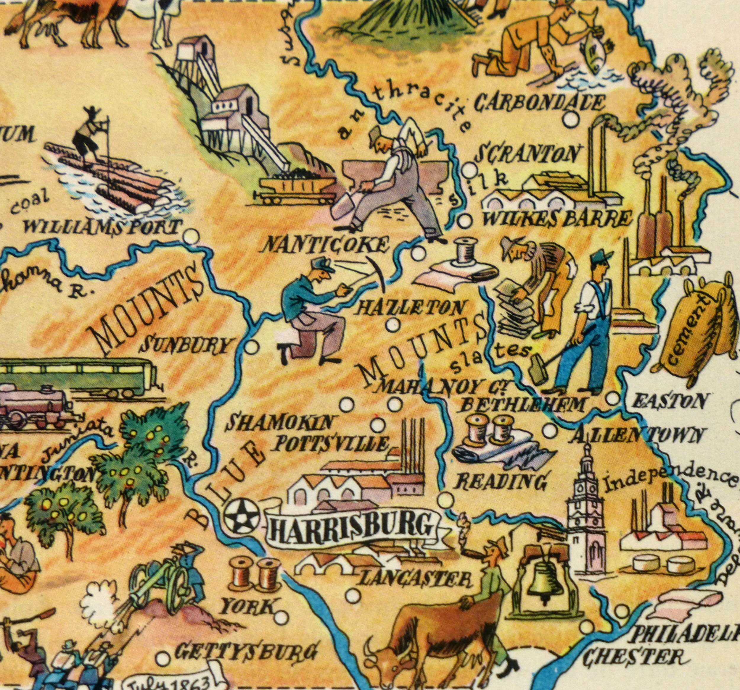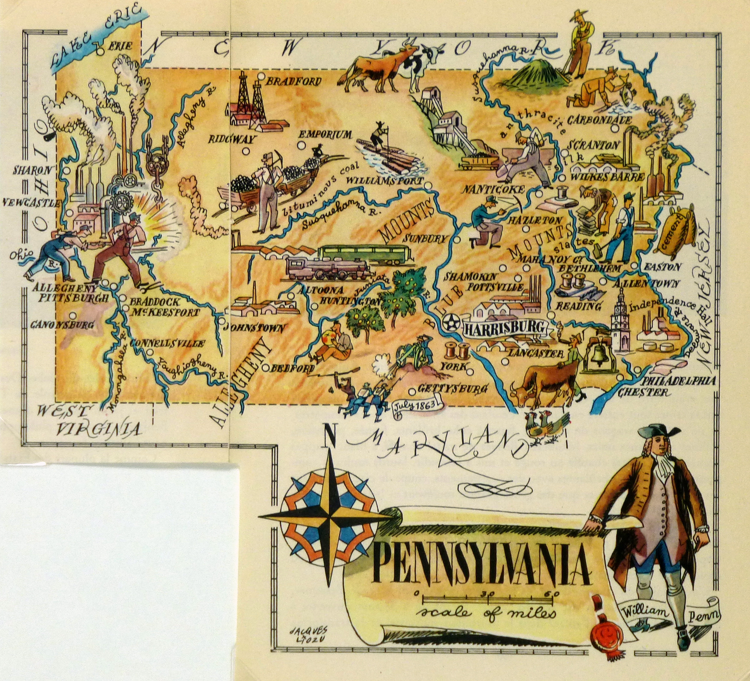 Bright and colorful pictorial map of Pennsylvania from 1946. Note many historical and cultural sites depicted in playful designs, adorned with elaborate title cartouche.