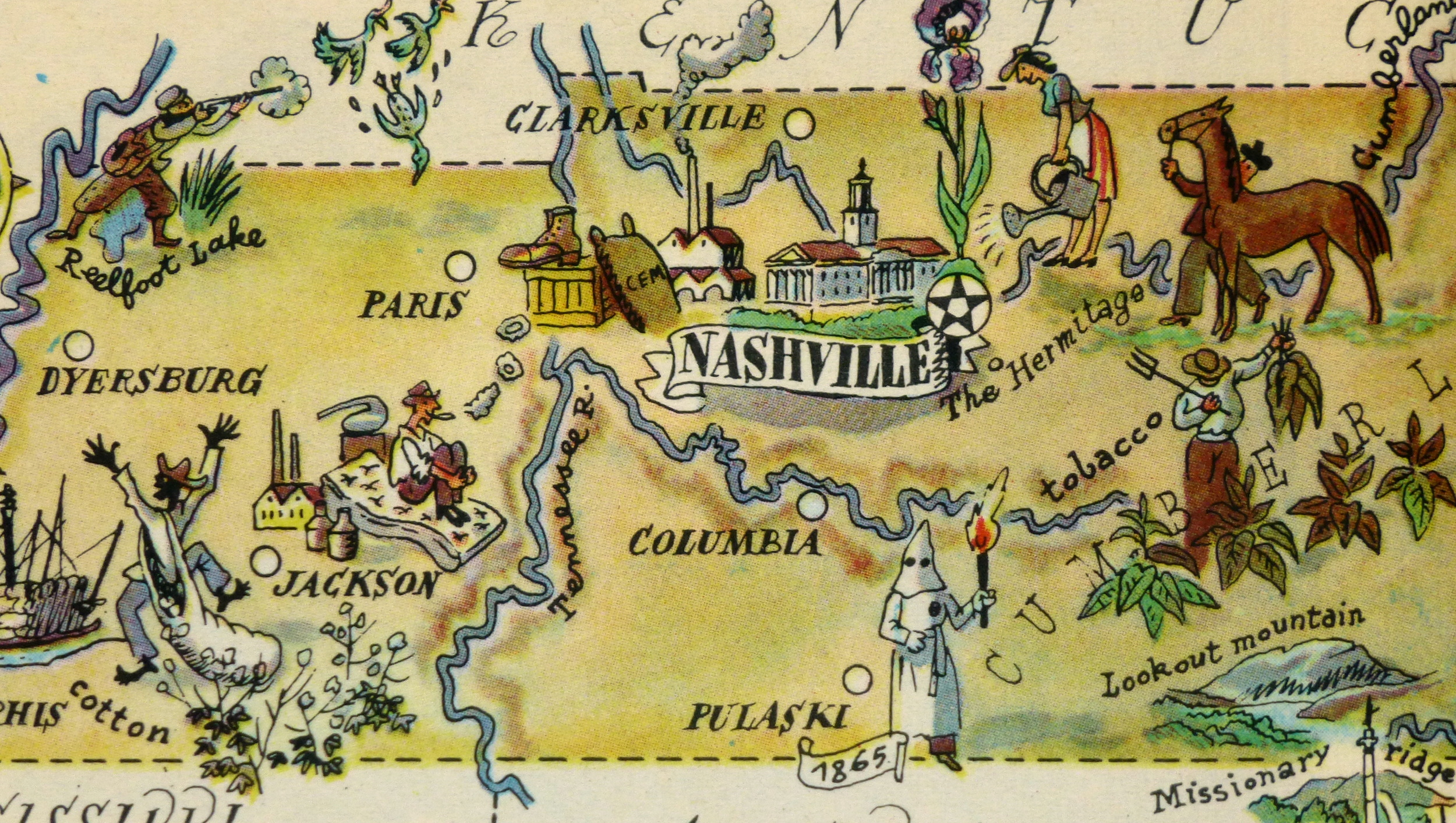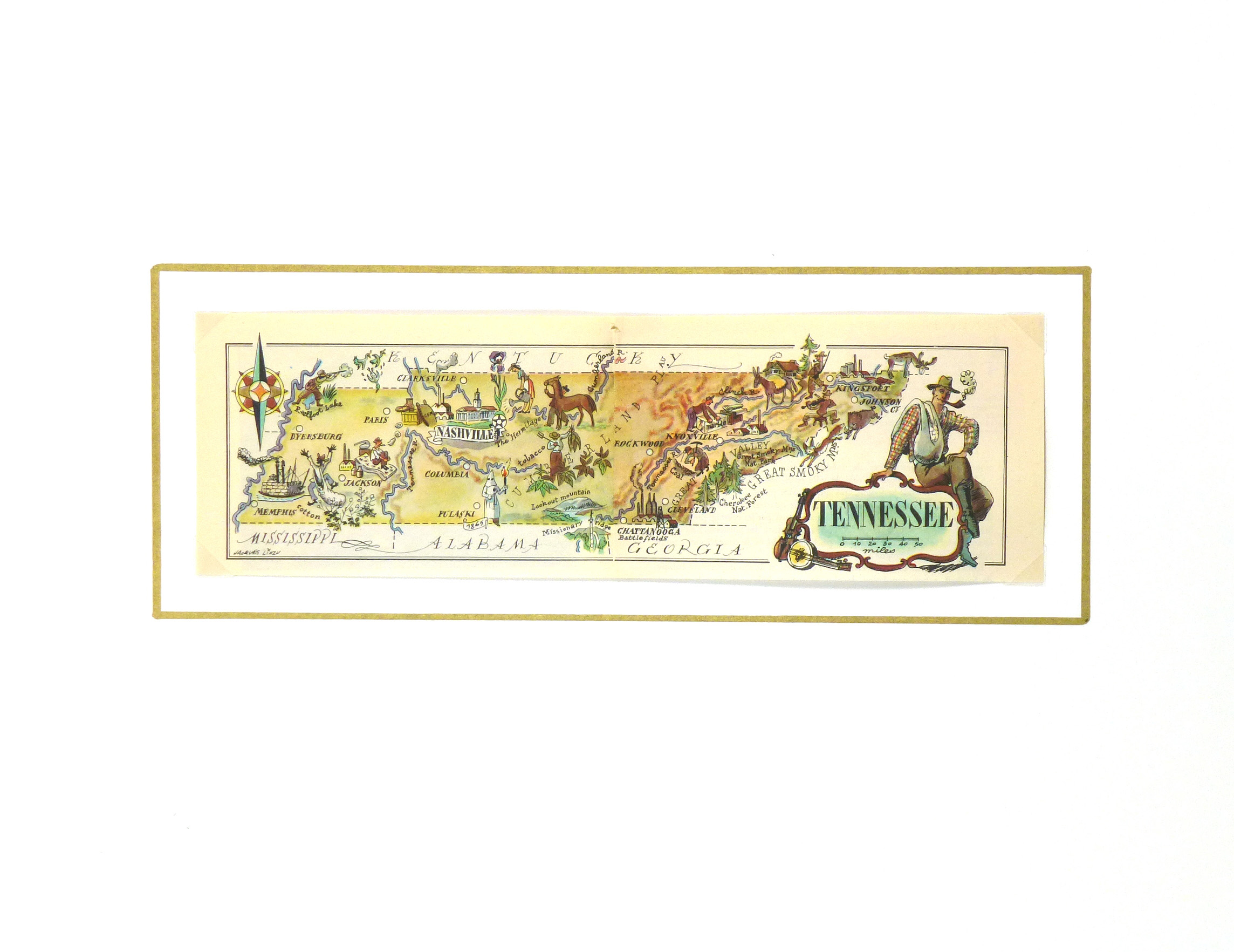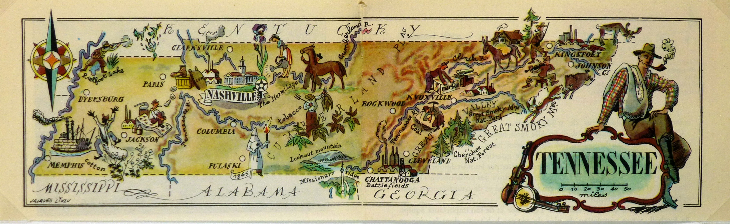 Bright and colorful pictorial map of Tennessee from 1946. Note many historical and cultural sites depicted in playful designs, adorned with elaborate title cartouche.