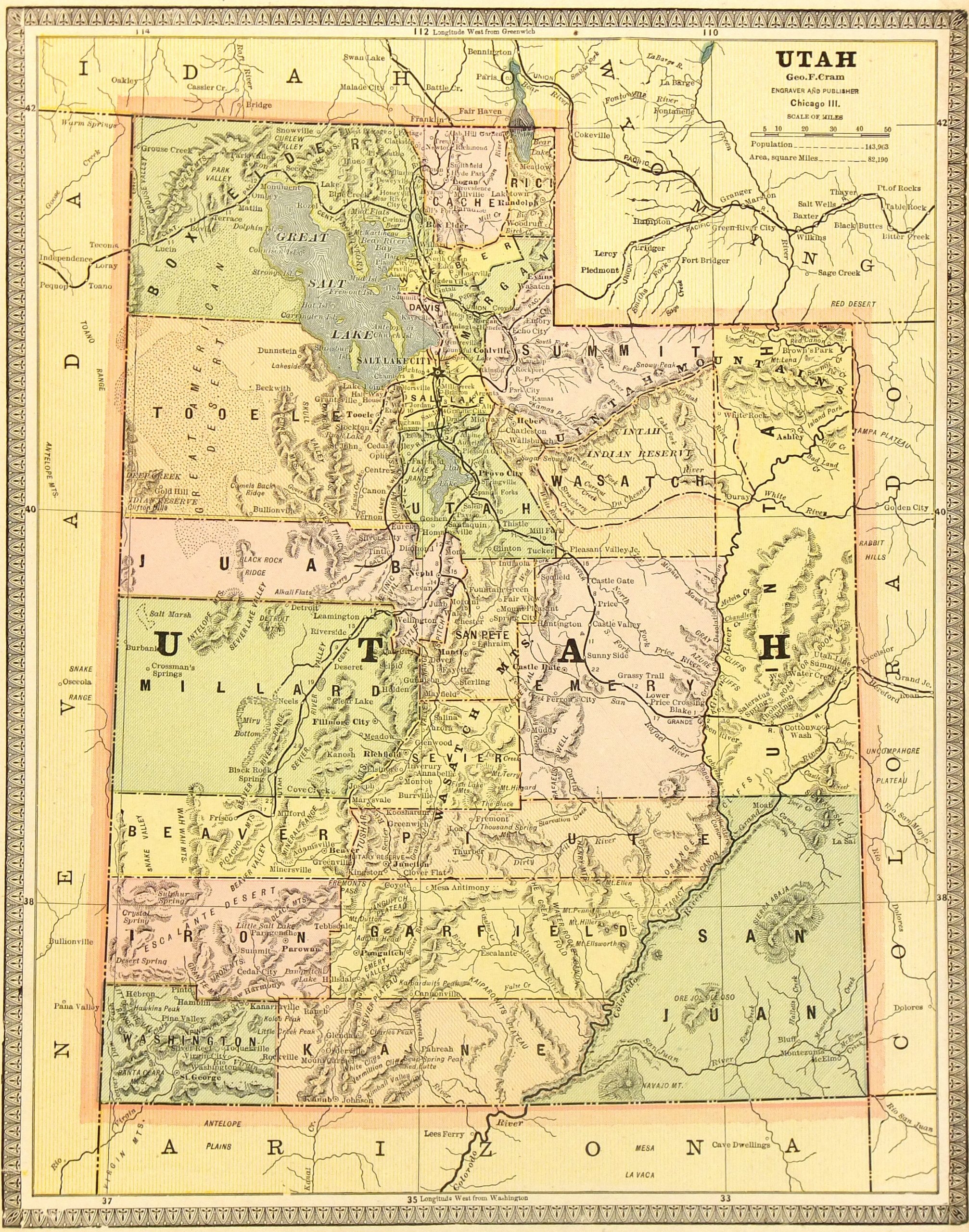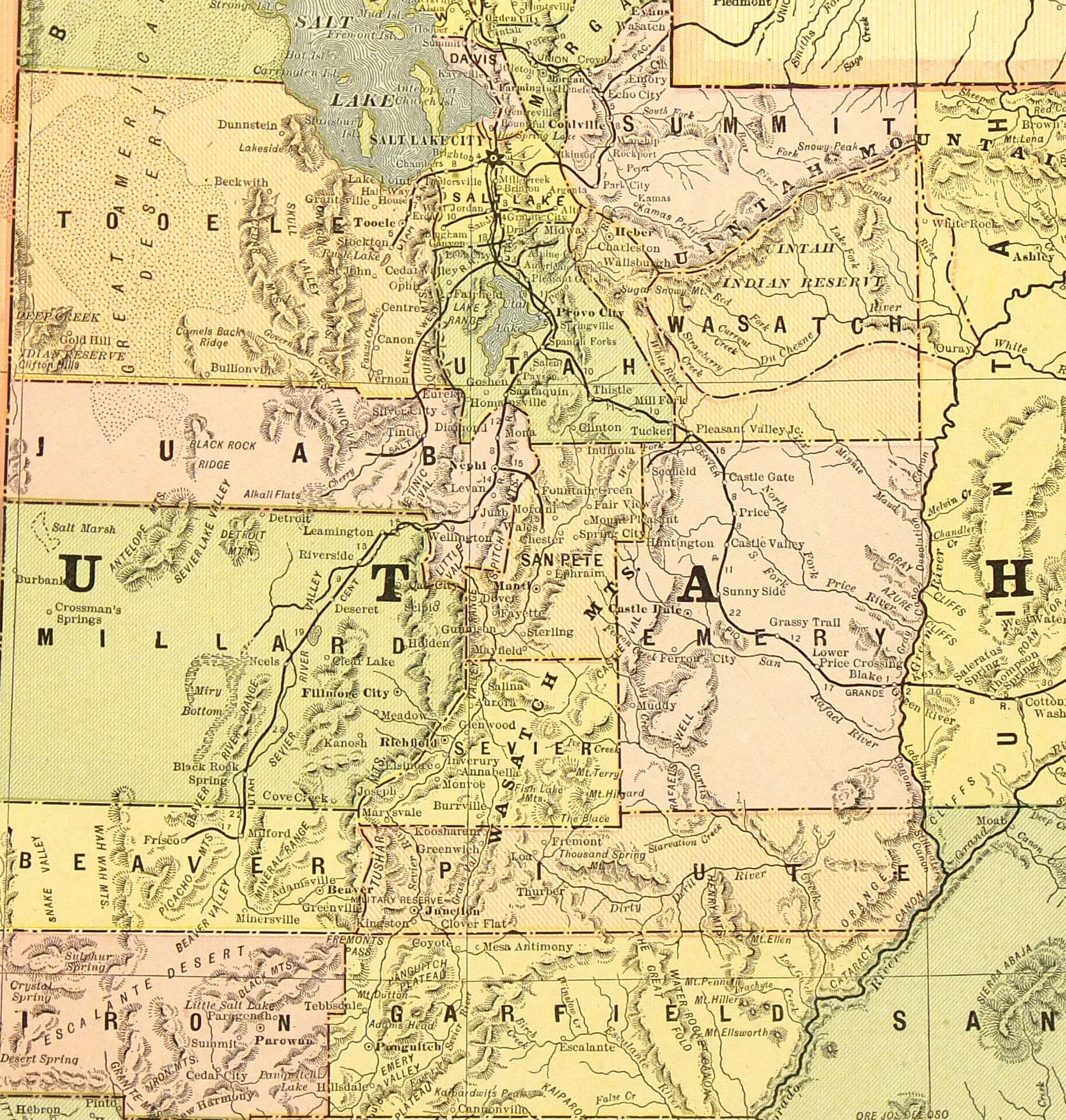 Antique map of Utah, 1890. Shows railroads, counties, rivers, and towns.