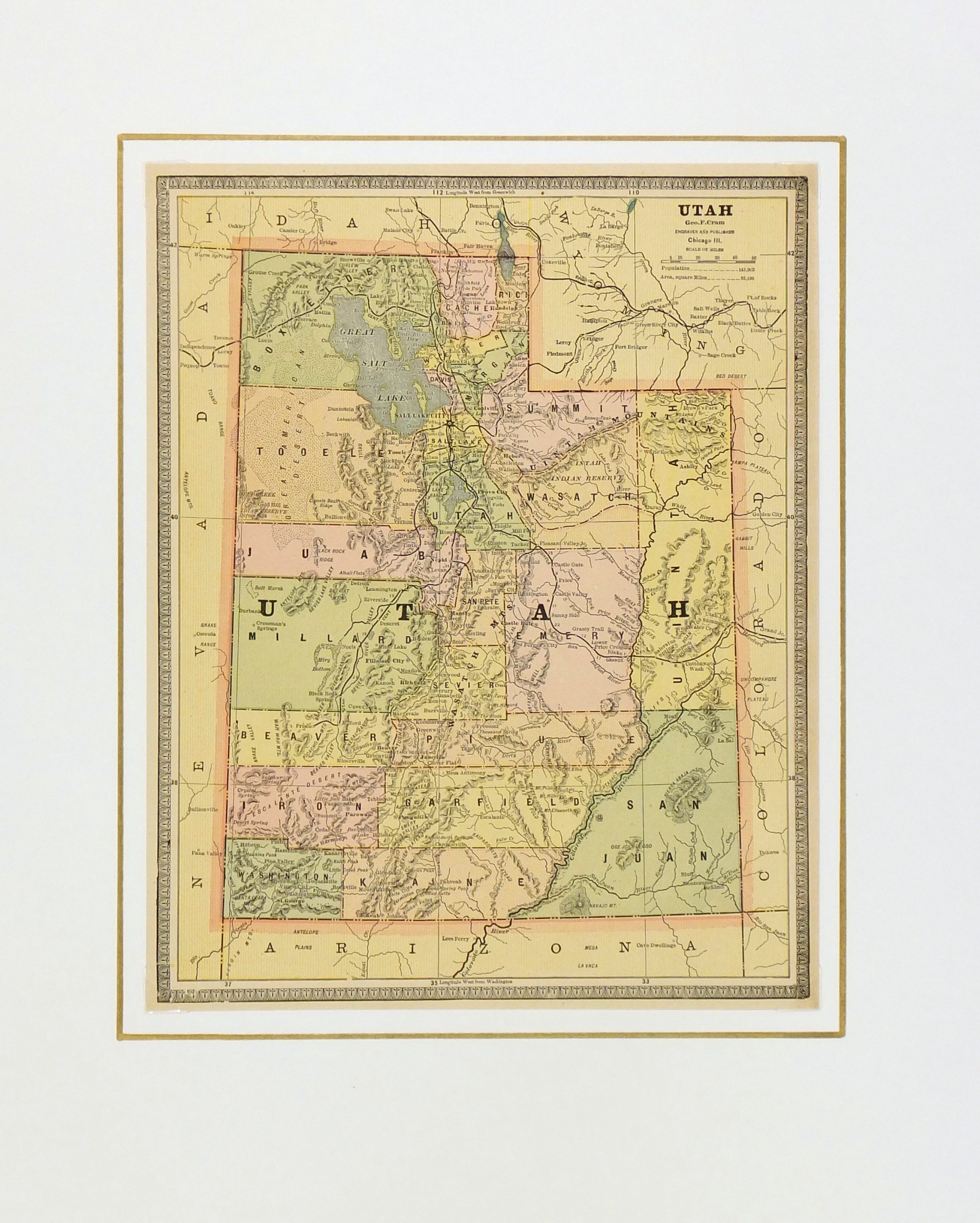 Original antique map on paper displayed on a white mat with a gold border. Mat fits a standard-size frame. Archival plastic sleeve and Certificate of Authenticity included. Map, 10″L x 12.5″H; mat, 16″L x 20″H.