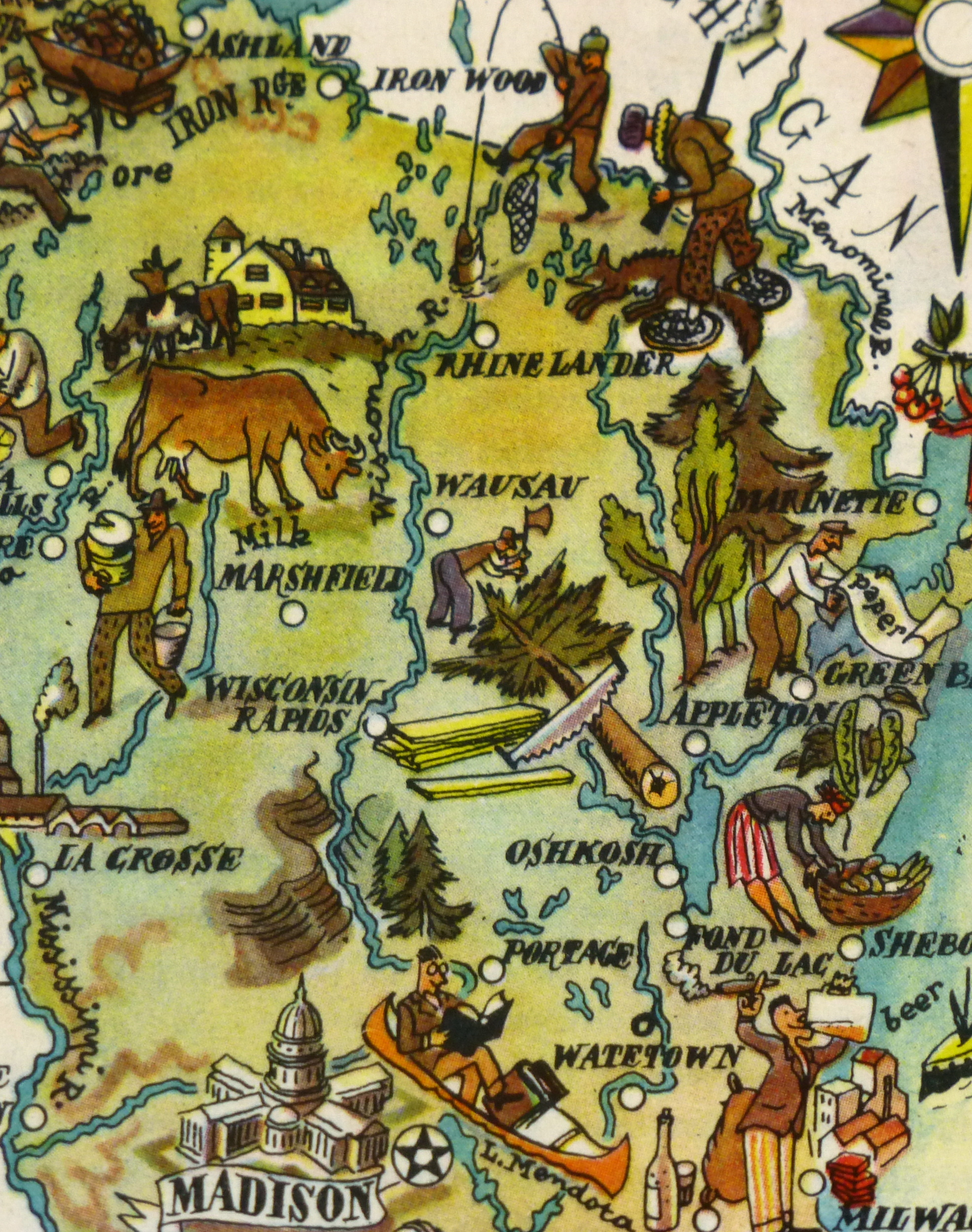 Bright and colorful pictorial map of Wisconsin from 1946. Note many historical and cultural sites depicted in playful designs, adorned with amusing title cartouche.