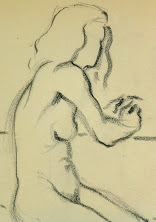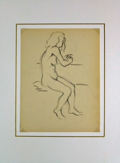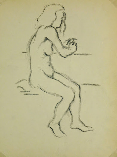 Simple charcoal sketch of a nude female figure seated at a table by Belgian artist Jean Ernst, circa 1930.