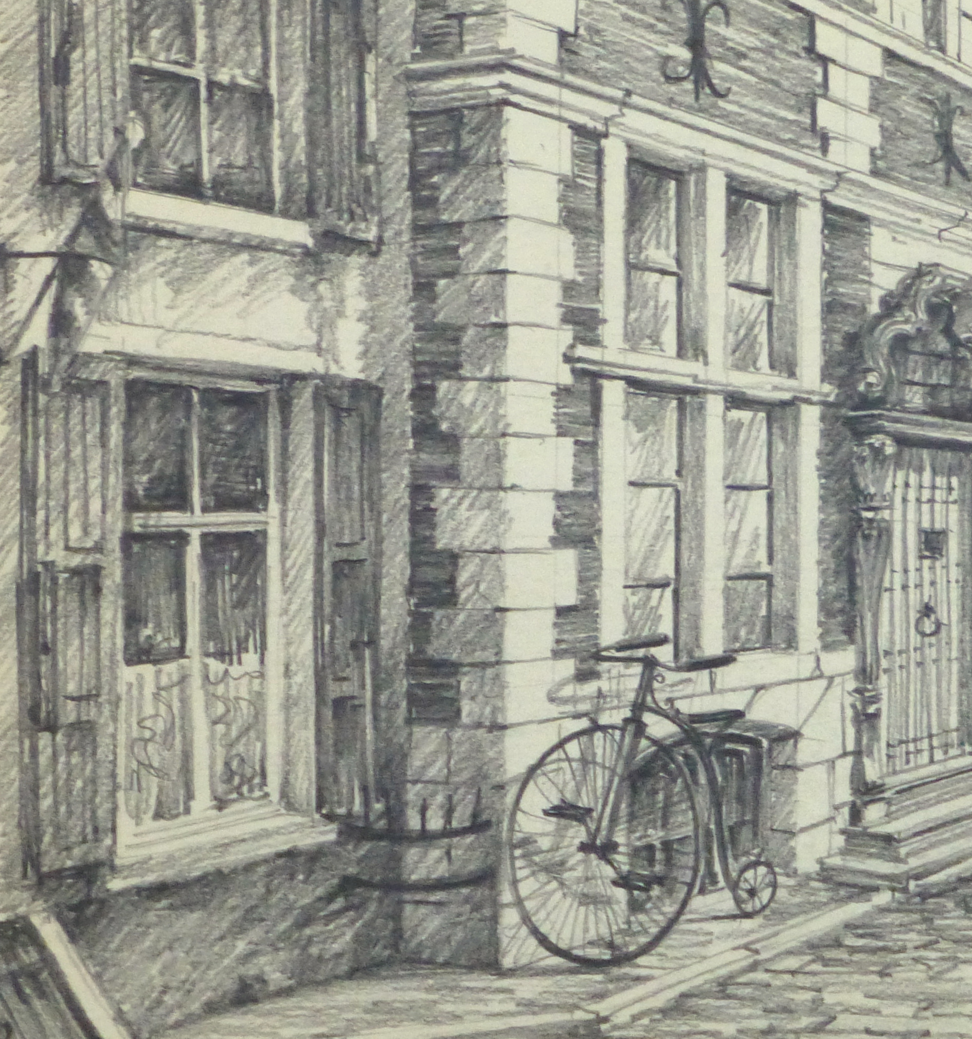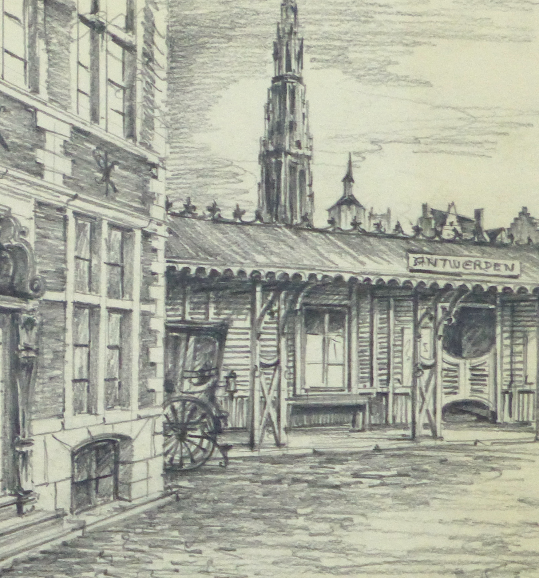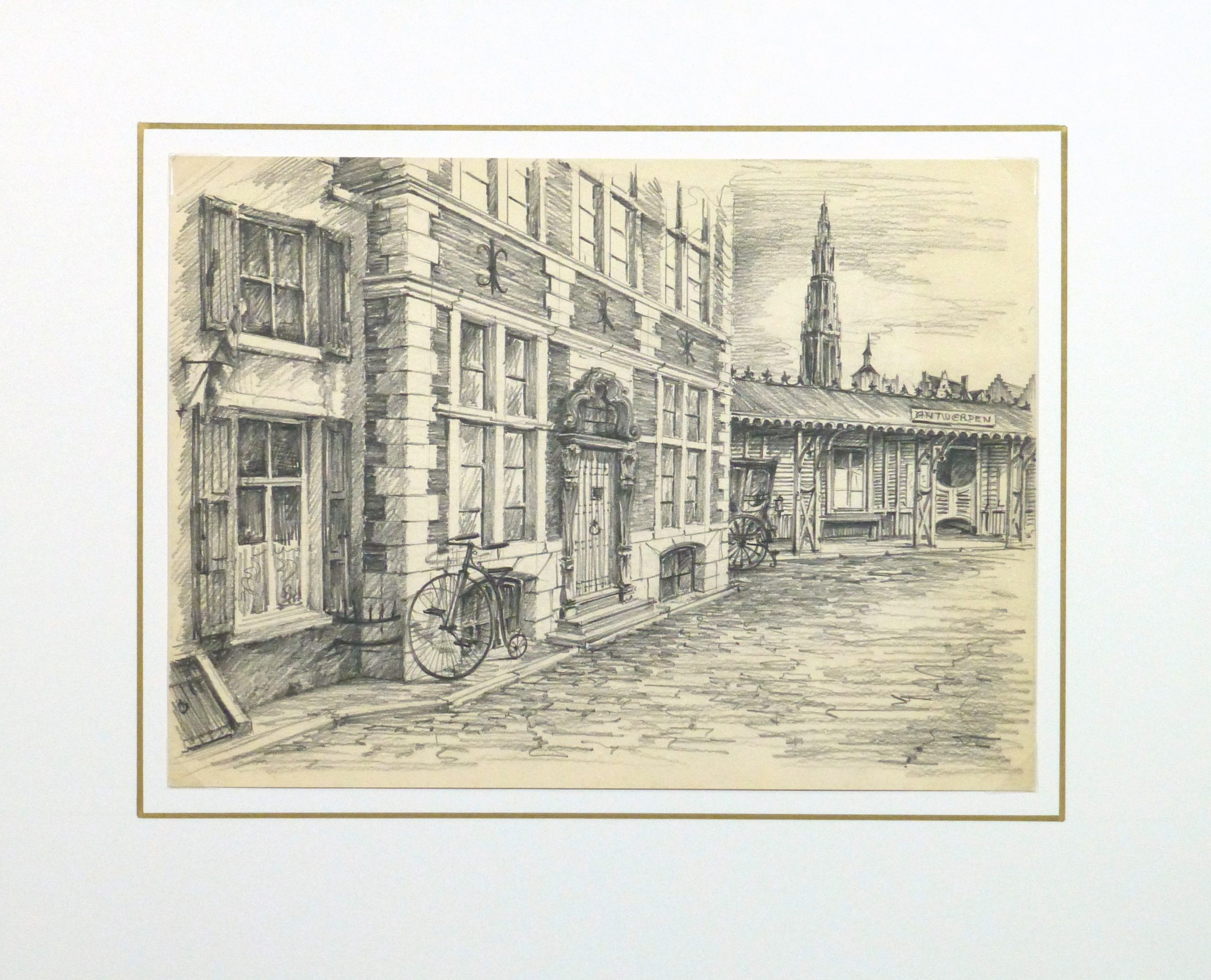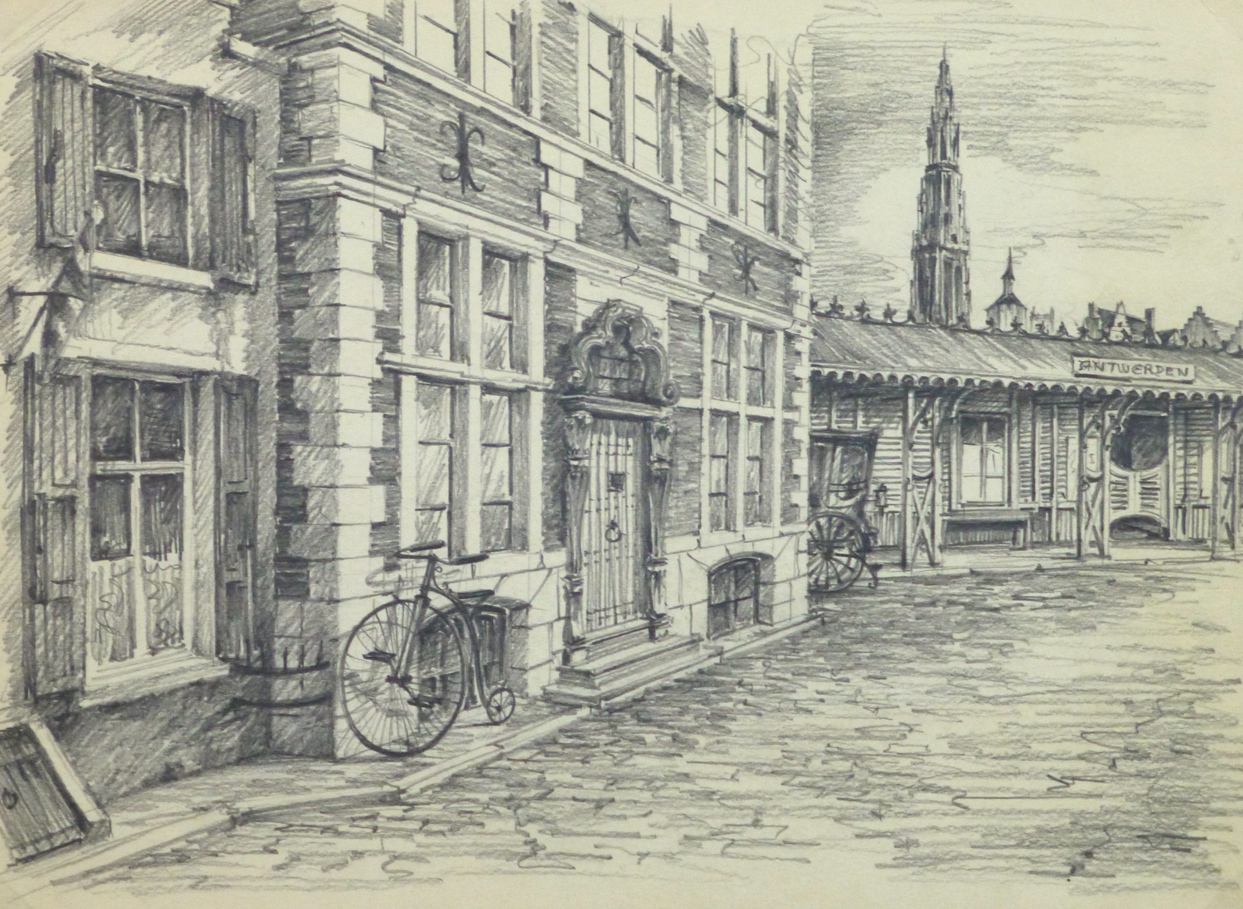 Charming pencil drawing of a small street in Antwerp, Belgium, circa 1950.