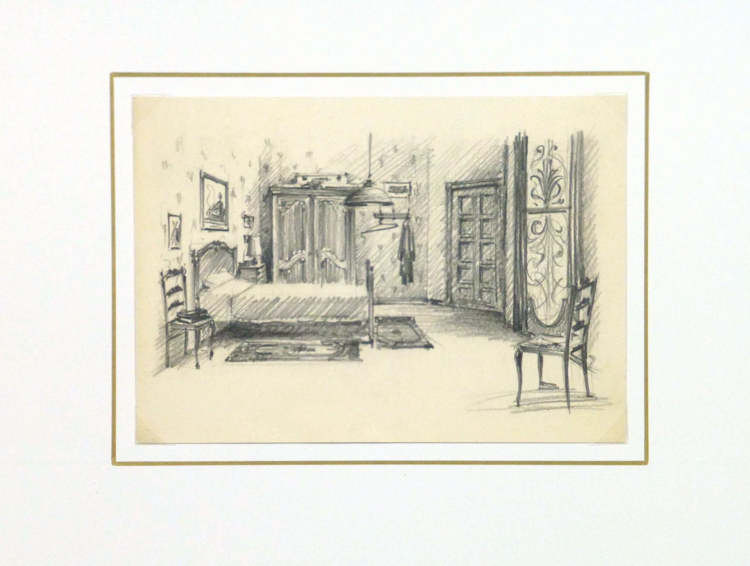 Charming pencil drawing of an elegantly decorated bedroom, circa 1950.