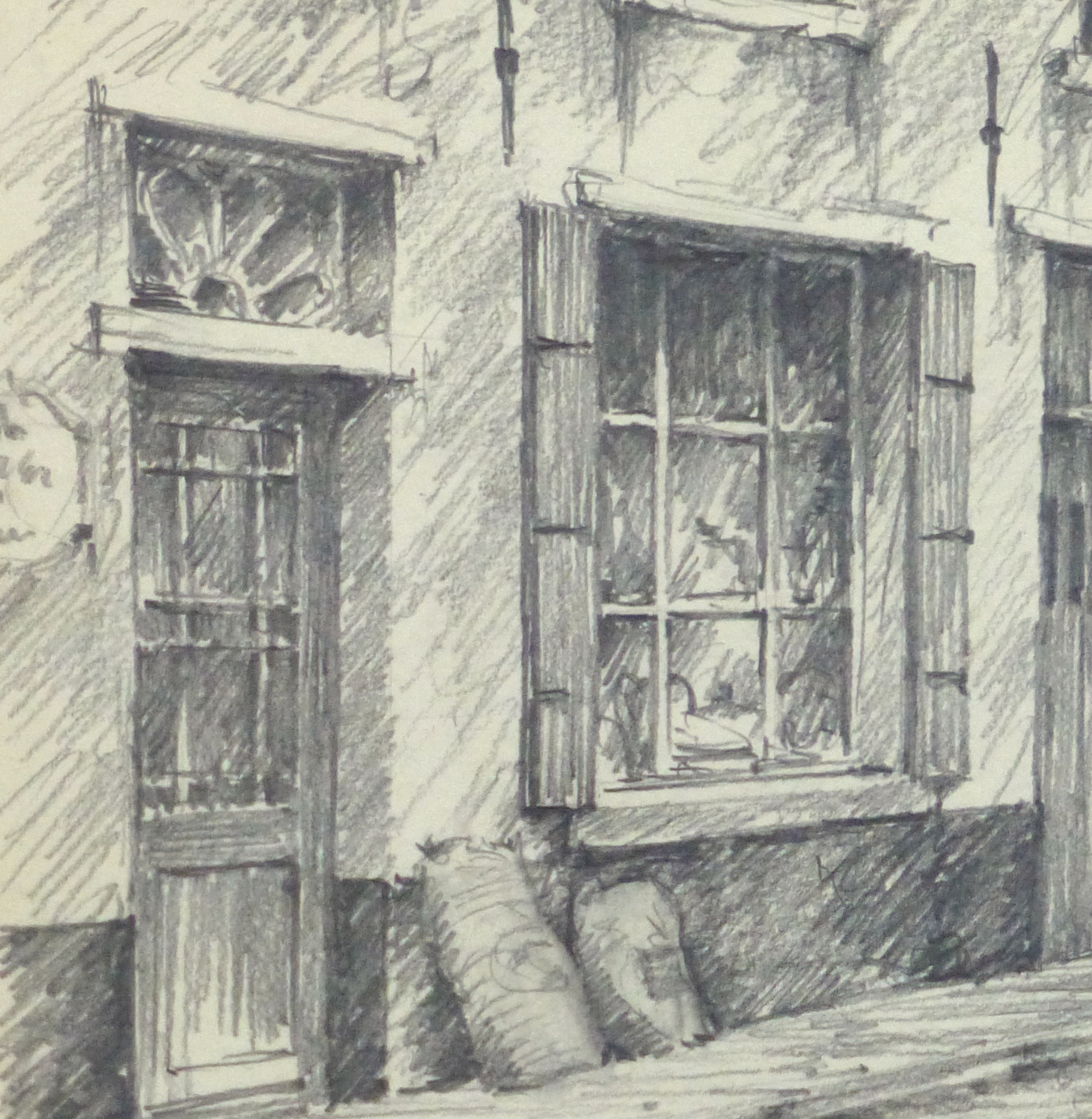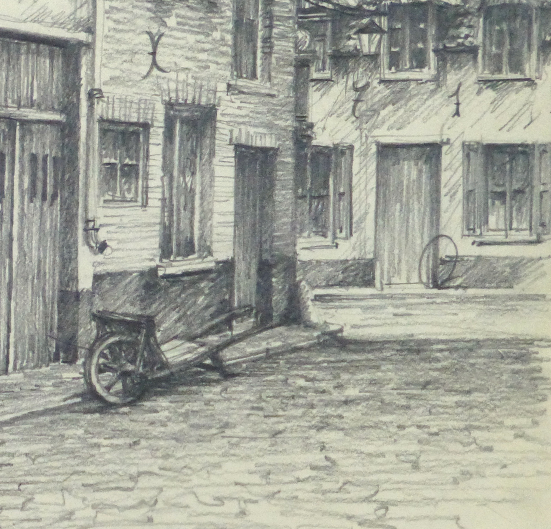 Inviting pencil sketch of a small city street lined with shops, circa 1950.