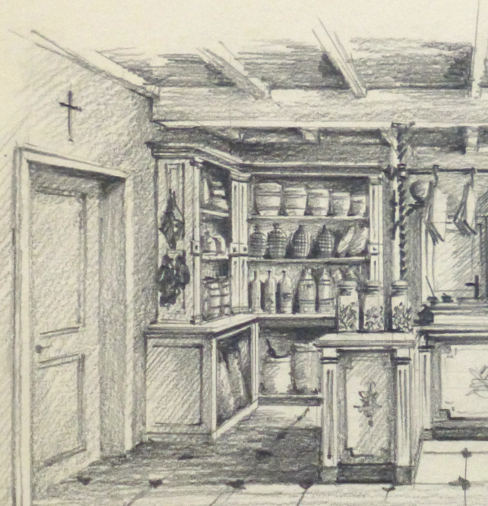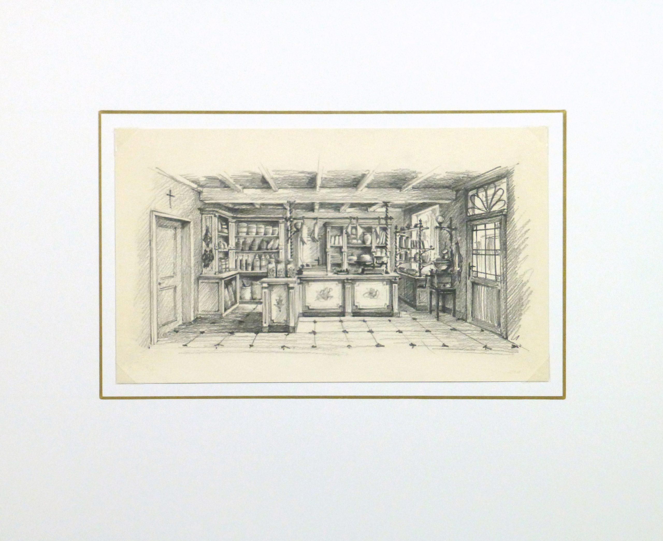 Nicely detailed pencil drawing of a small and tastefully decorated general store, circa 1950. Unsigned.