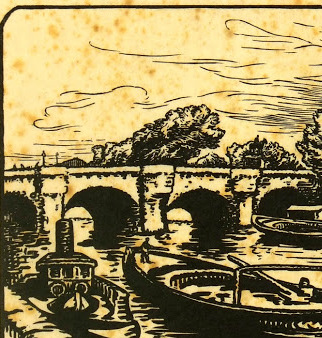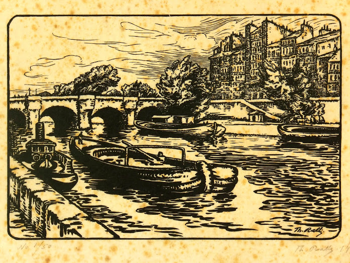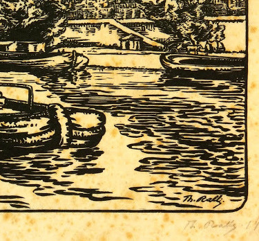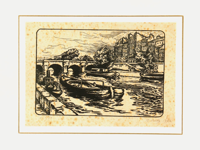 Original woodcut of the river Seine cutting through Paris with barges and bridge, 1922. Signed and dated in pencil lower right.