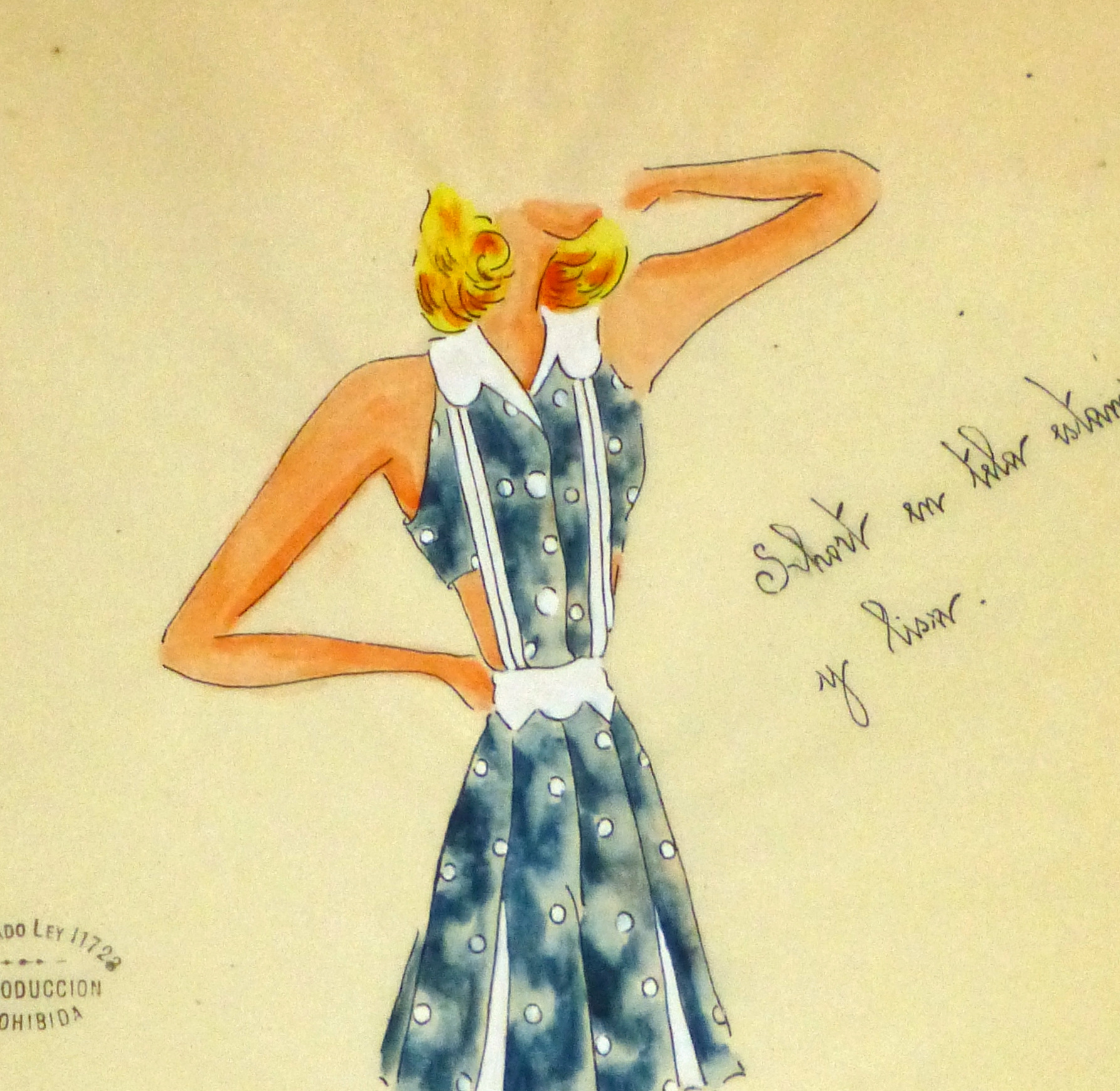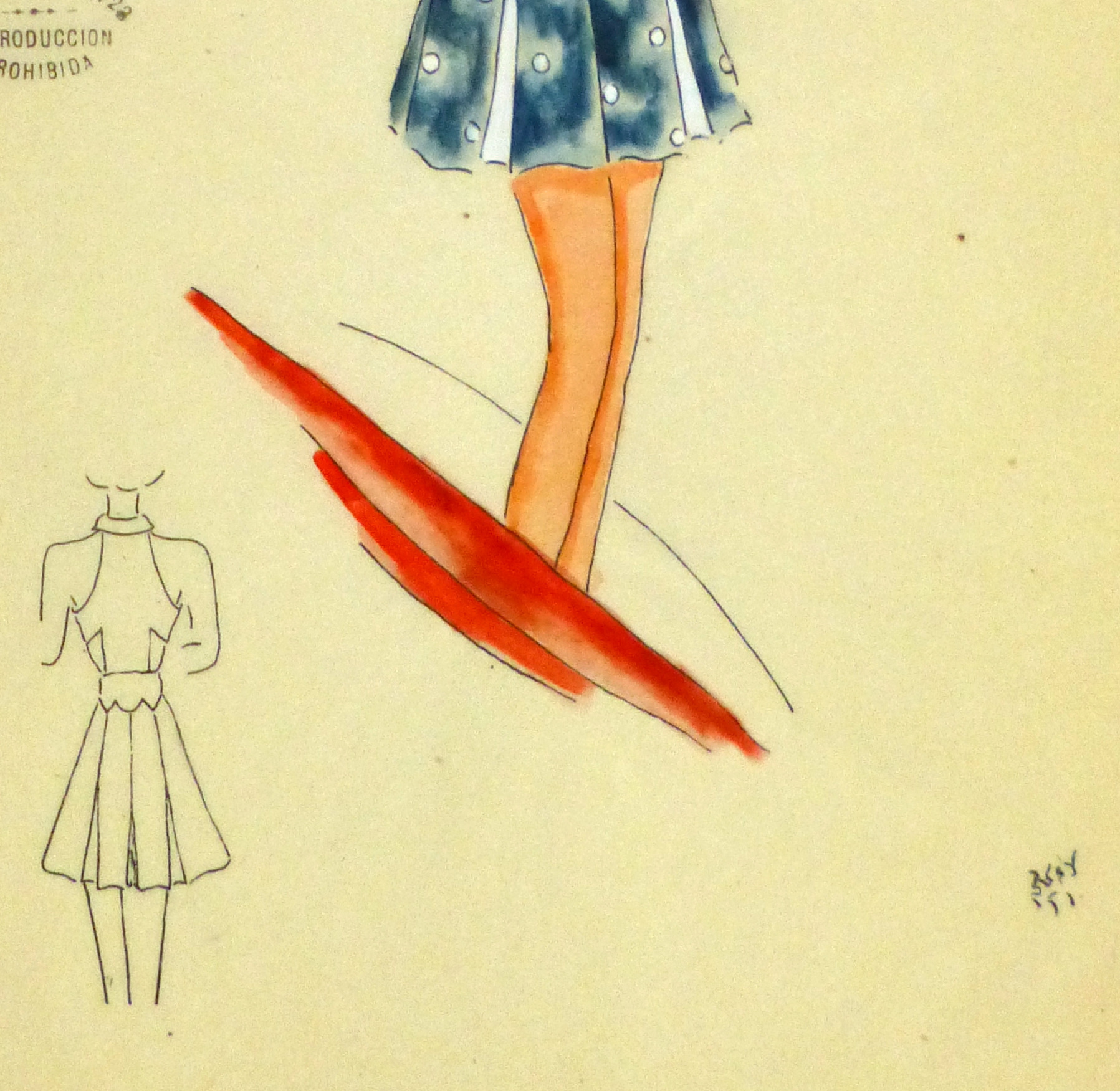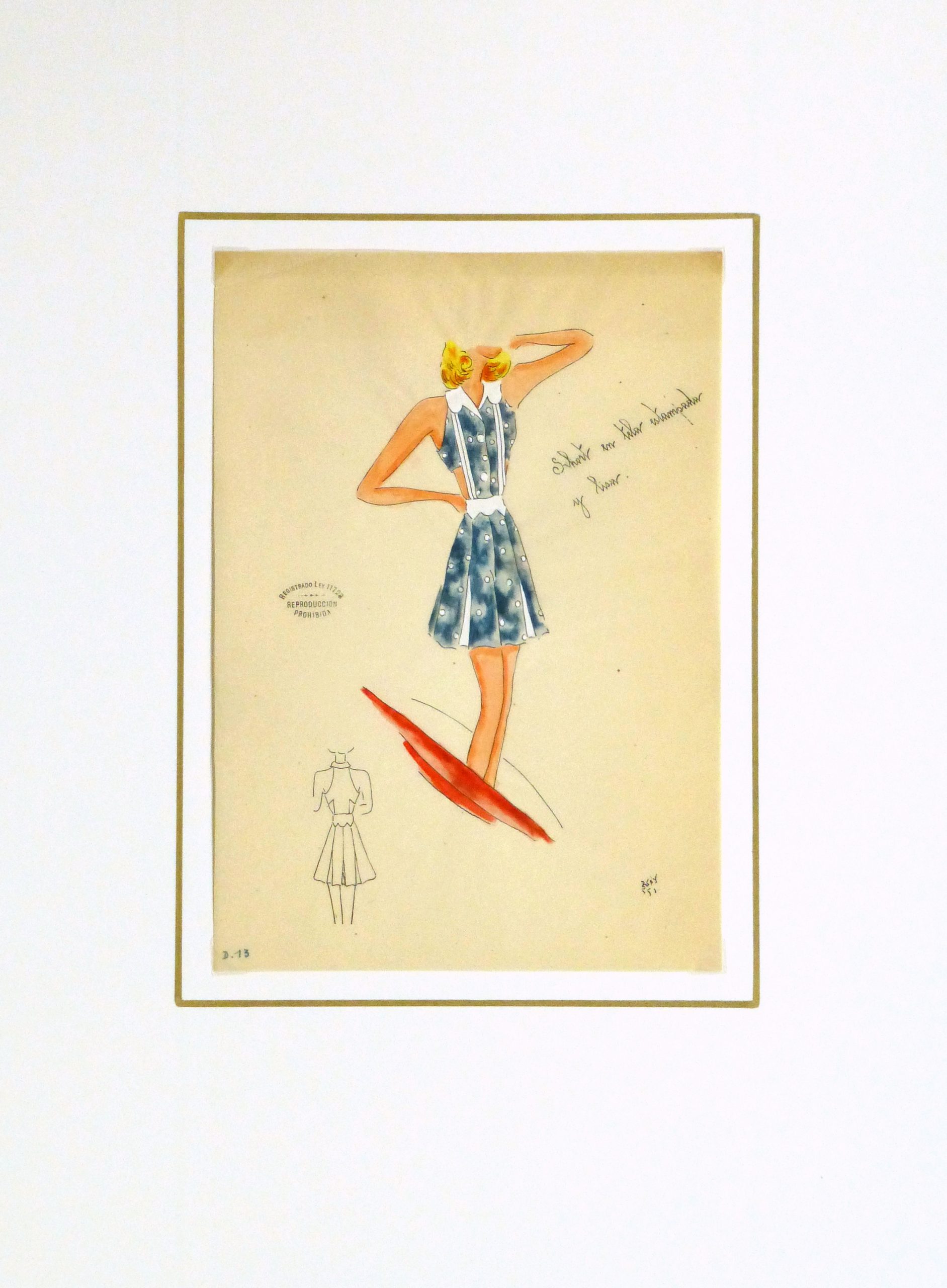 Charming ink and gouache Argentine fashion sketch of a polka dot sun dress in blue, circa 1950. Signed  lower right.