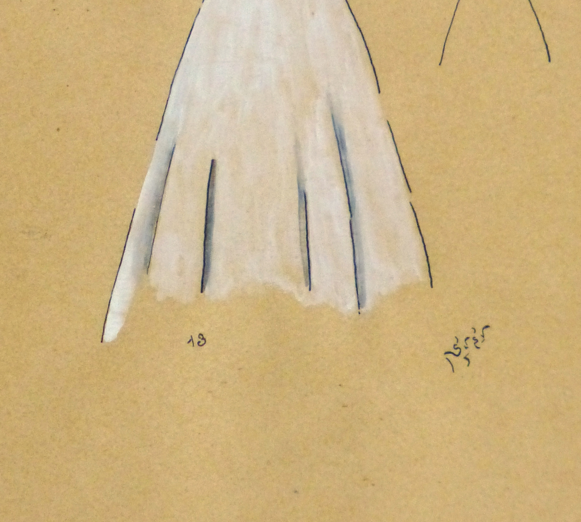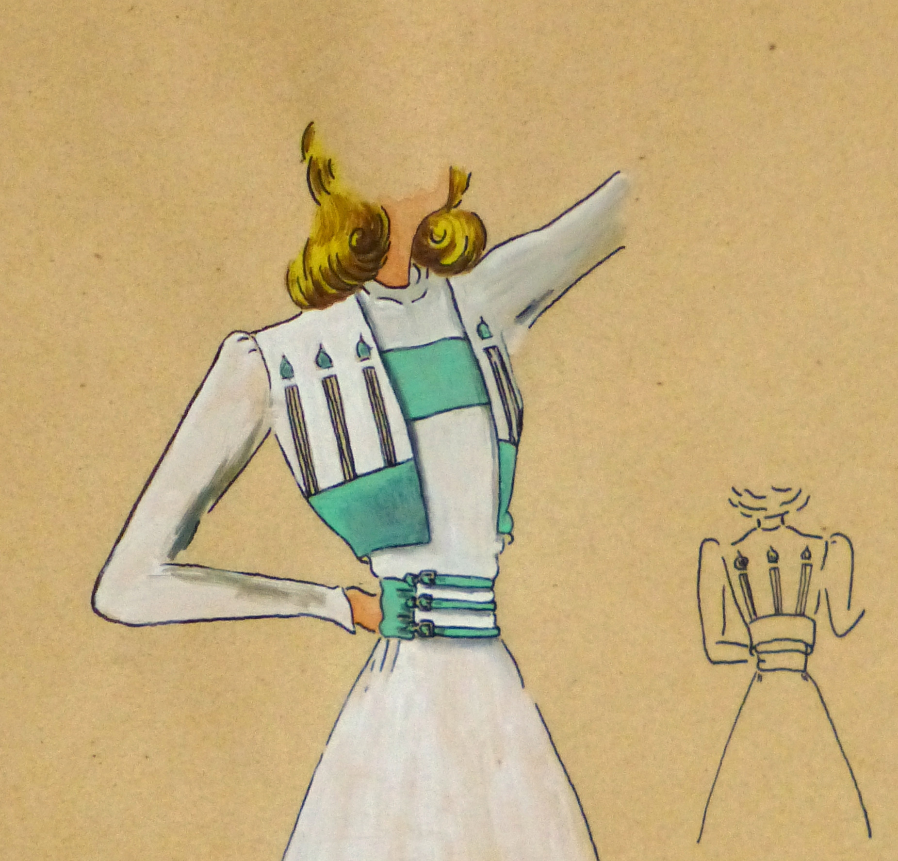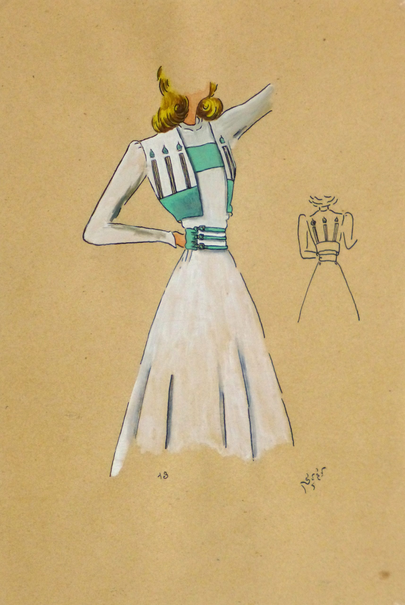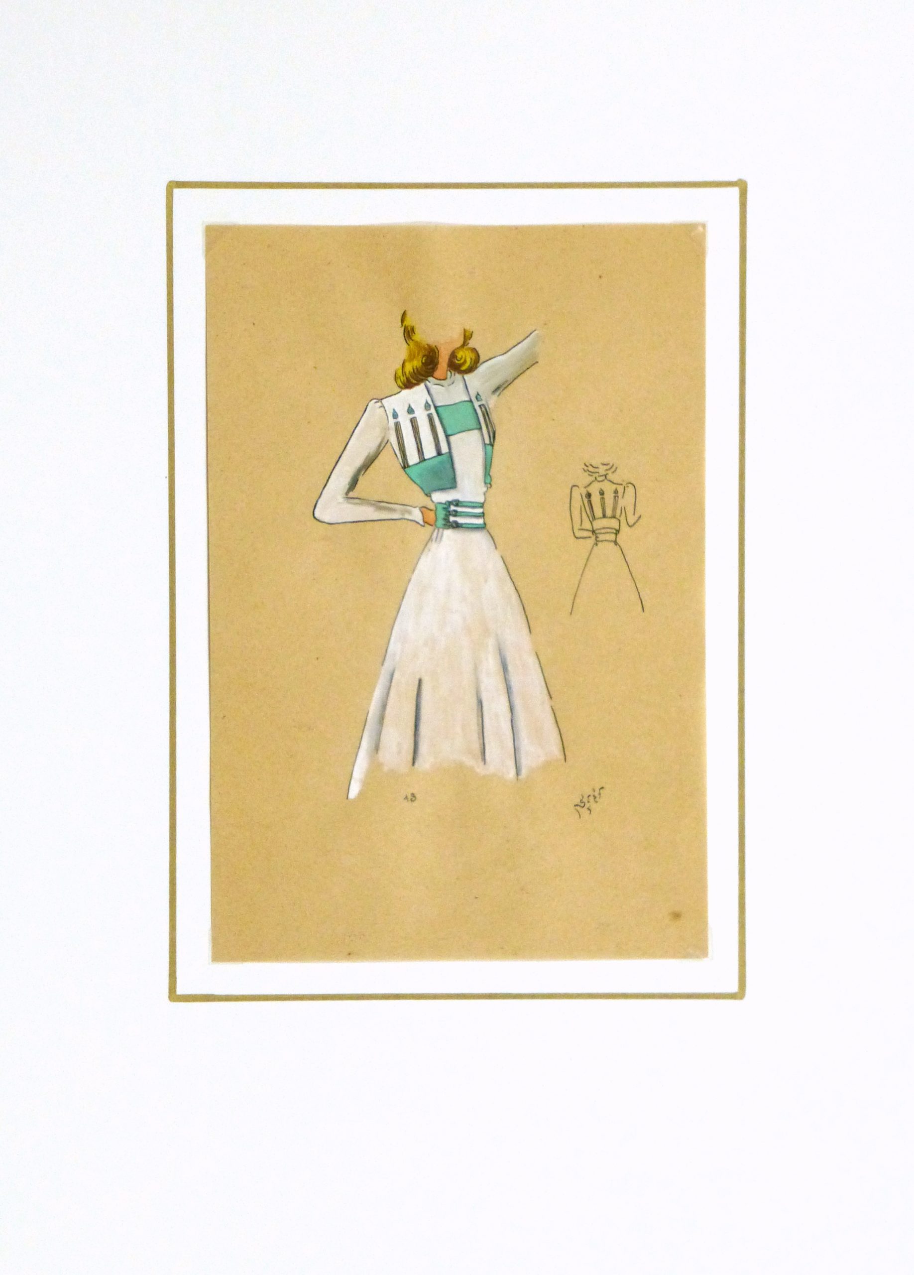 Charming ink and gouache Argentine fashion sketch of a stylish white dress with aqua accents and matching bolero jacket, circa 1950. Signed lower right.