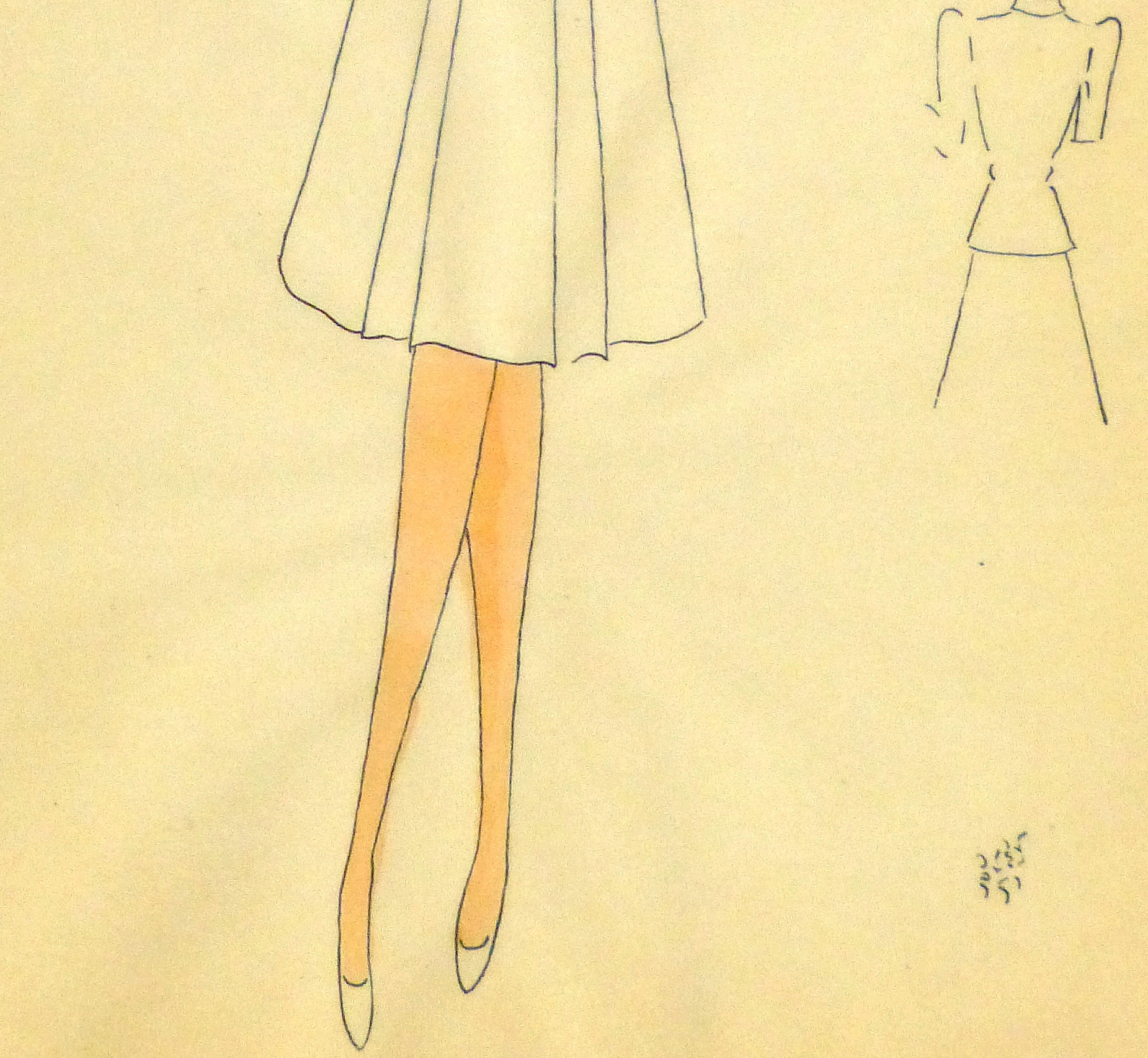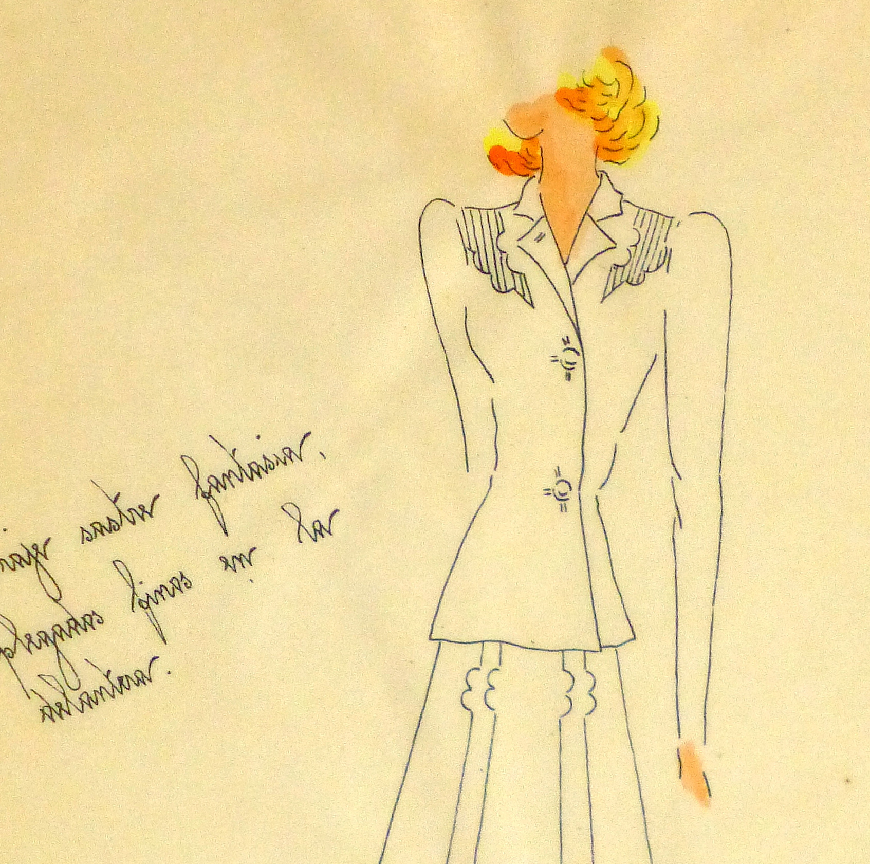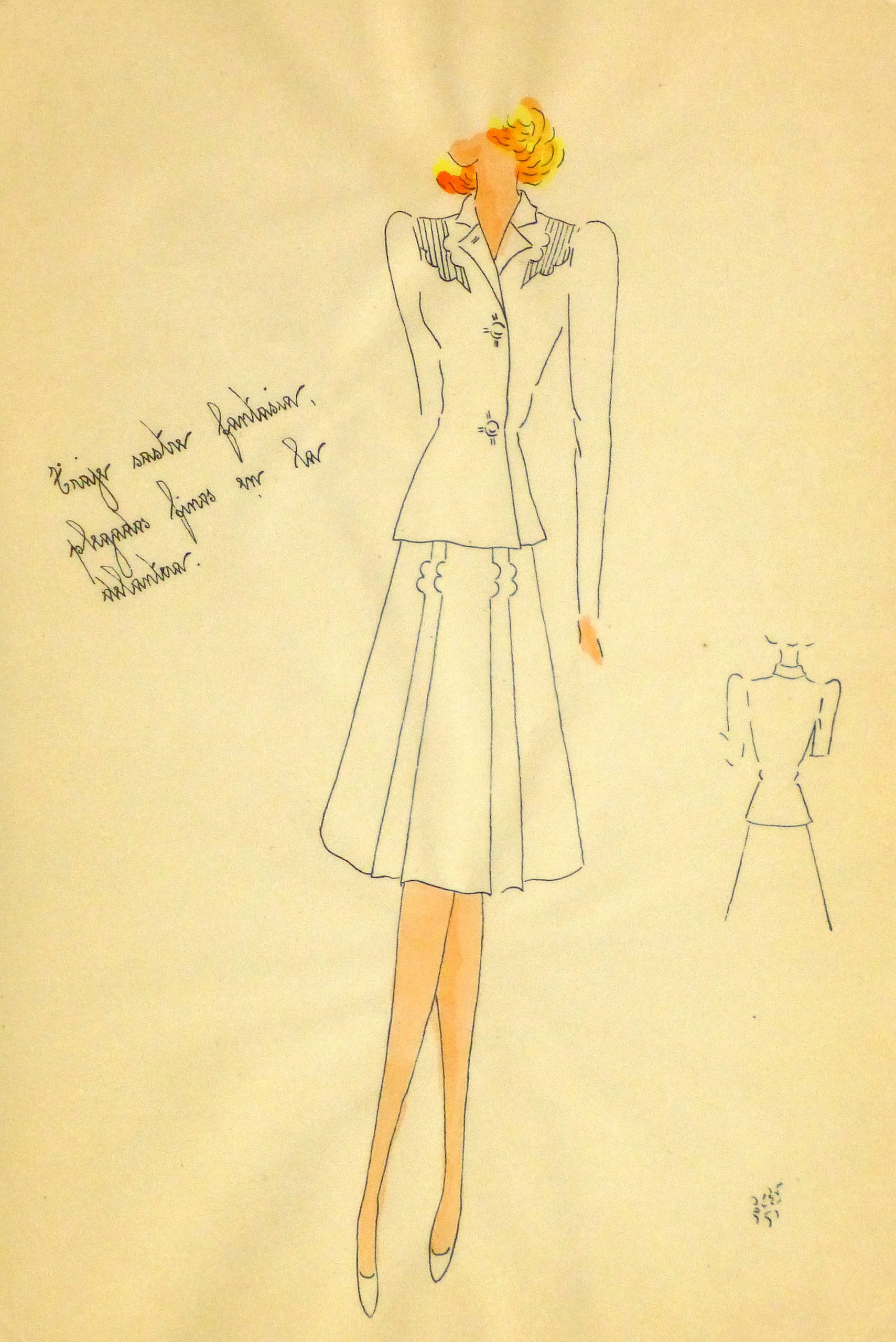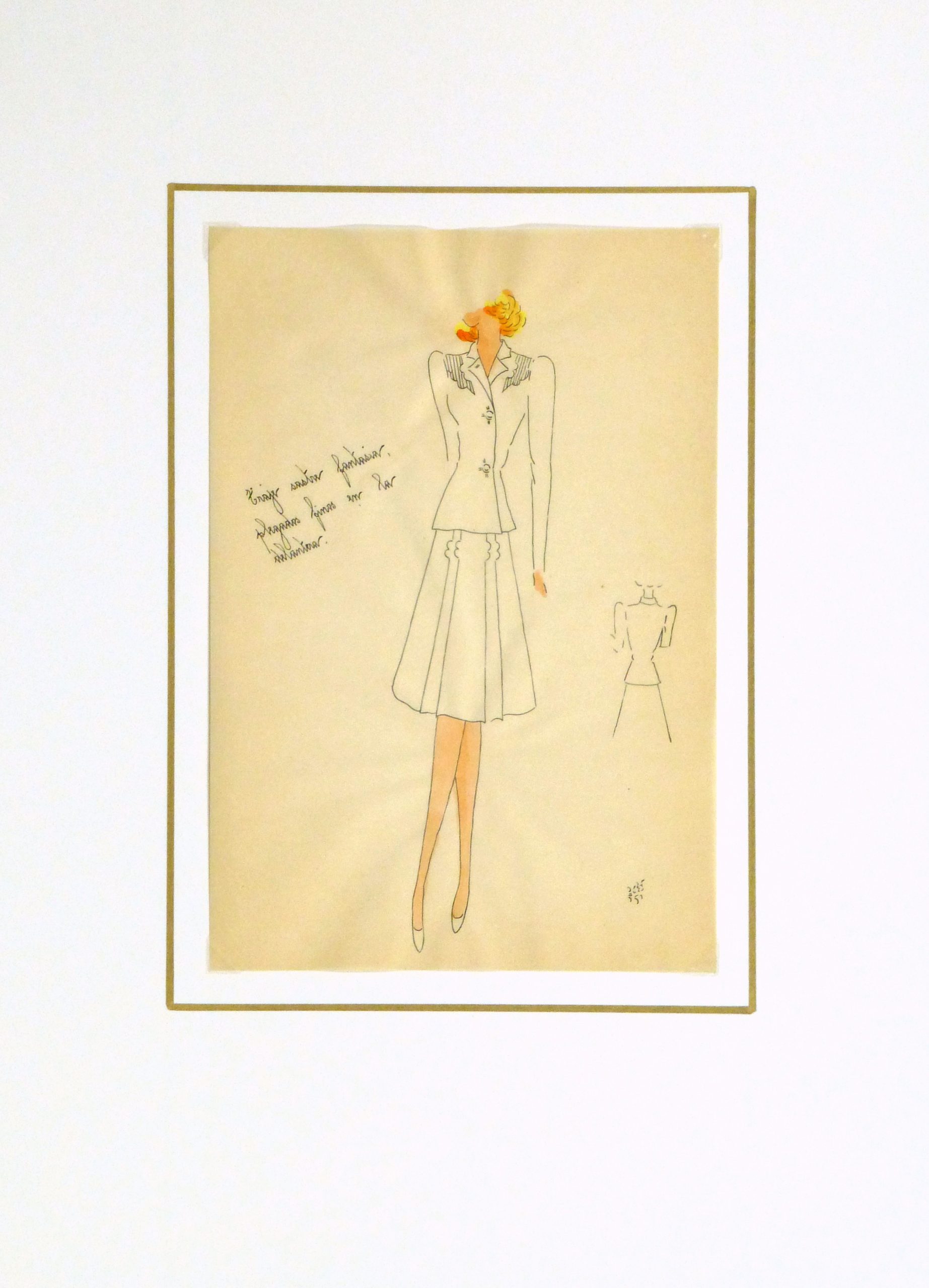 Charming ink and gouache Argentine fashion sketch of a long sleeve dress suit with shoulder accents, circa 1950. Signed lower right.