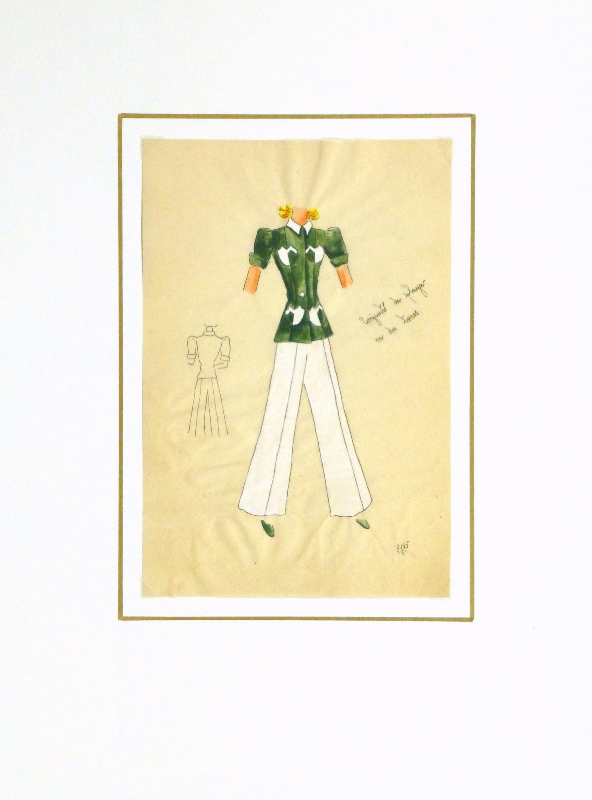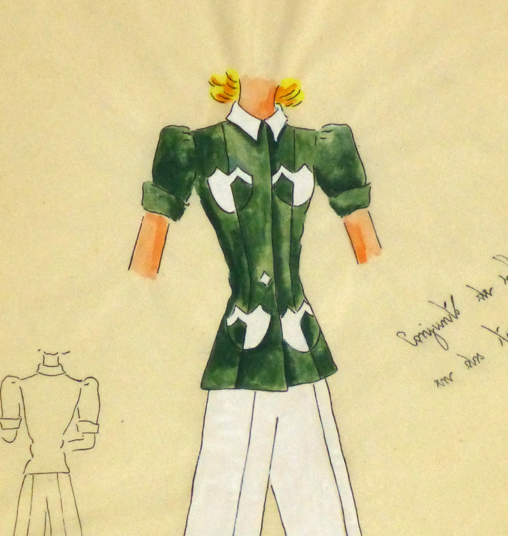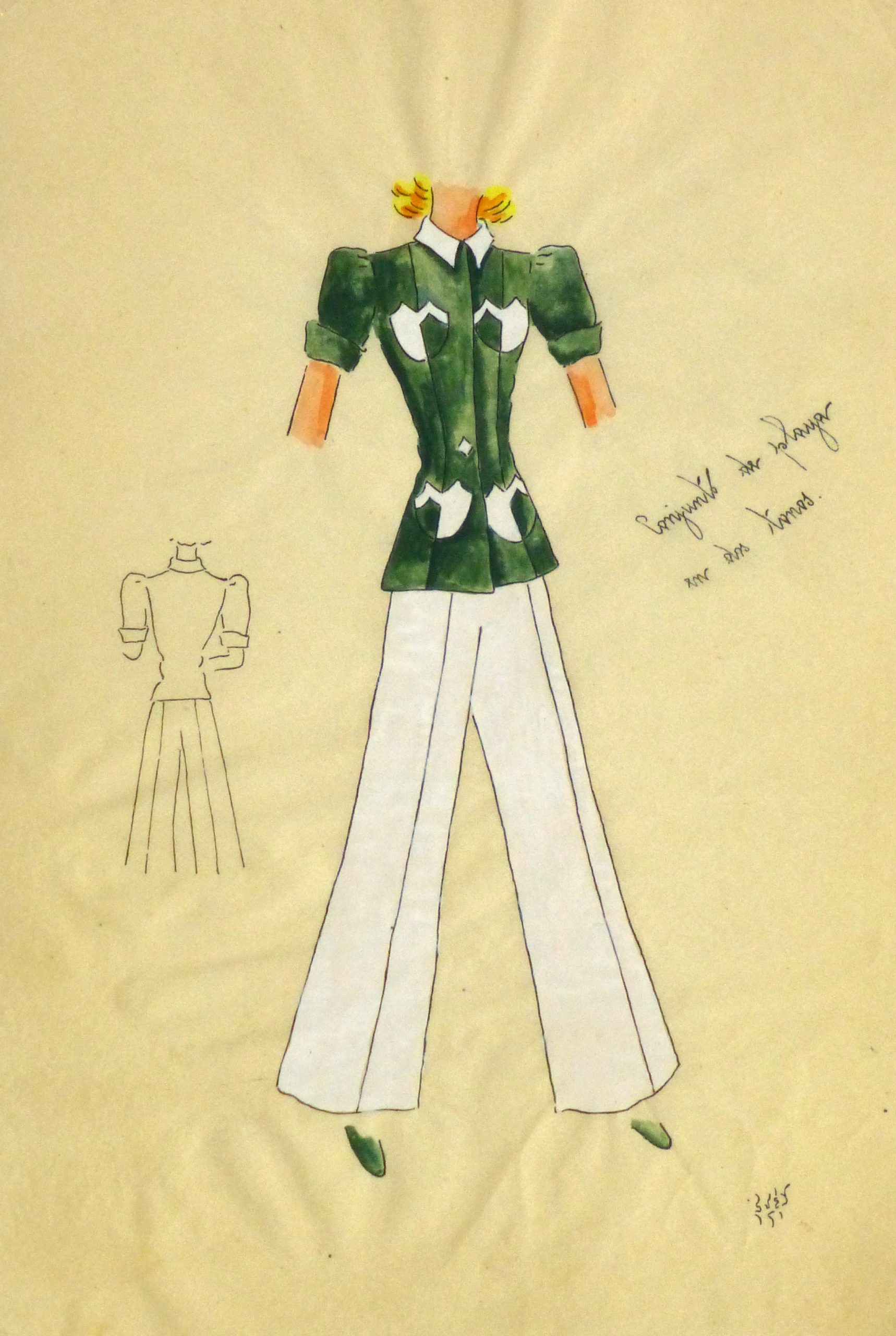 Charming ink and gouache Argentine fashion sketch of a fitted green blouse accented with four pockets and paired with white slacks, circa 1950. Signed lower right.