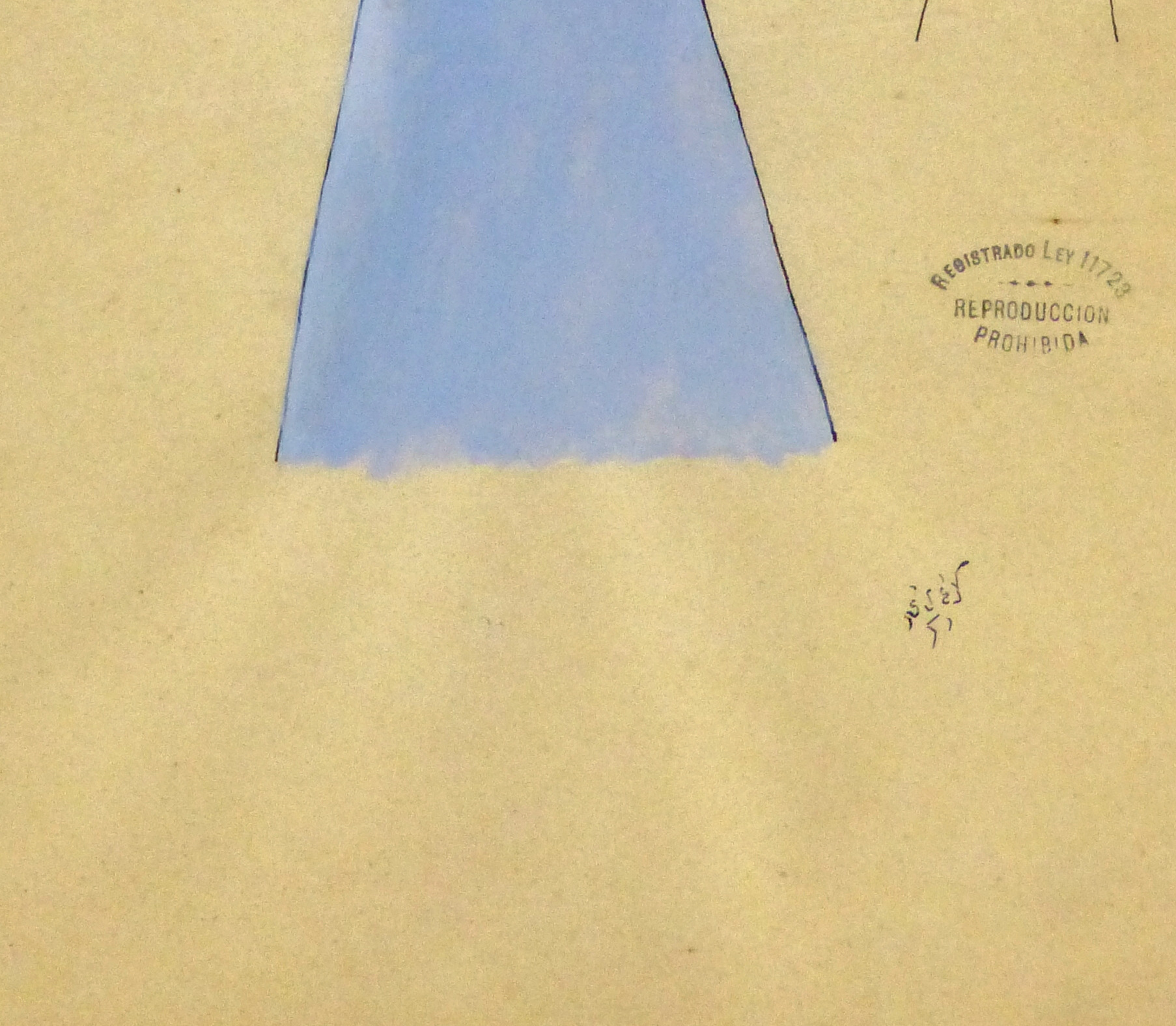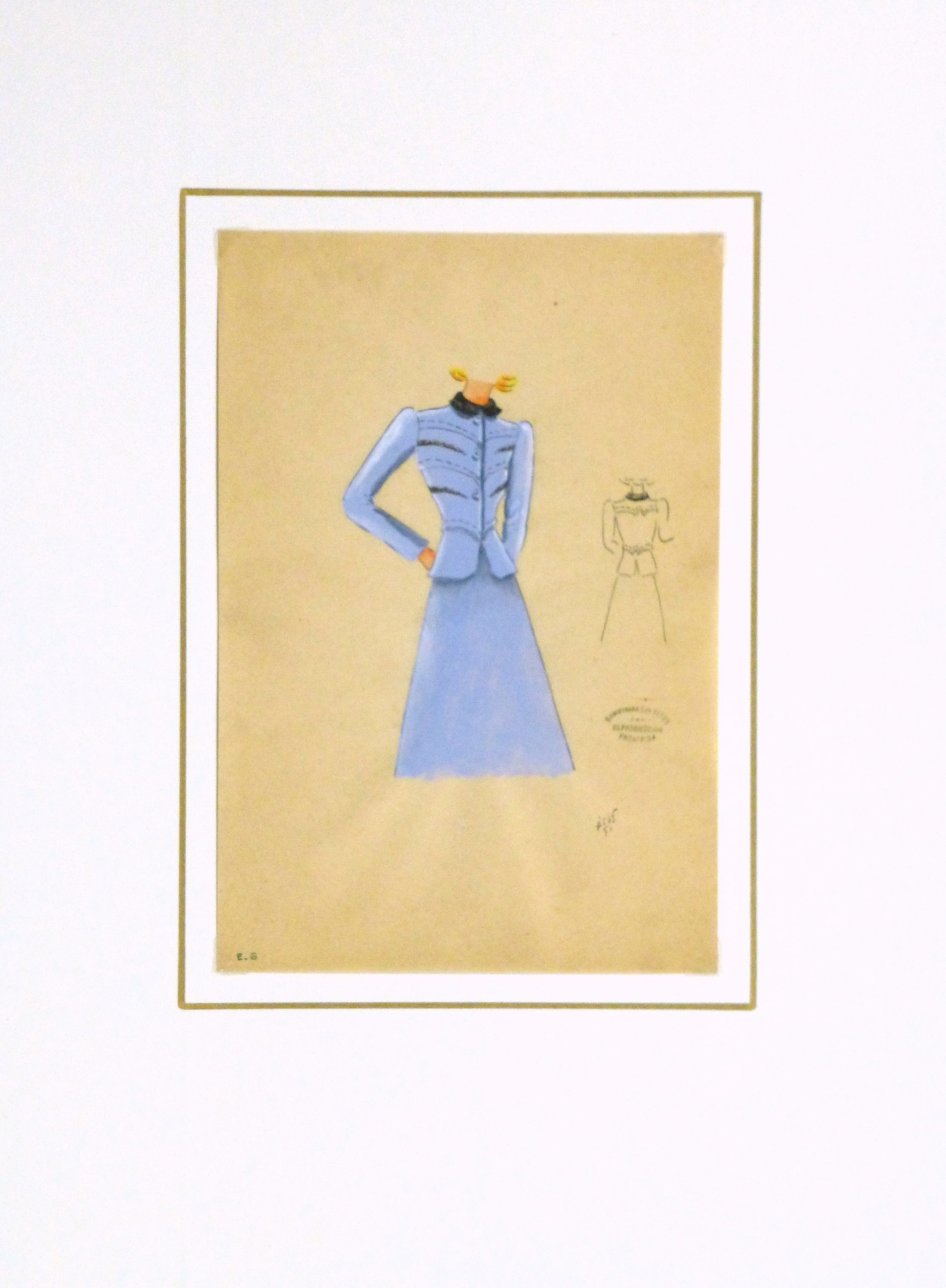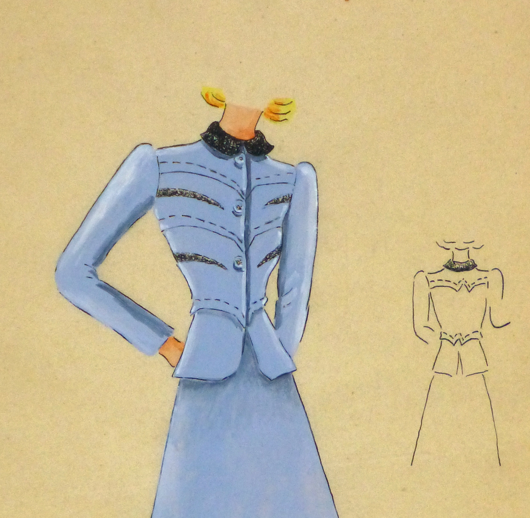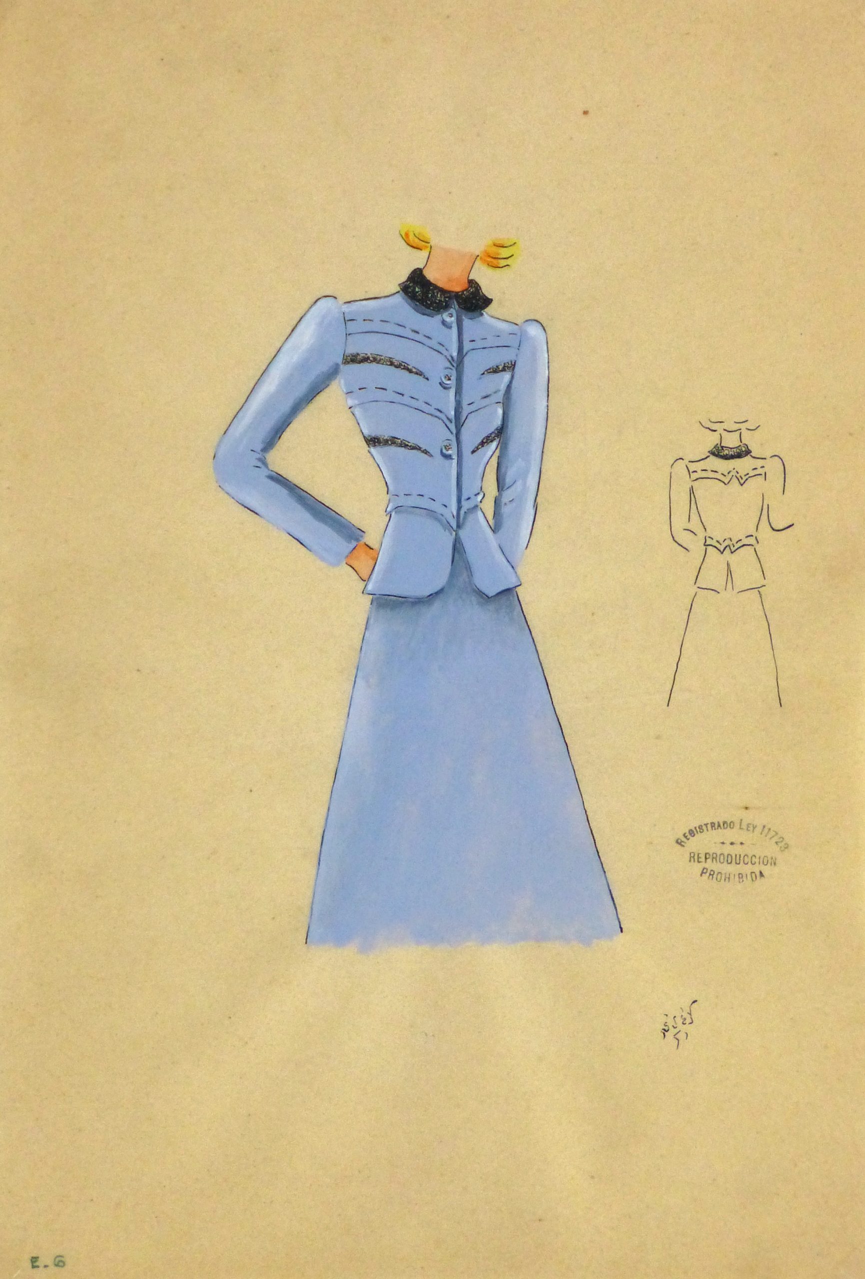 Charming ink and gouache Argentine fashion sketch of a long sleeved dress suit in periwinkle blue, circa 1950. Signed  lower right.
