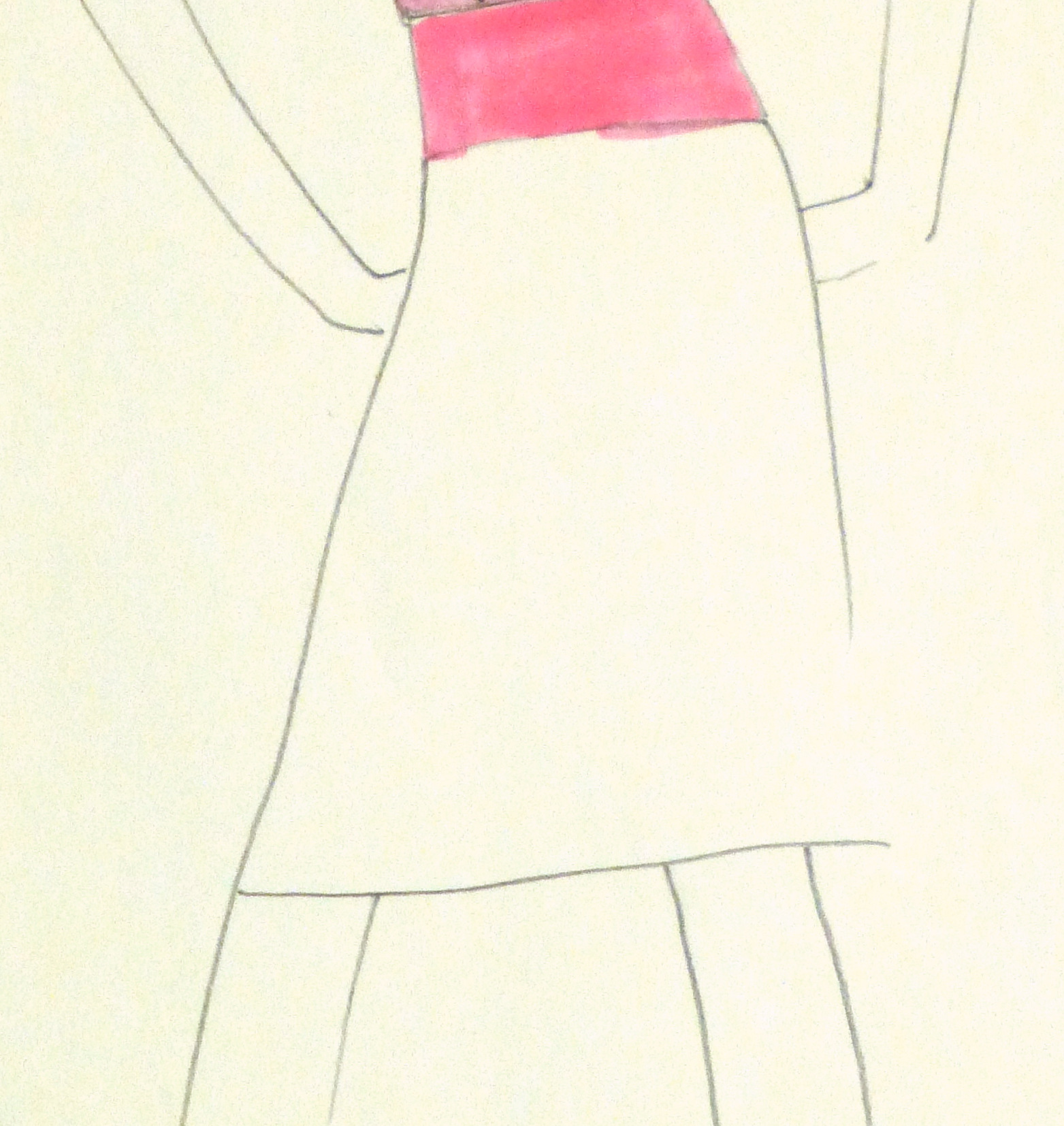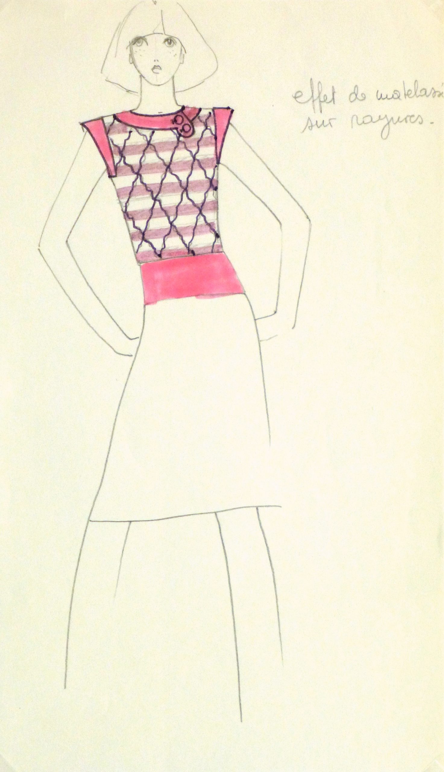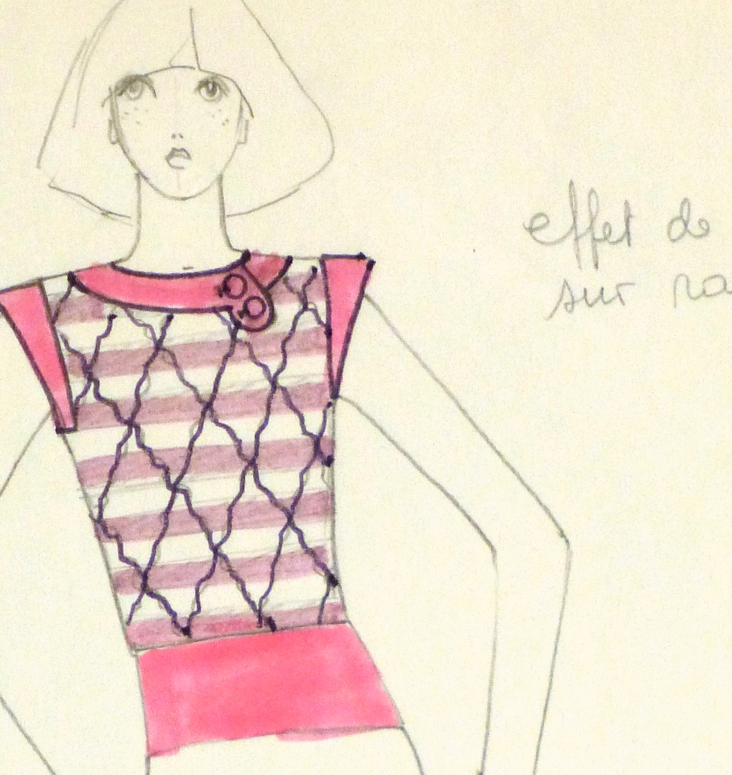 Vintage ink and pencil fashion sketch of a flirty short sleeve sweater with a pink print by Balmain Fashion House of Paris, circa 1970.