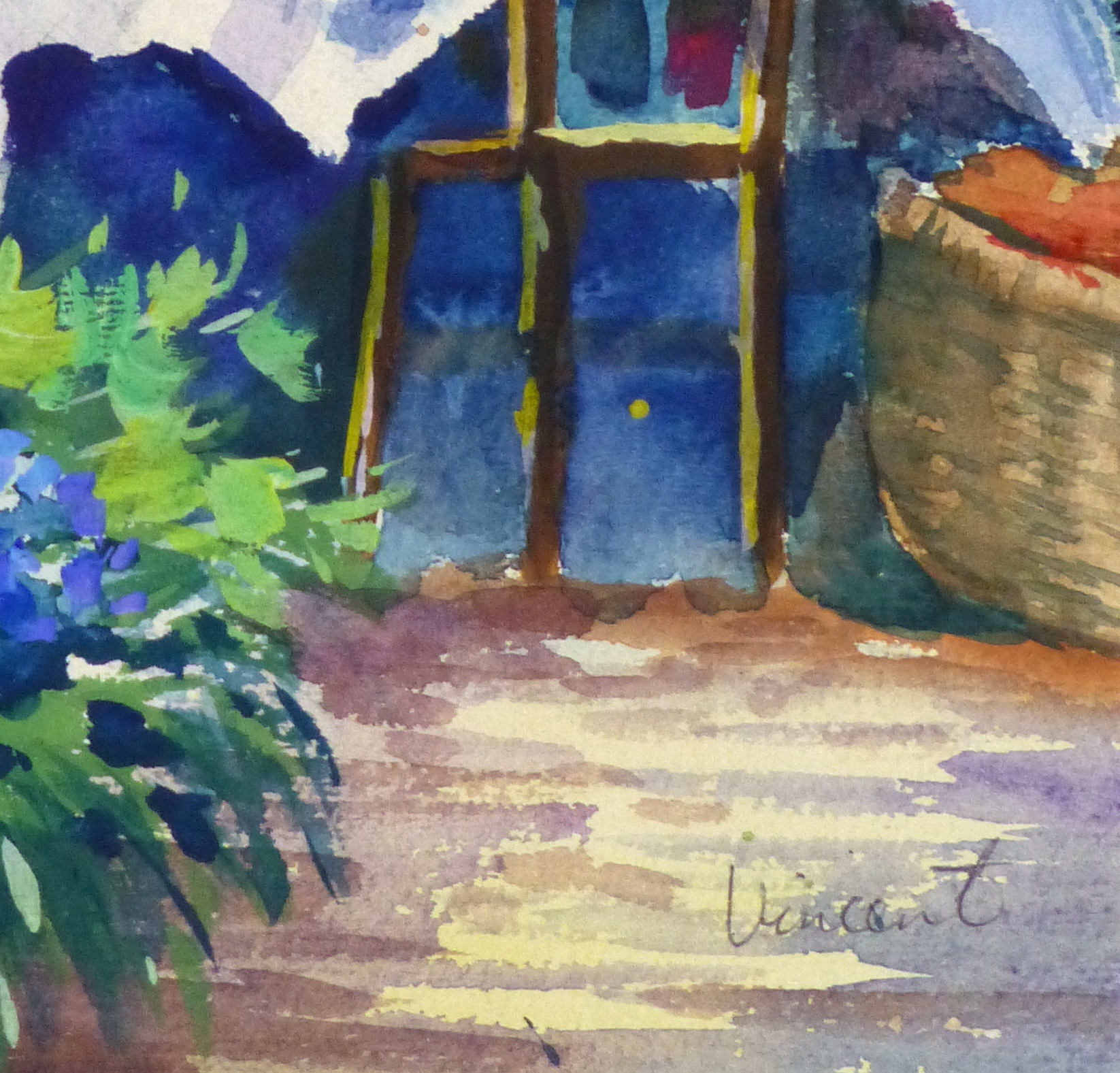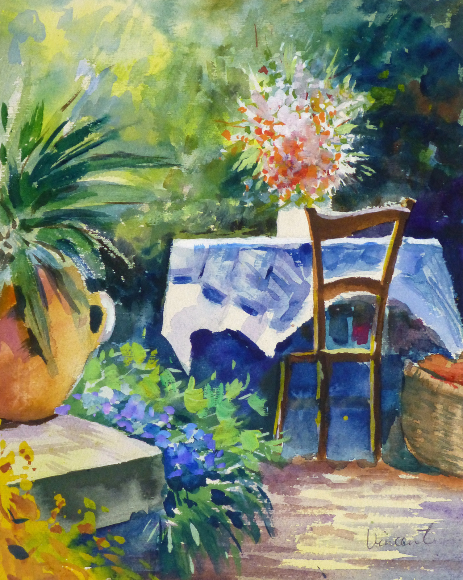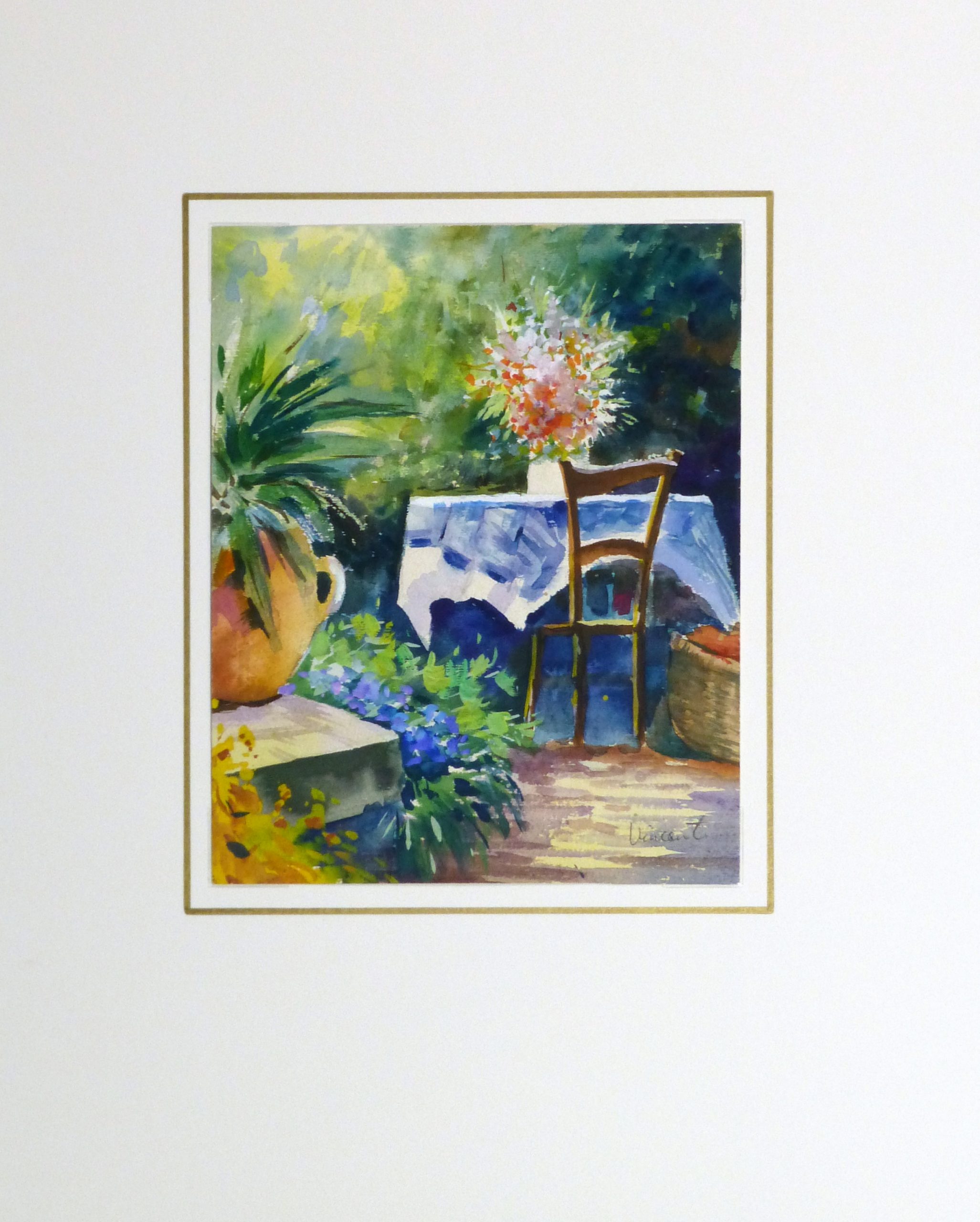 Lovely French watercolor of a small table and chair in a small patio garden, circa 1960. Signed lower right.