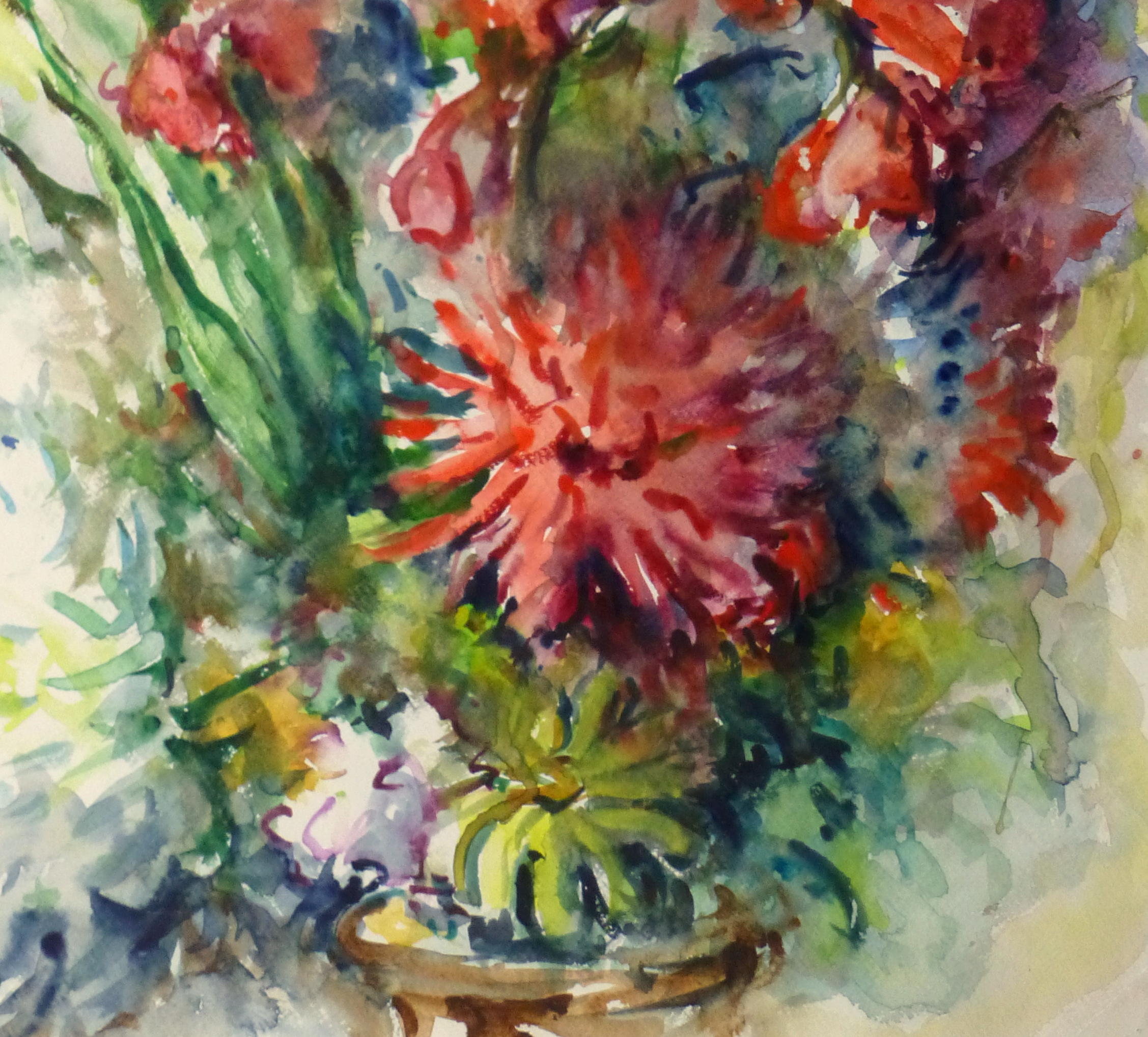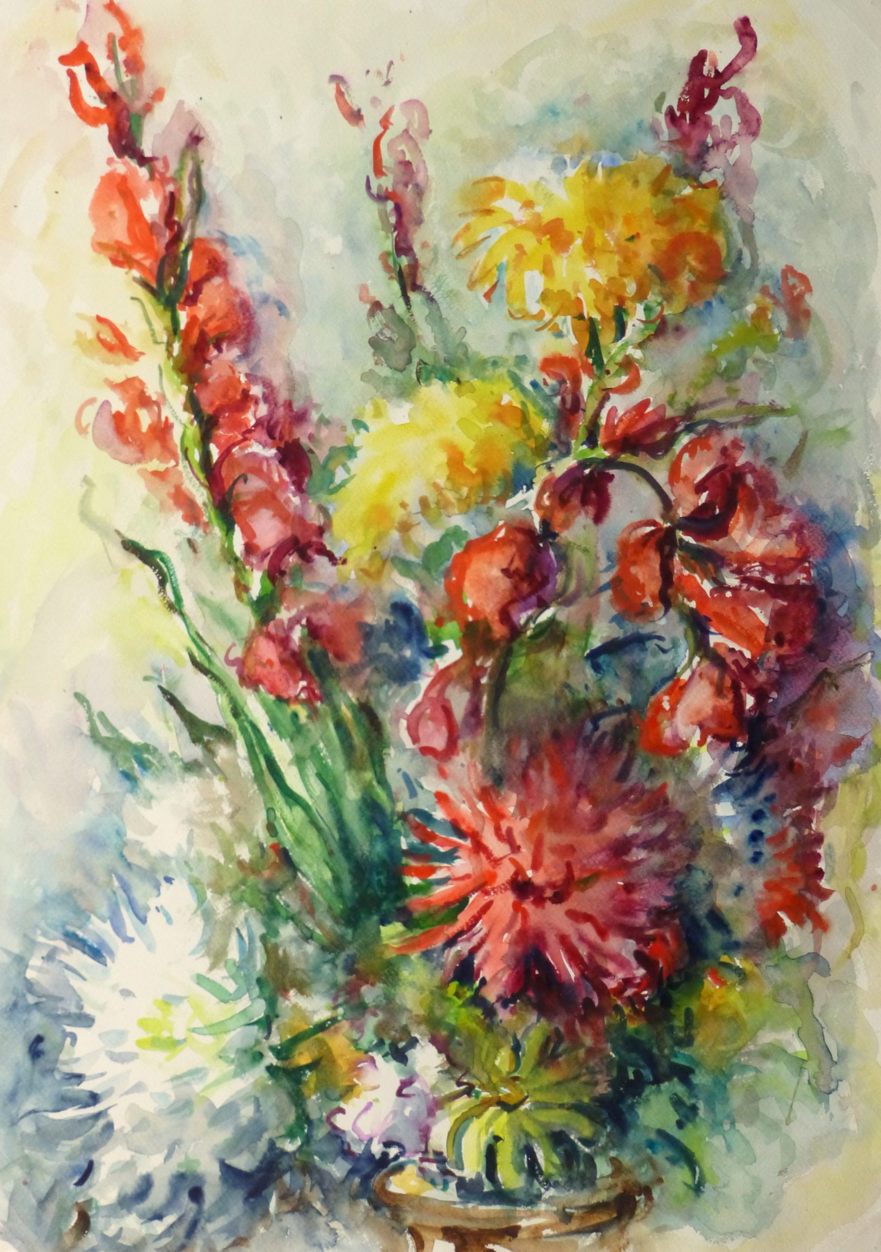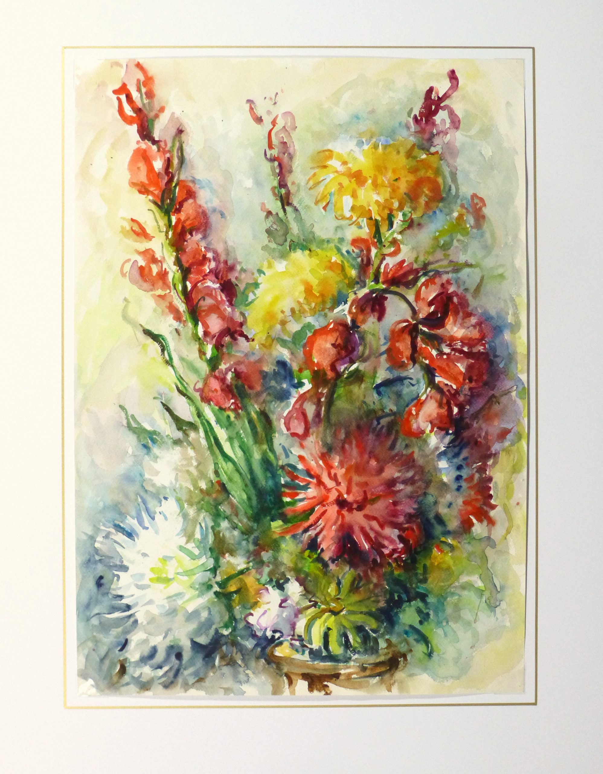 Large and vivid watercolor still-life a colorful spray of flowers in rich hues of red and yellow, circa 1960.