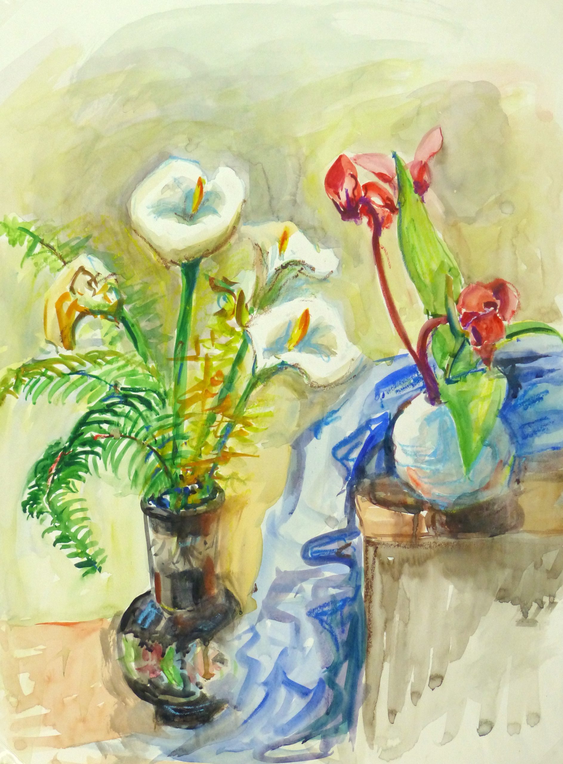 Large and vibrant watercolor still-life of a bouquet of white calla lilies coupled with a small orchid with red blooms, circa 1960.