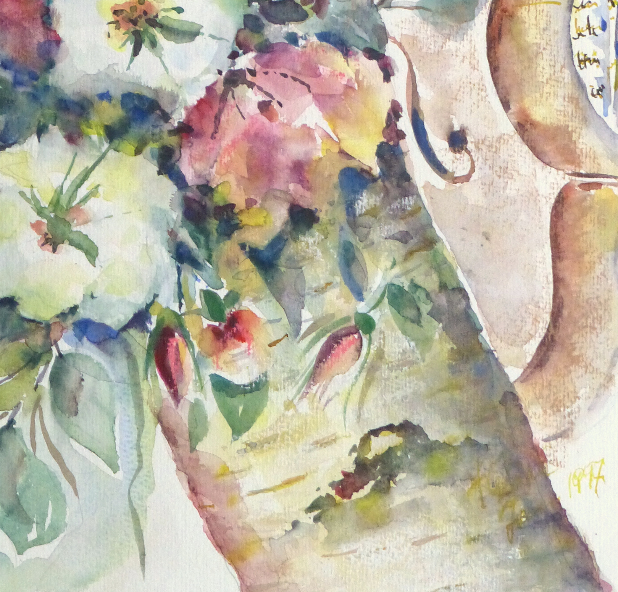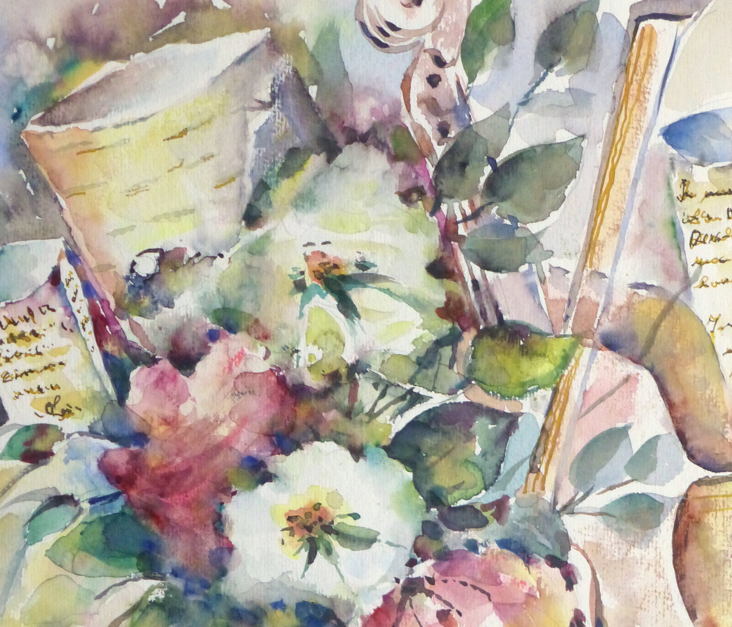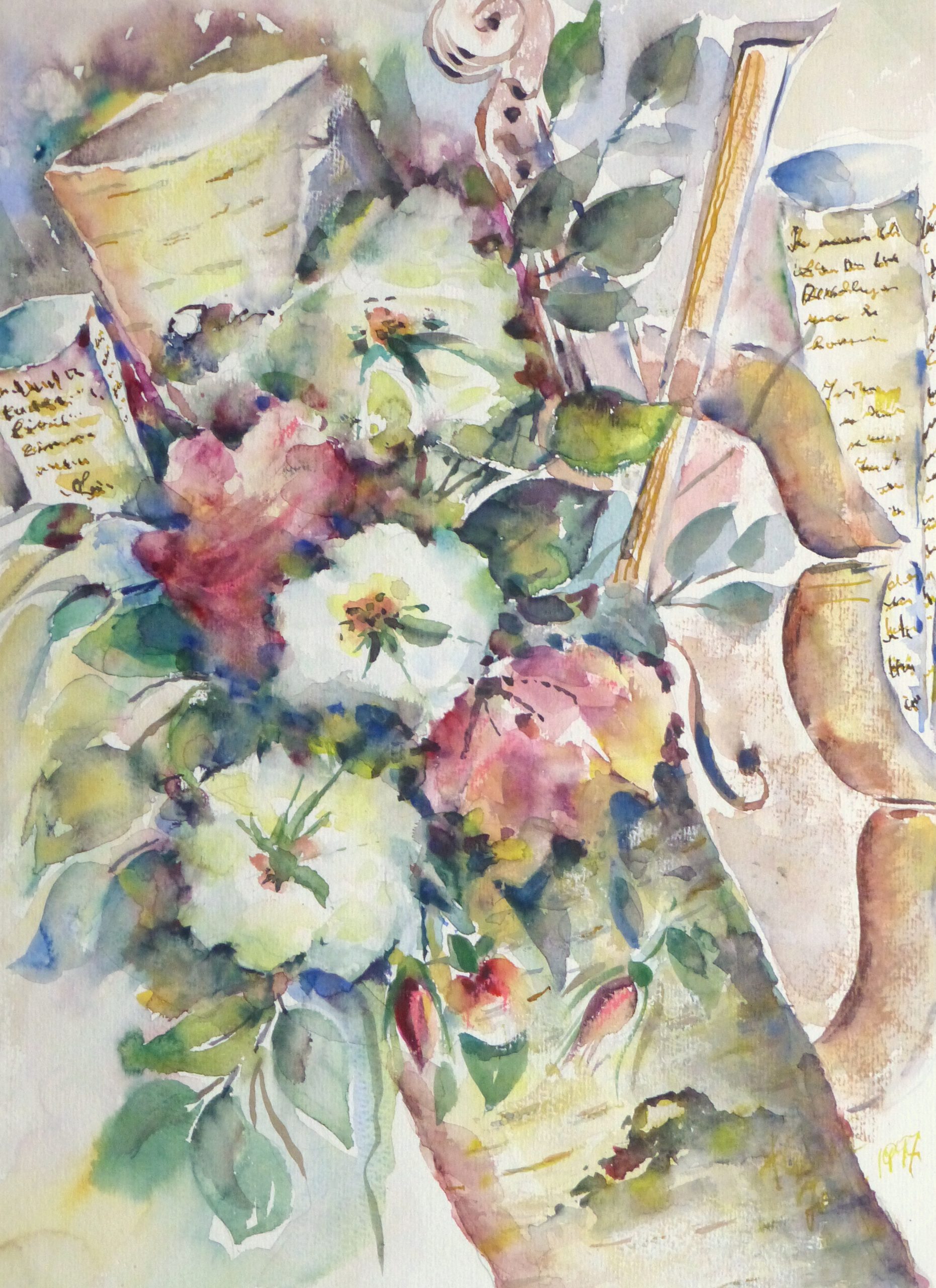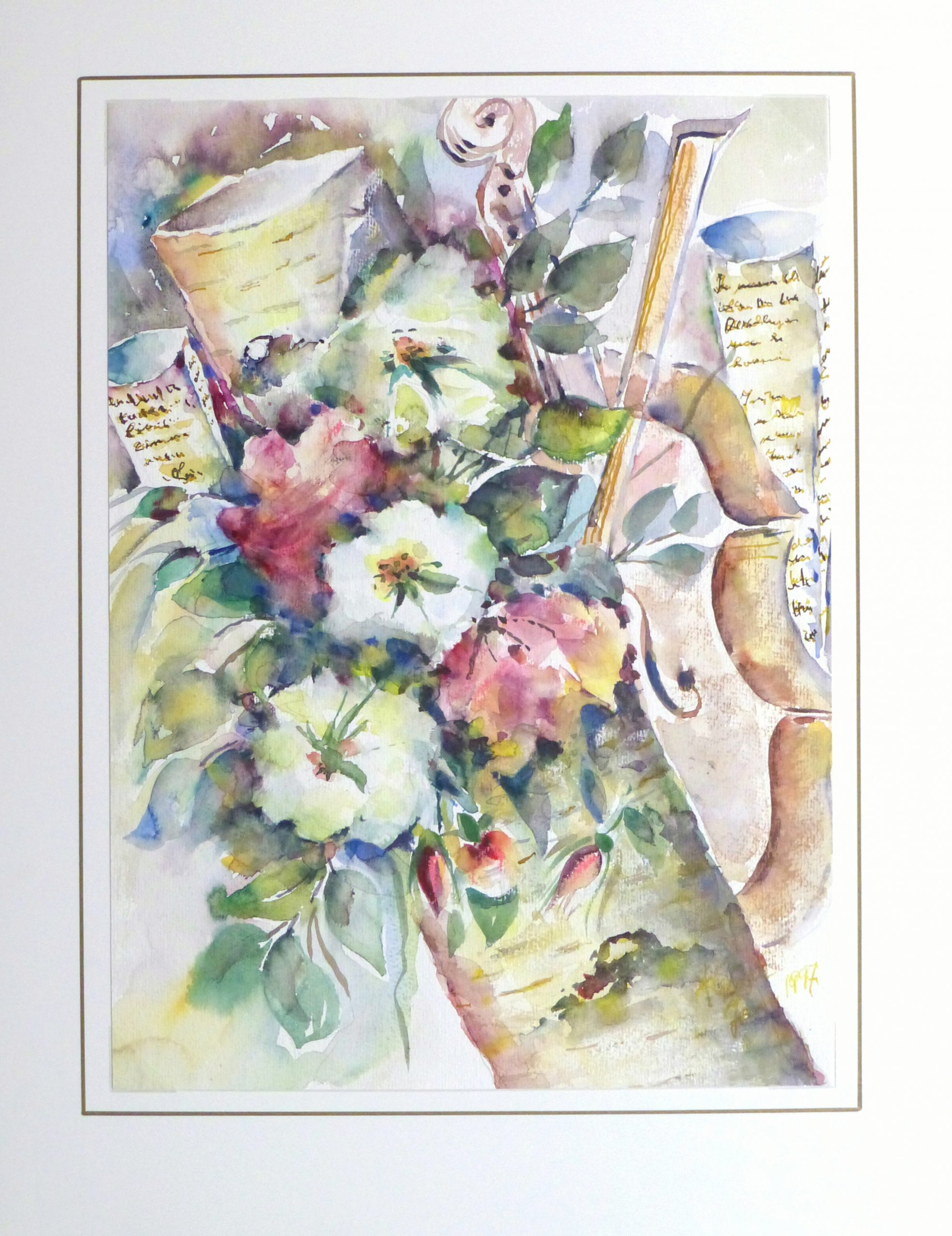 Gorgeous watercolor of a vibrant blooms paired with a violin and sheet music, 1997. Signed and dated lower right.