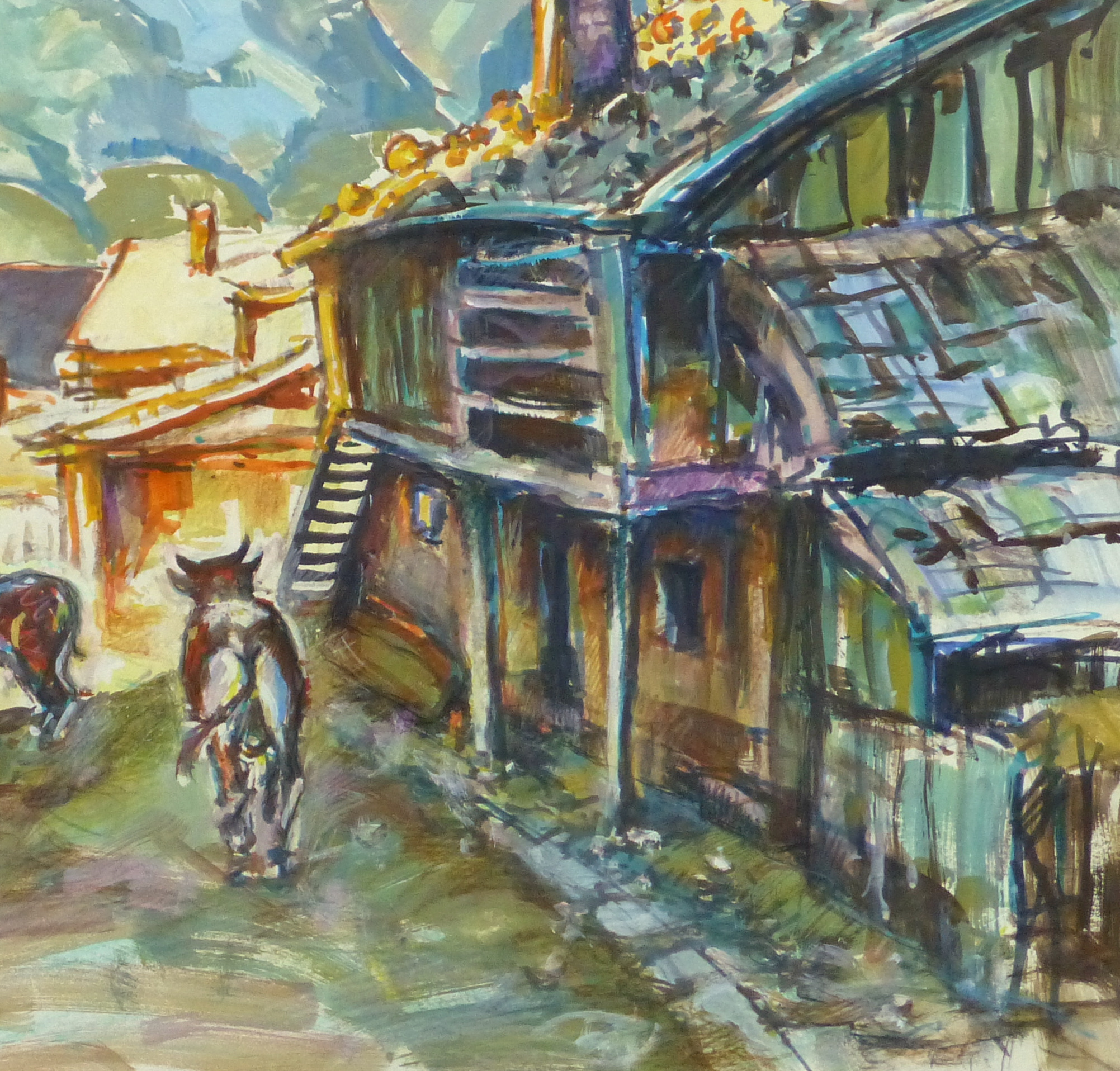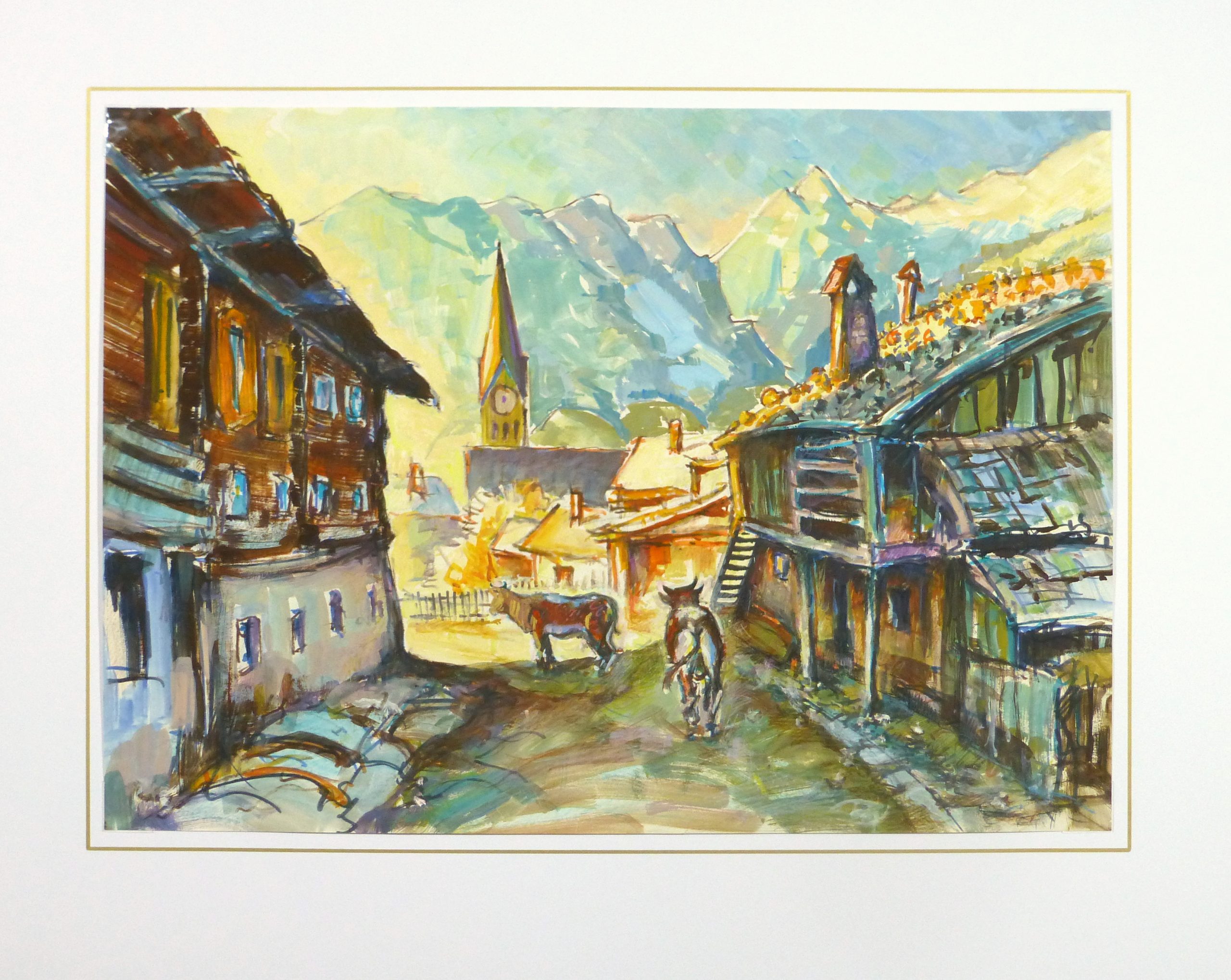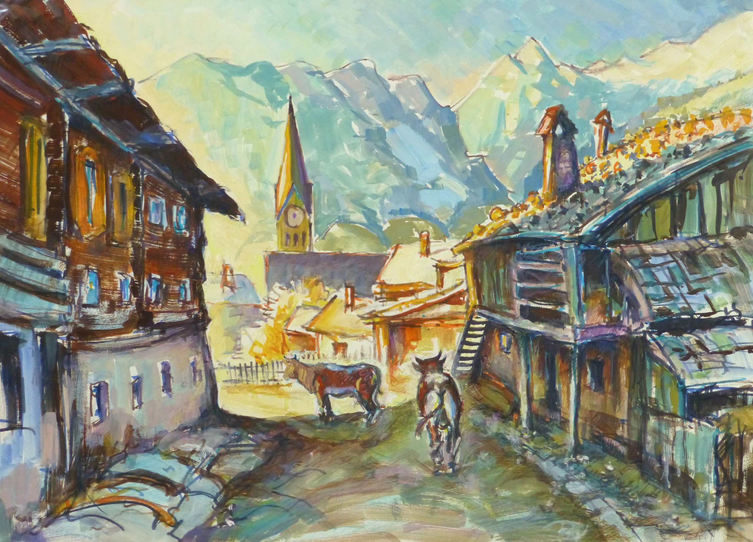 Charming gouache landscape of a rural mountainside town with livestock roaming the streets, in soothing hues of browns and blues, circa 1950.