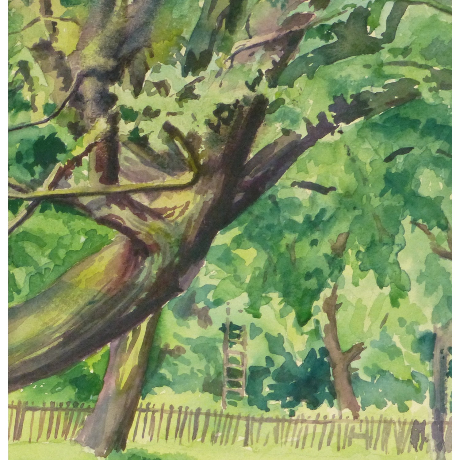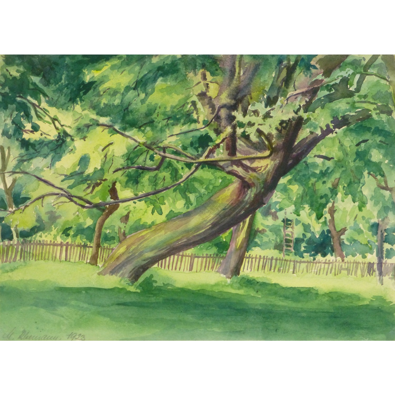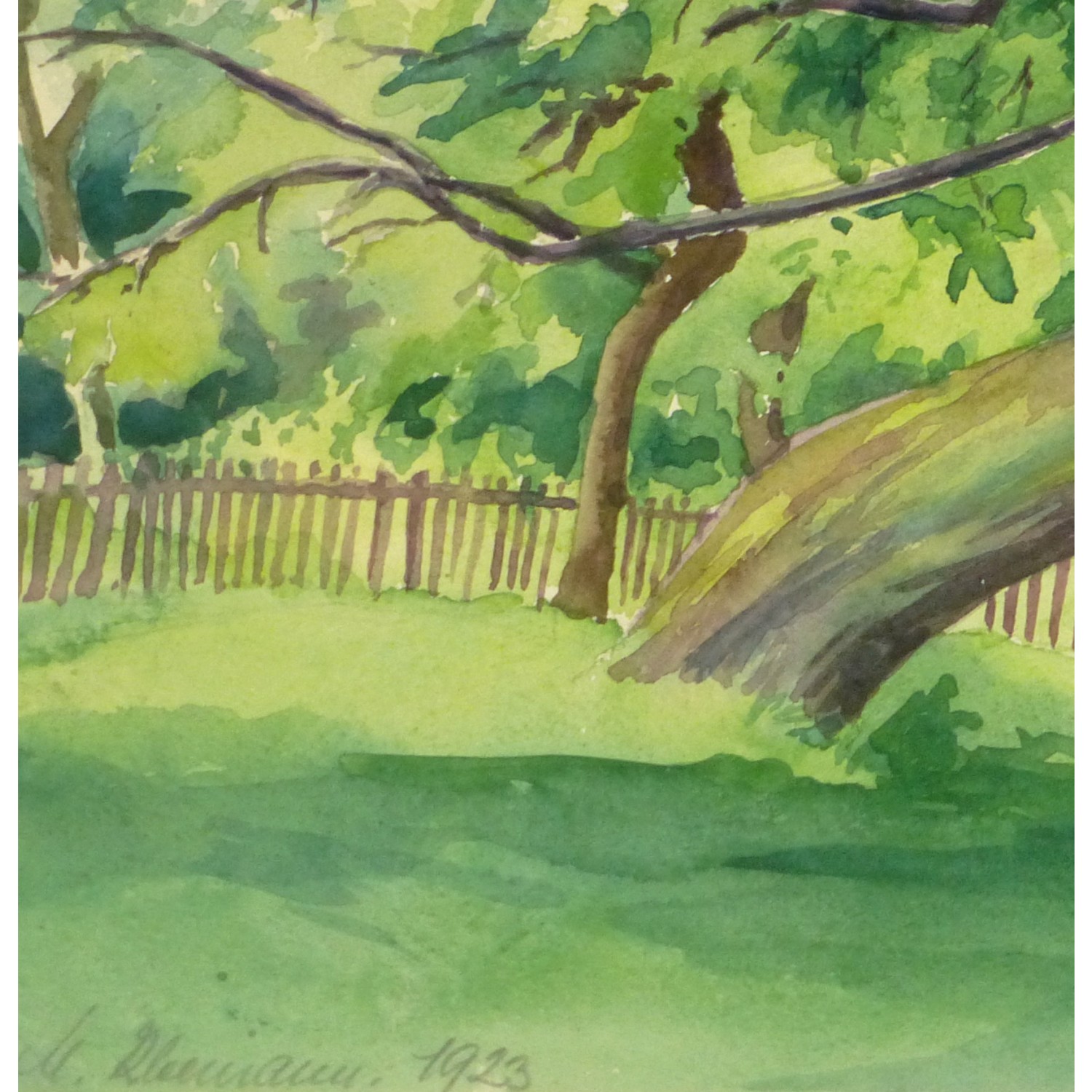 Vibrant watercolor landscape of a majestic tree shading the corner of a yard lush with green foliage by M. Kleemann, 1923. Signed and dated lower left.
