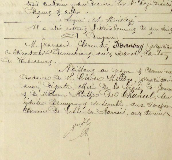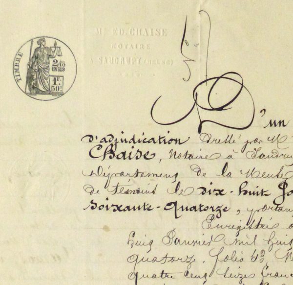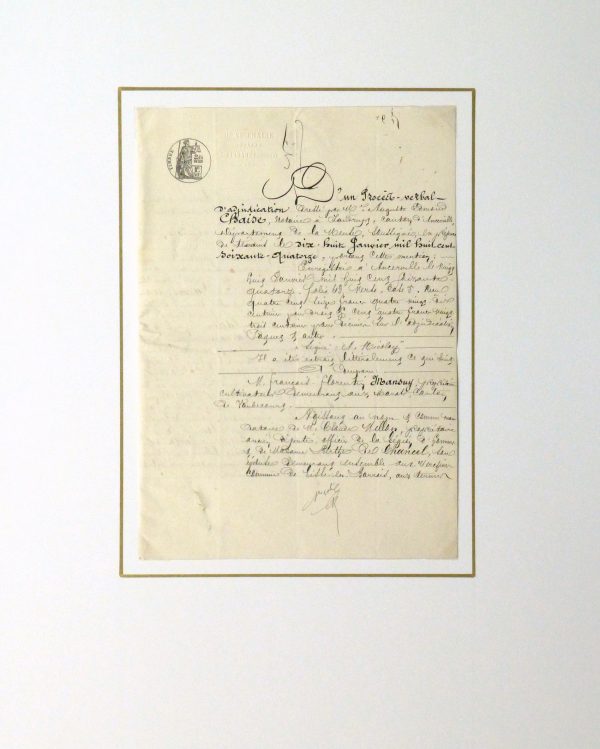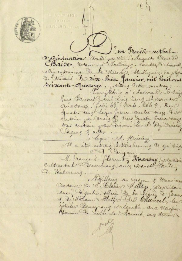 Original antique French manuscript of a property transaction between a farmer and a elected official, 1874. Historic black seal and blind seal upper left. Beautiful penmanship for great decoration.