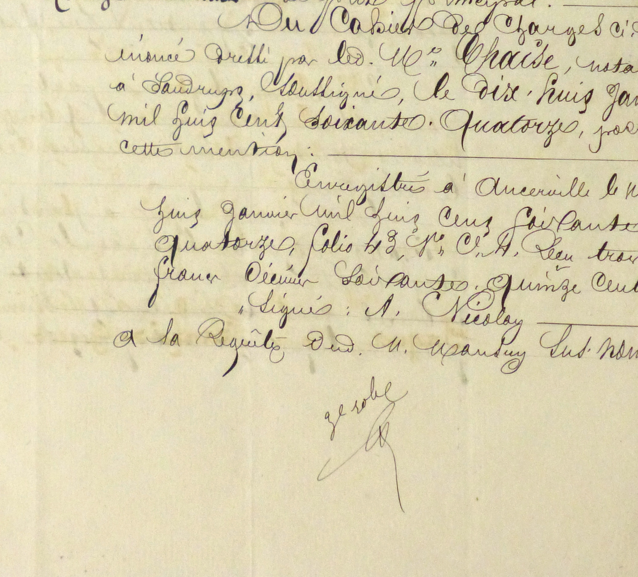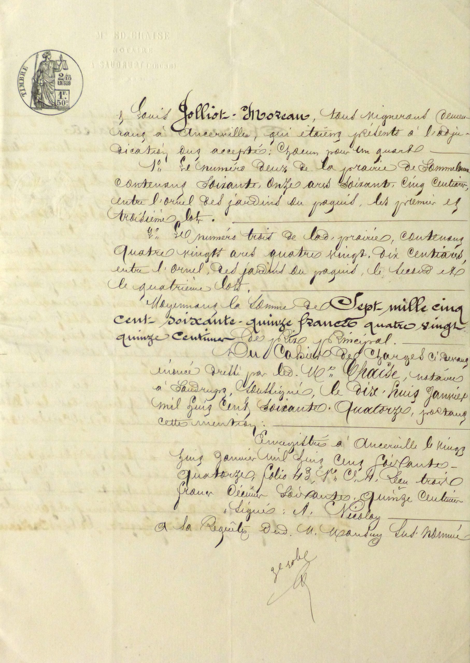 Original antique French manuscript of a property transaction including, 1874. Historic stamp duty seal and blind seal upper left. Beautiful penmanship for great decoration.