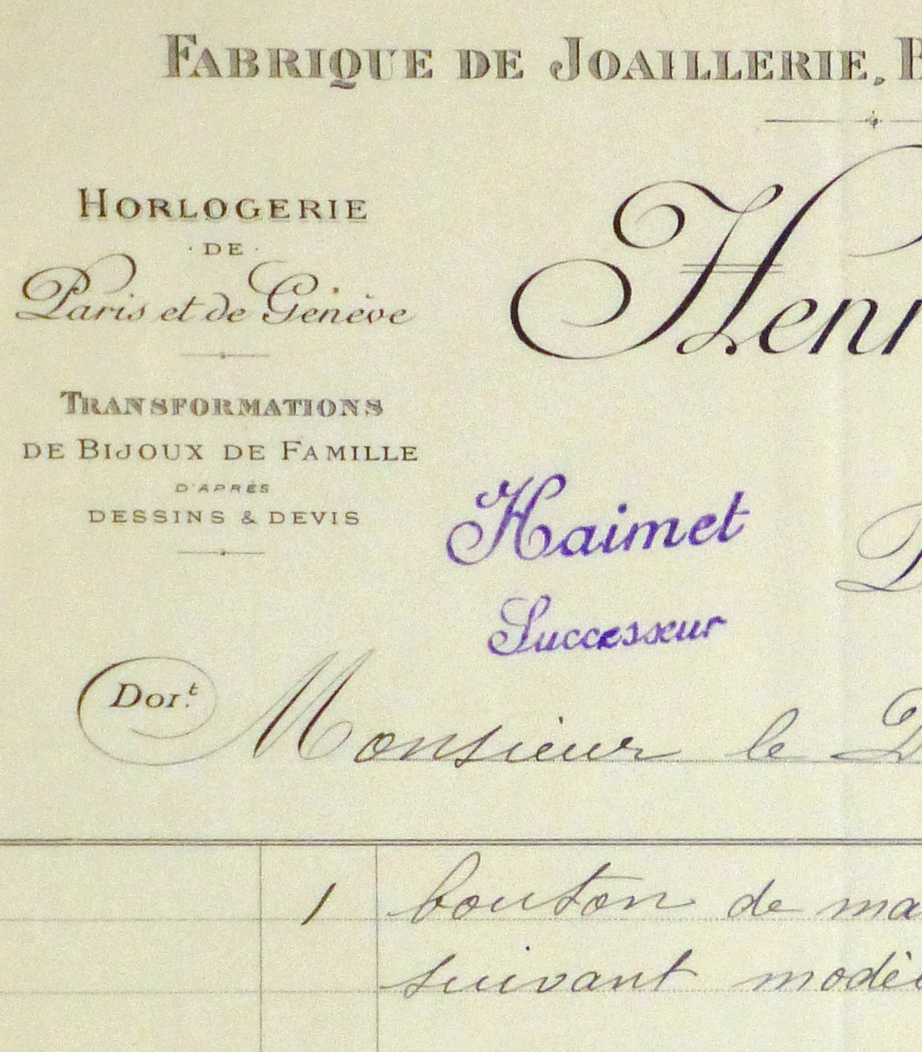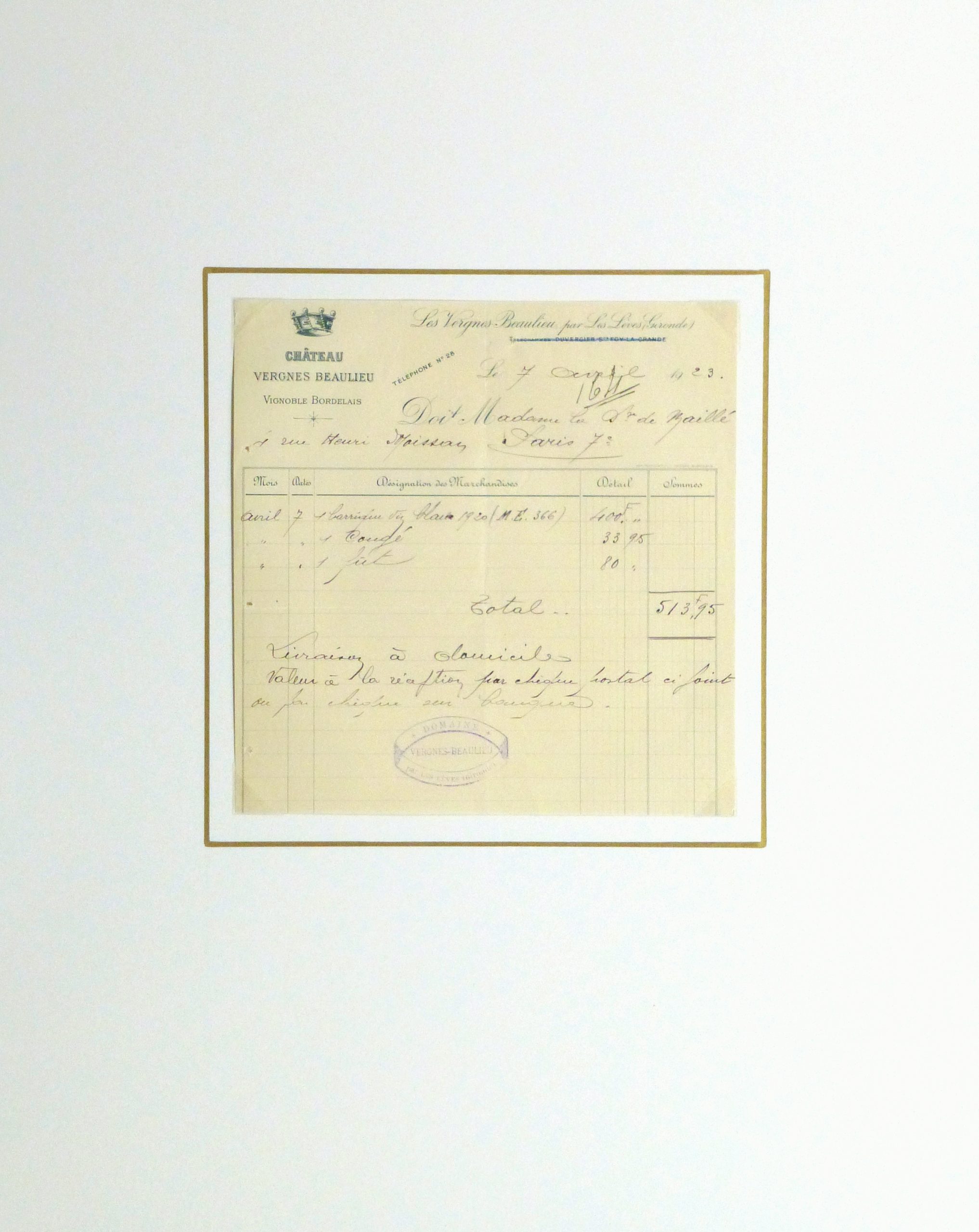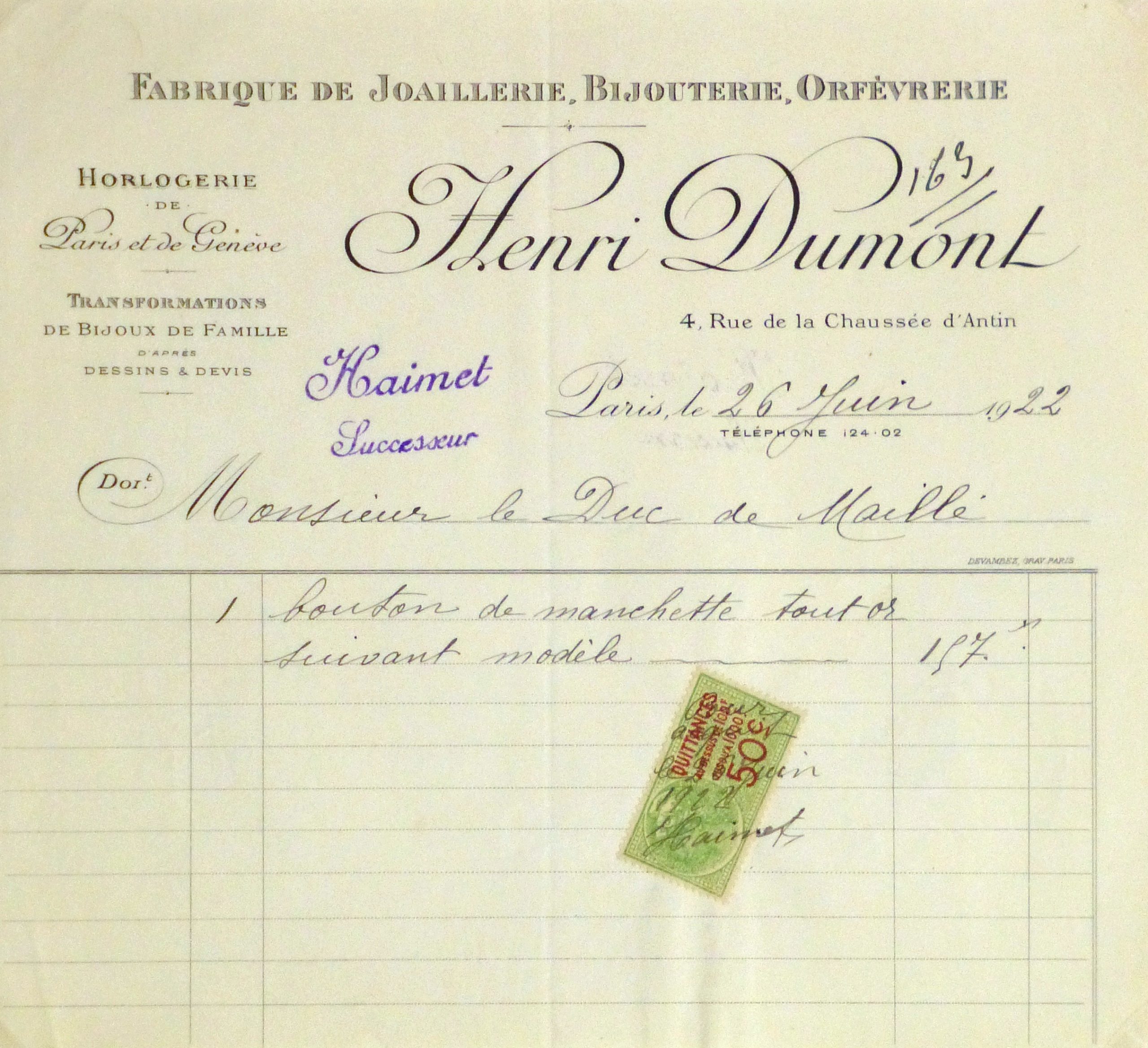 Vintage French receipt for cufflinks purchased by the Duchess de Maillé, 1922. Dated upper right.