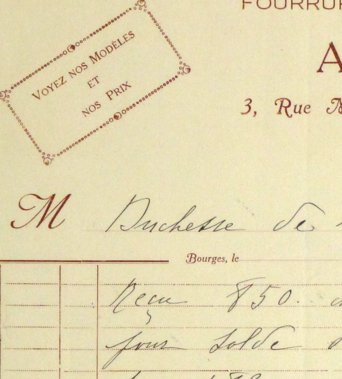 This receipt gives a little insight into the lives of a French Duke and Duchess. The Duke of Maillé, born Gilles de Maillé de la Tour Landry (1893-1972) and the Duchess de Maillé, born as the princess Anne Marie Radziwill (1907-1995) divided their time between their luxurious Paris apartment and their castle in Chateauneuf sur Cher shown in the attached image.