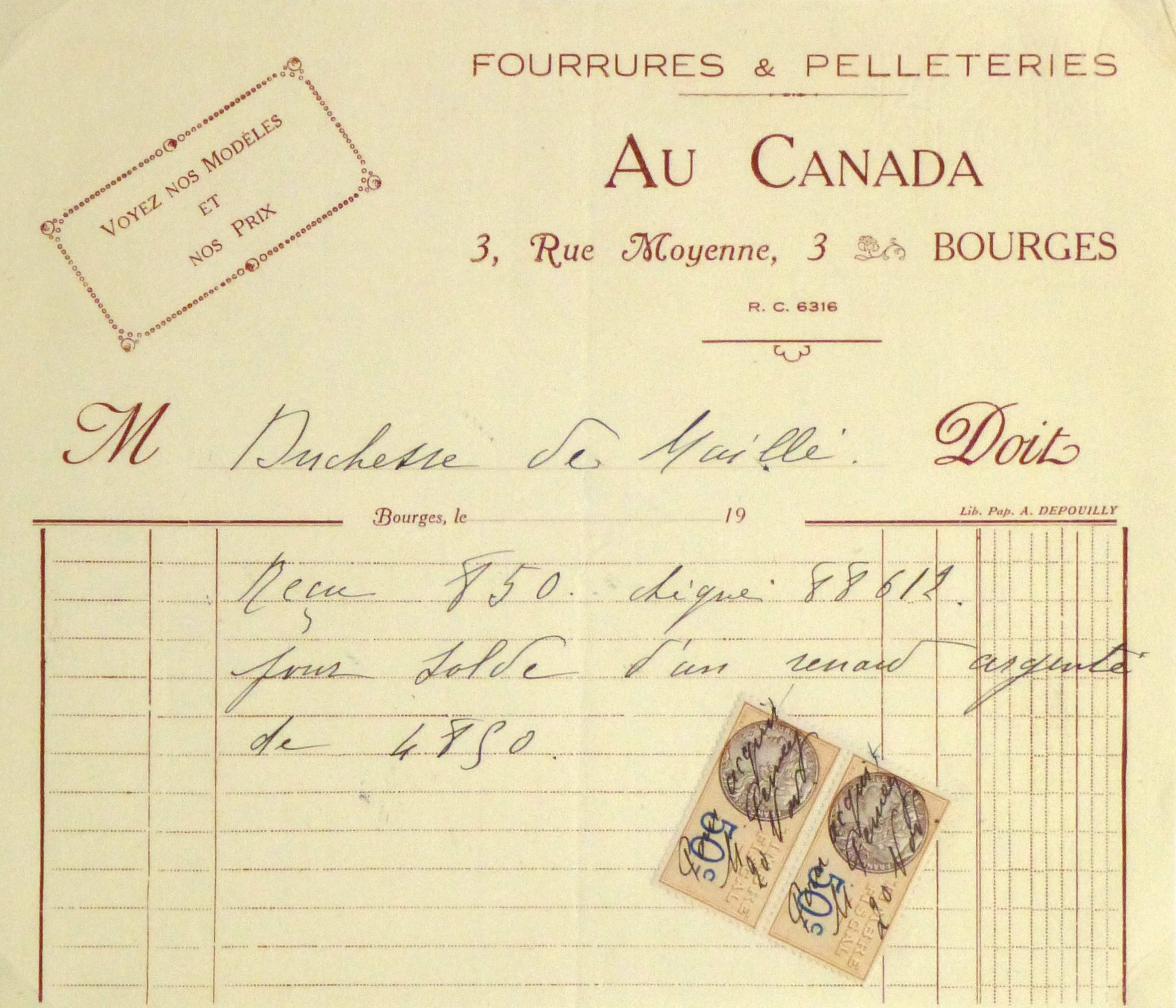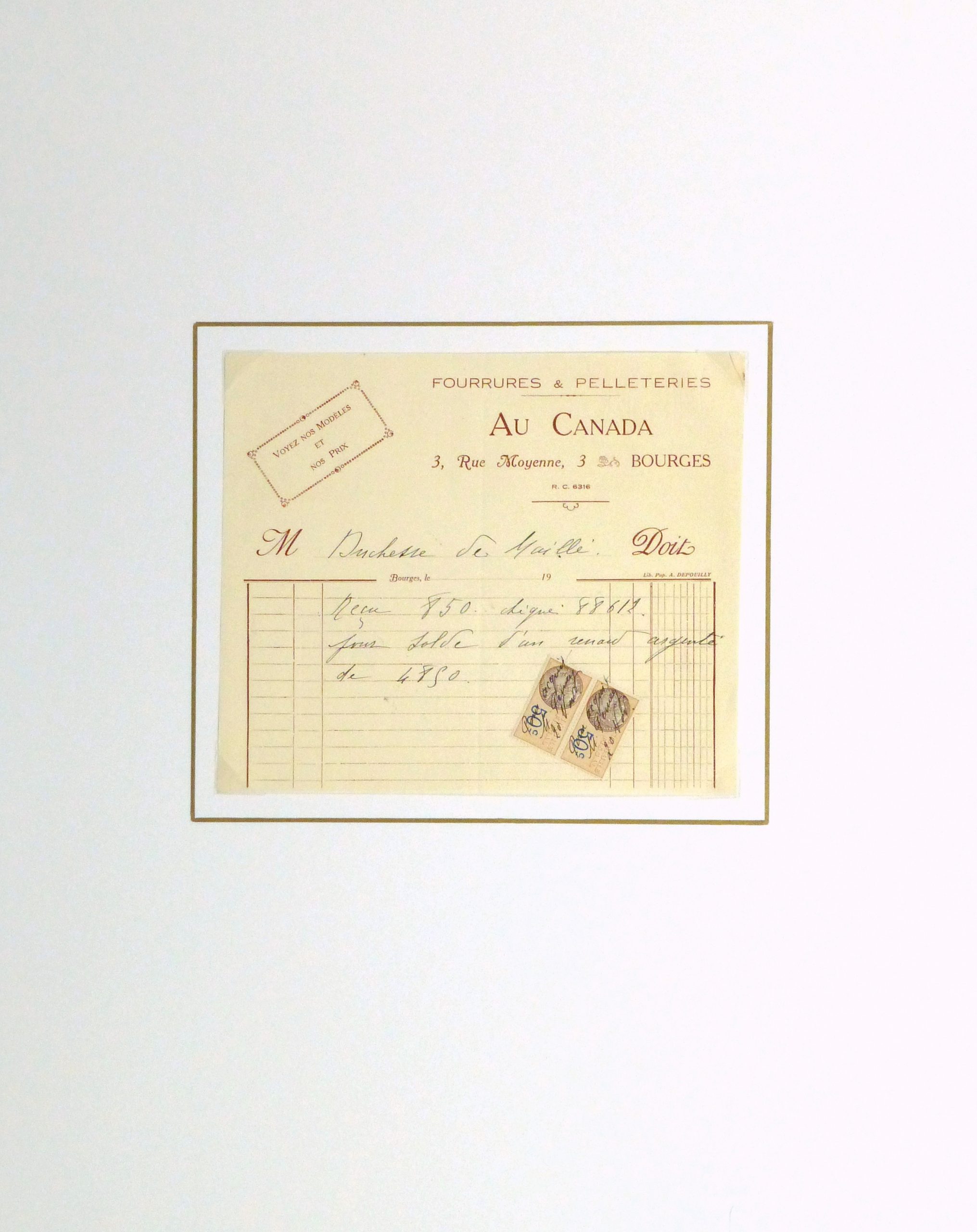 Vintage French receipt for fine furs purchased by the Duchess deMaillé, circa 1920.