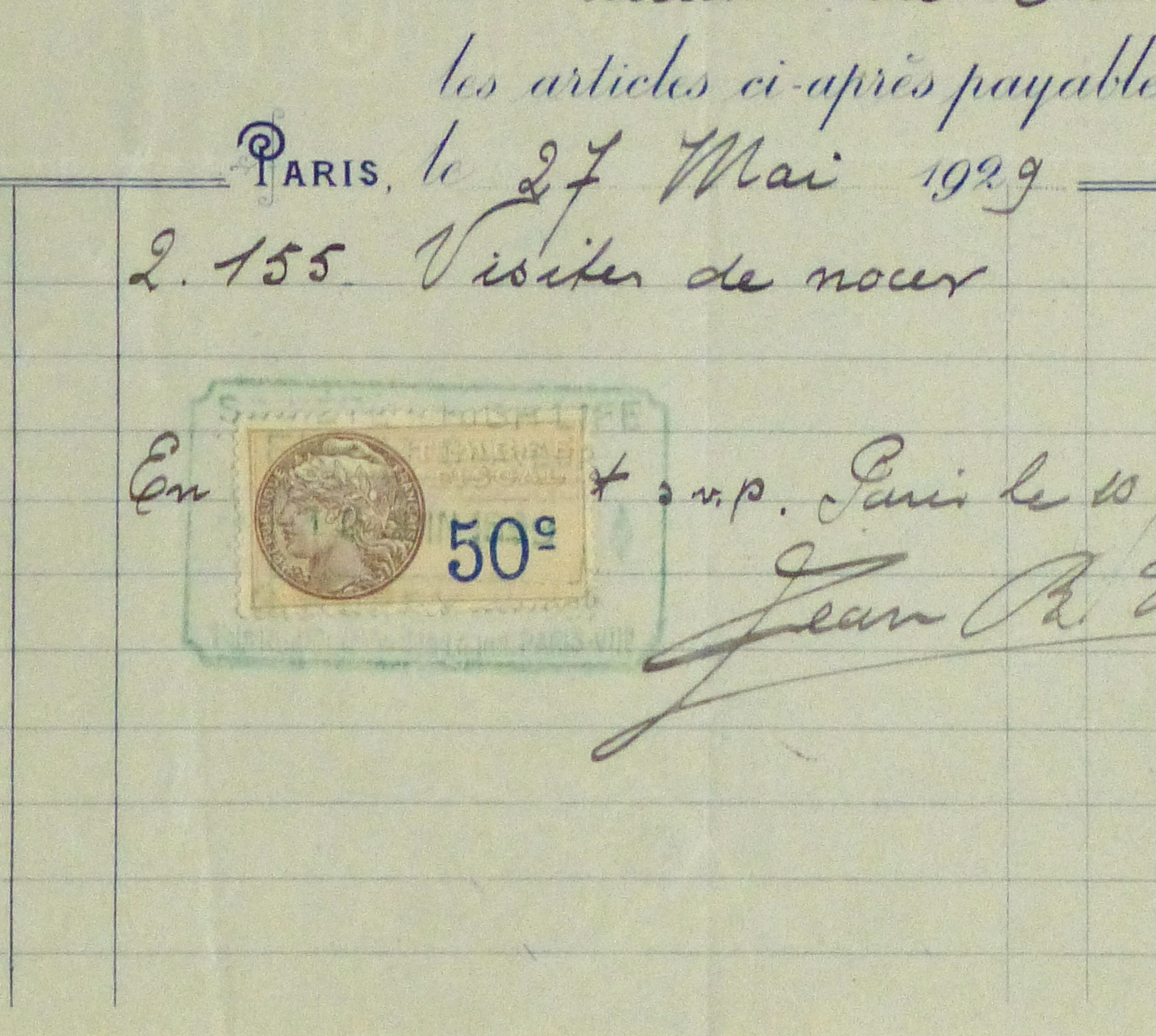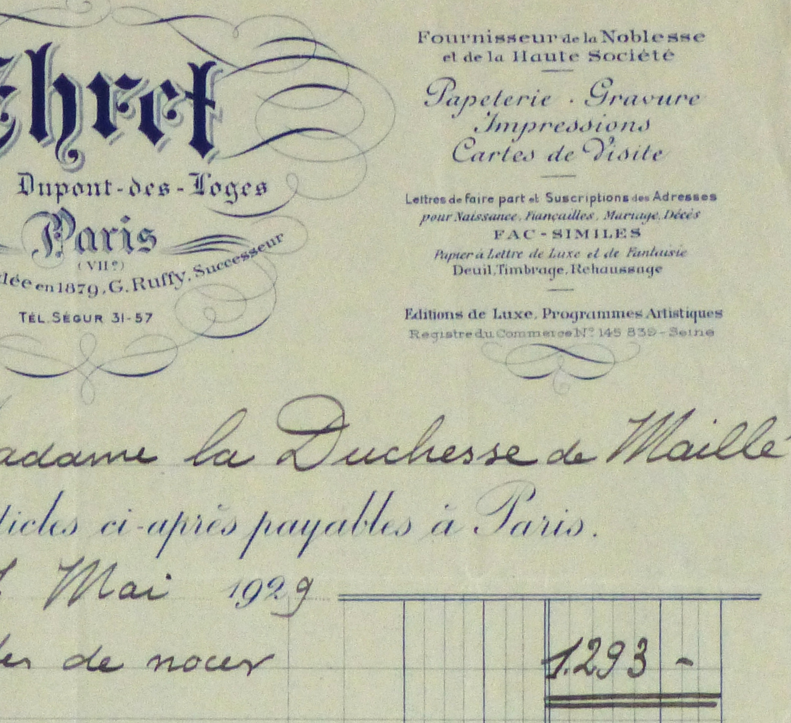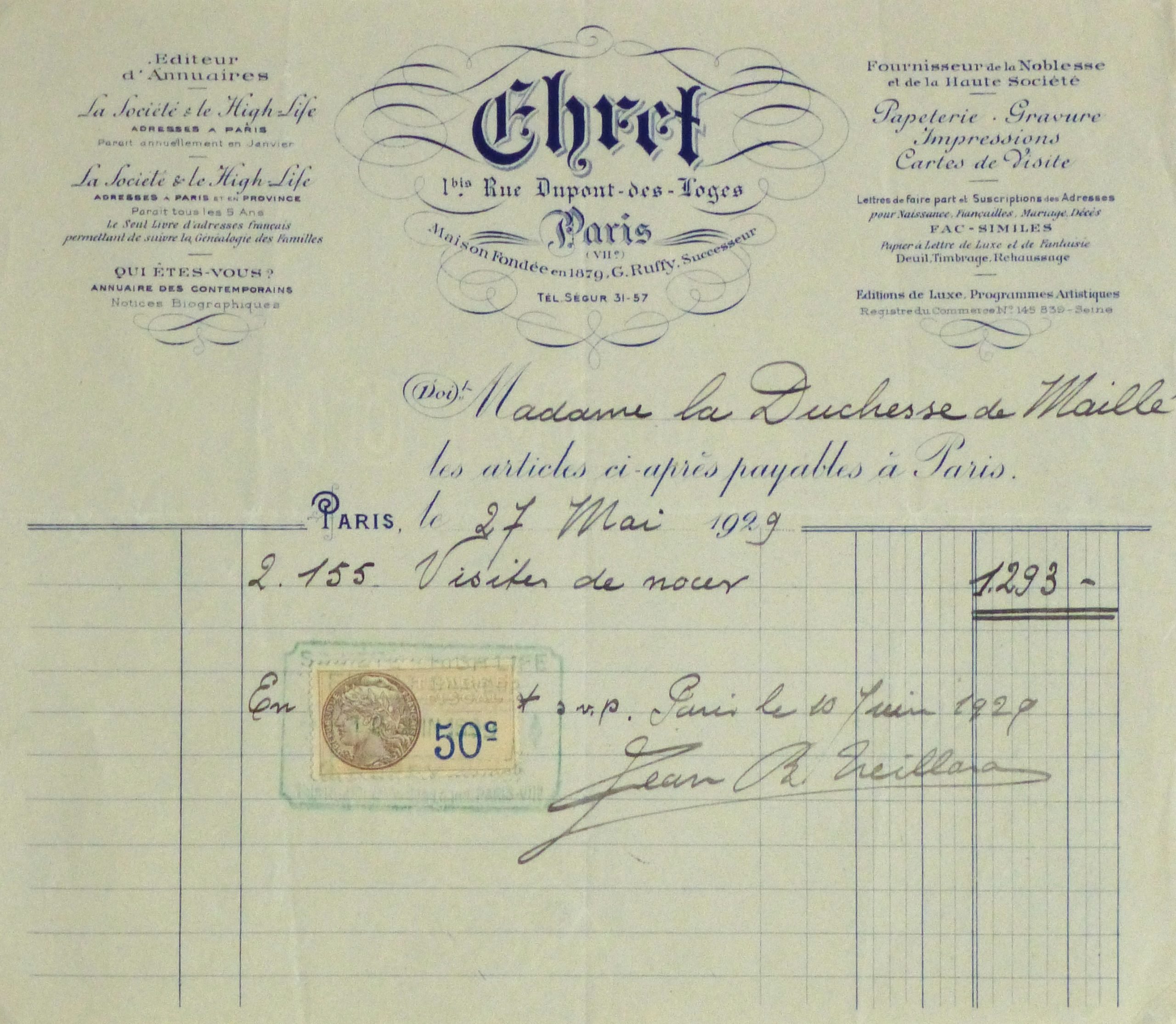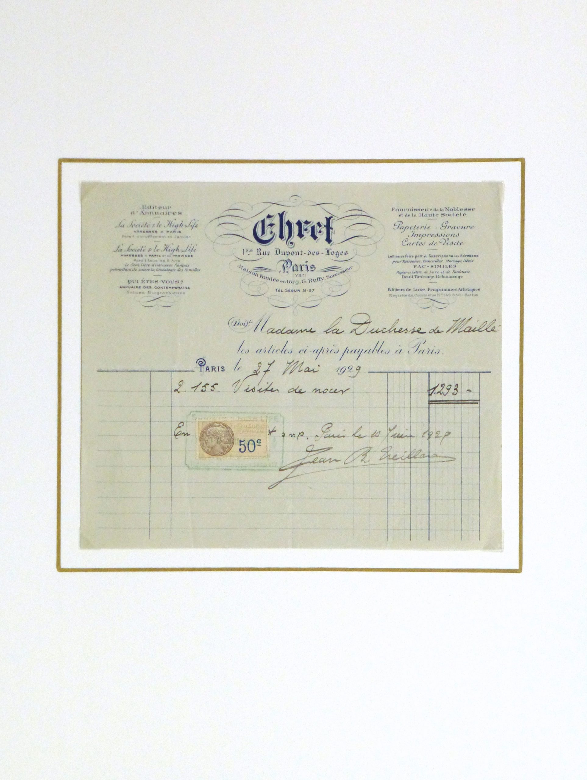 Vintage French receipt for stationary purchased by the Duchess de Maillé, 1929. Dated in center.