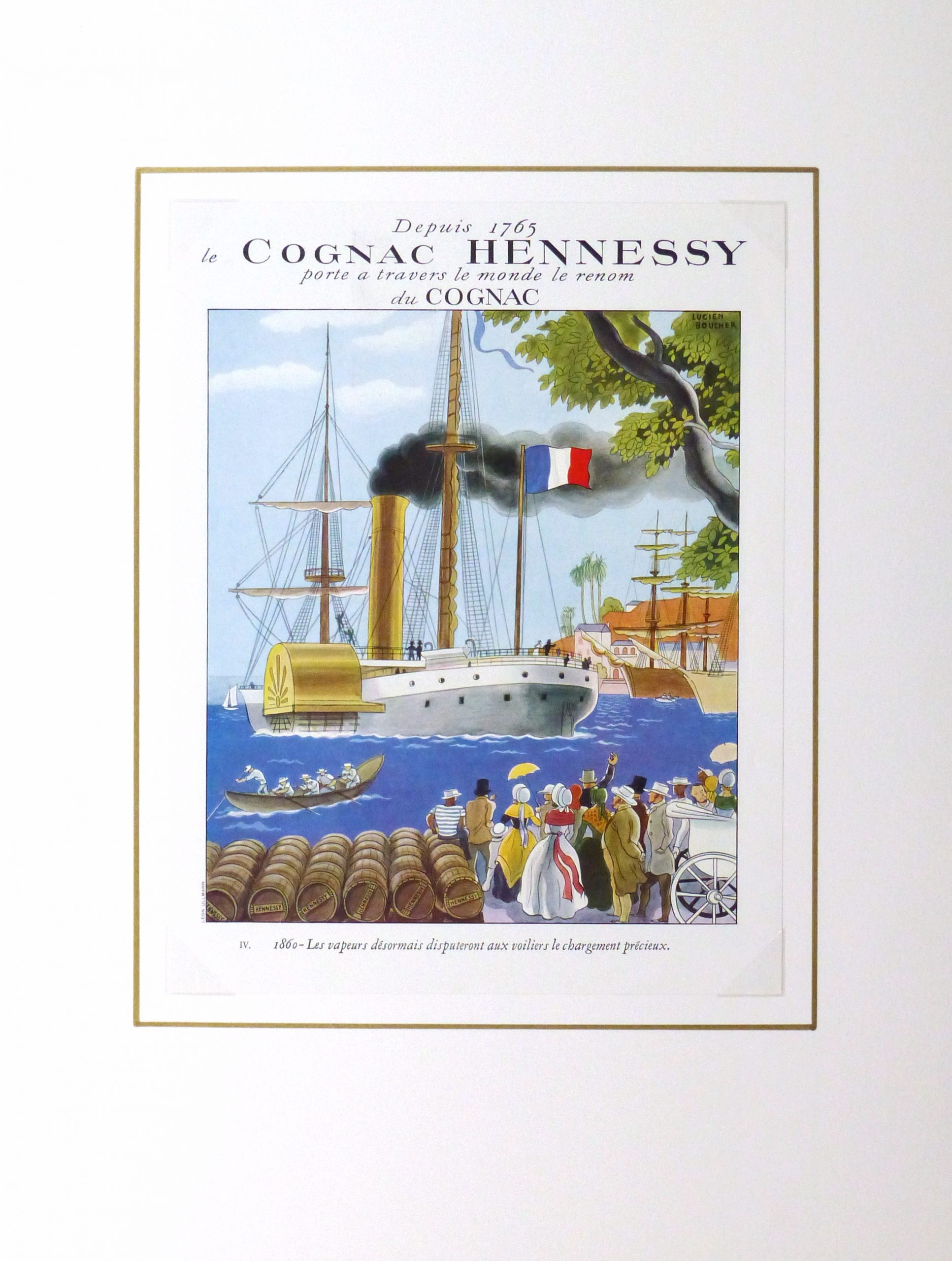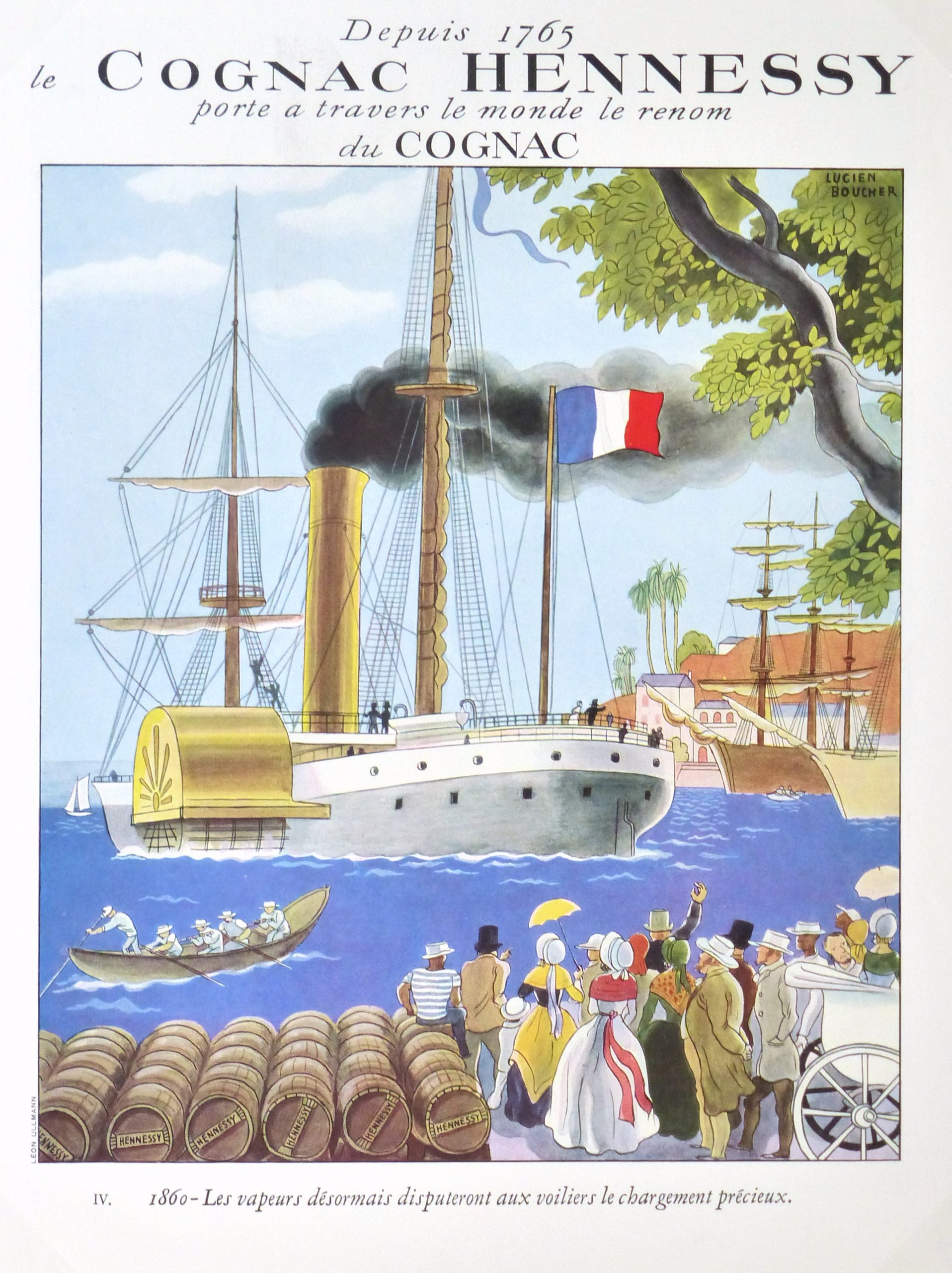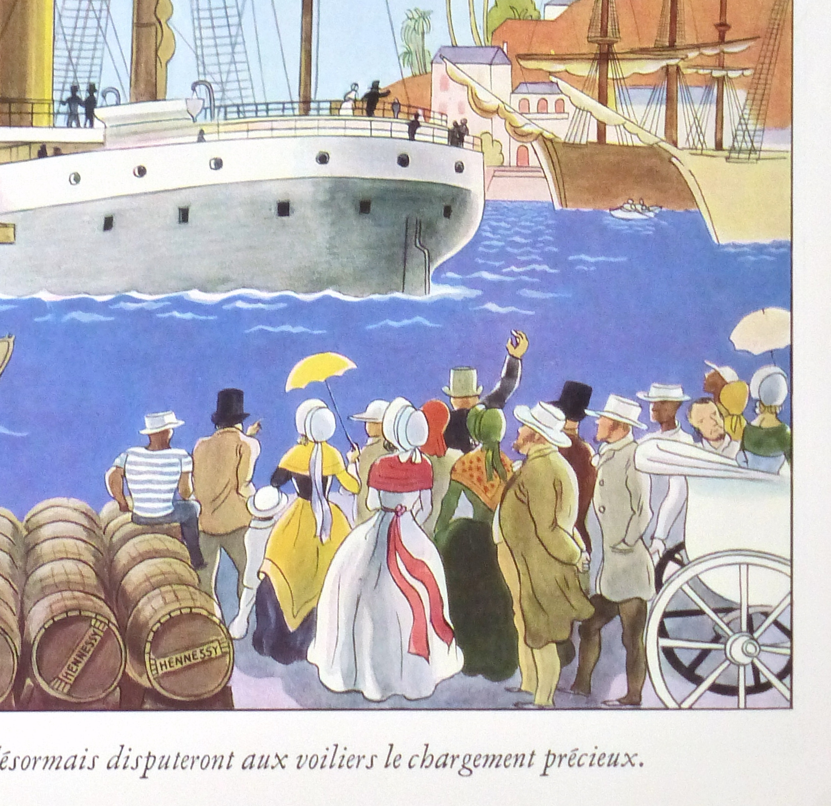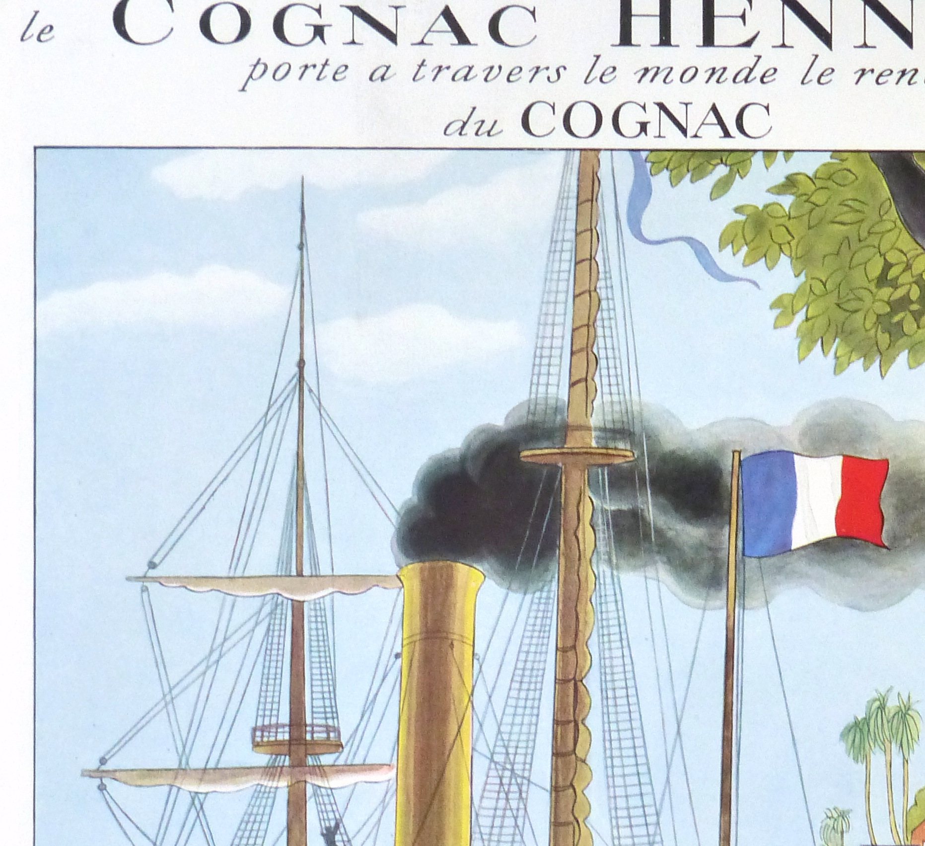 Vintage French advertisement for Hennessy cognac features a group of people gathered on the docks waiting the arrival of a cargo ship, circa 1920.