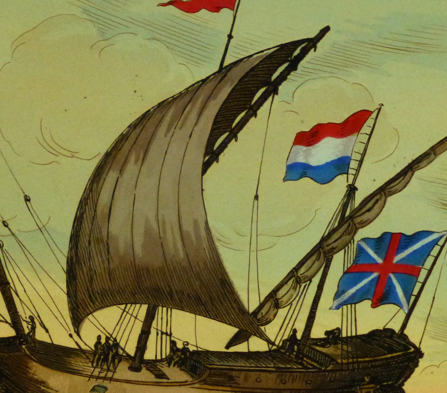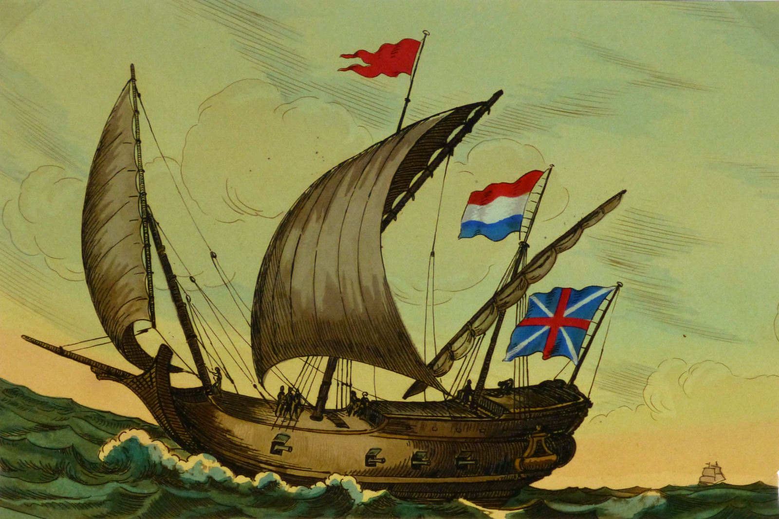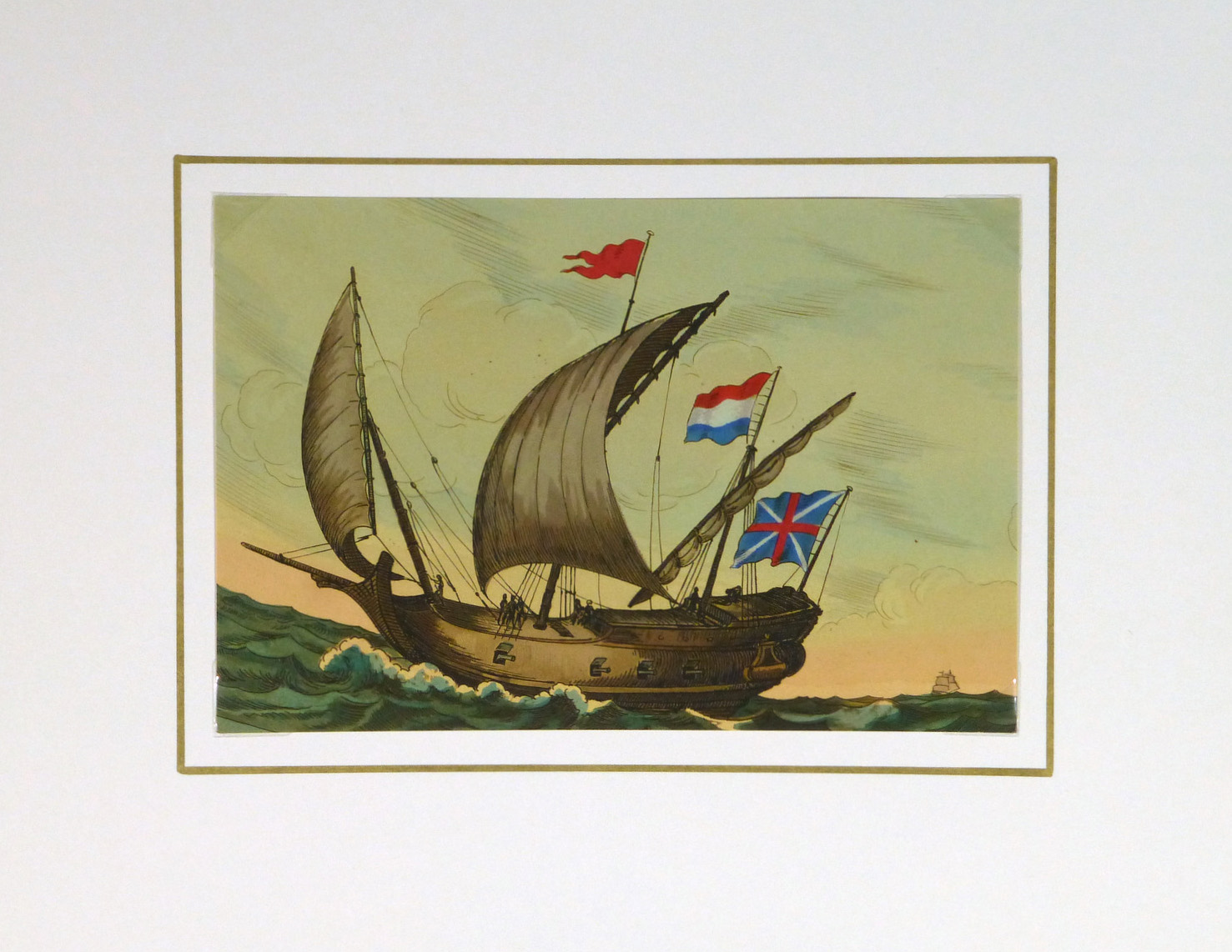 Brilliantly executed color woodcut of an Old World battleship, circa 1930.