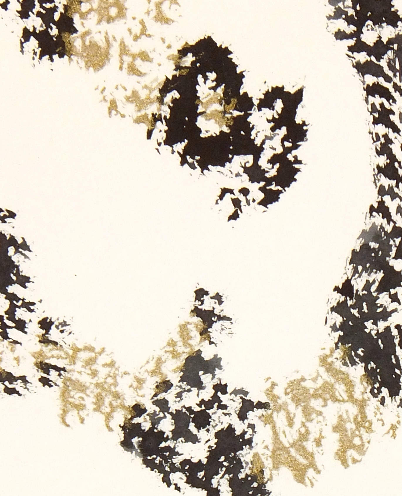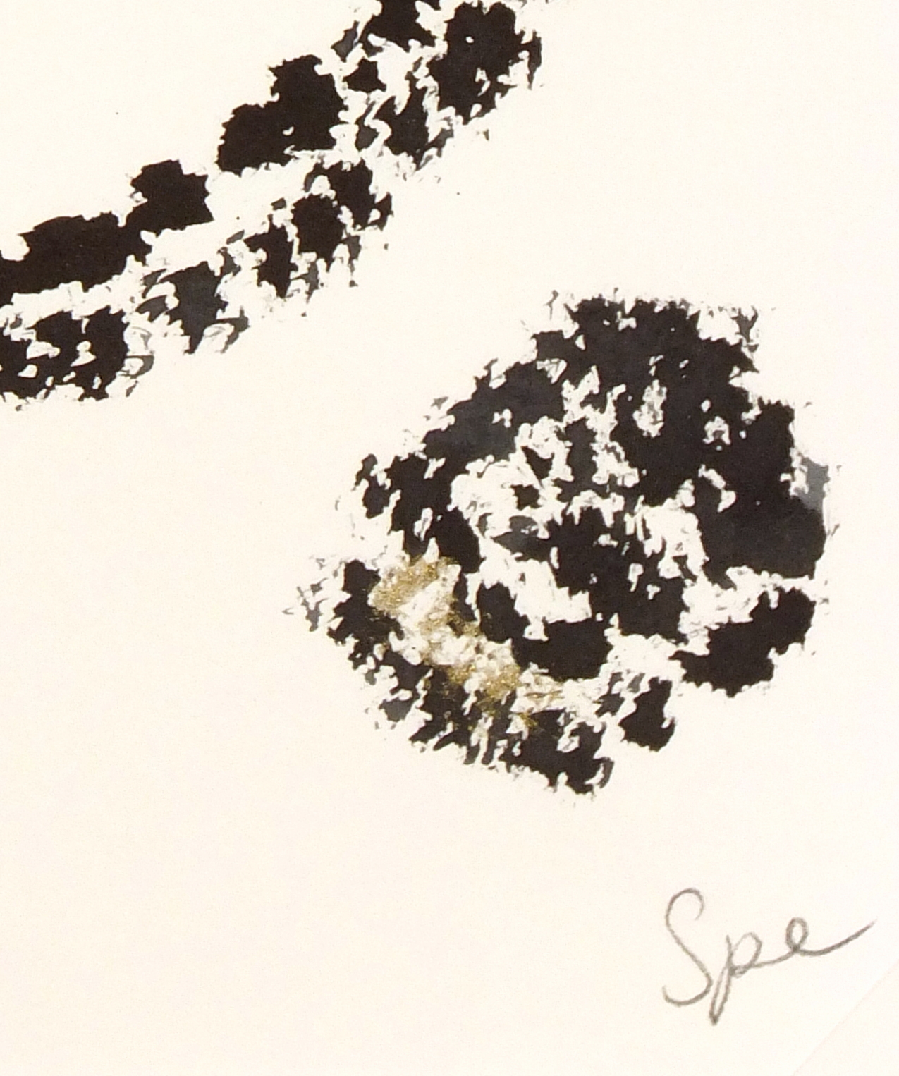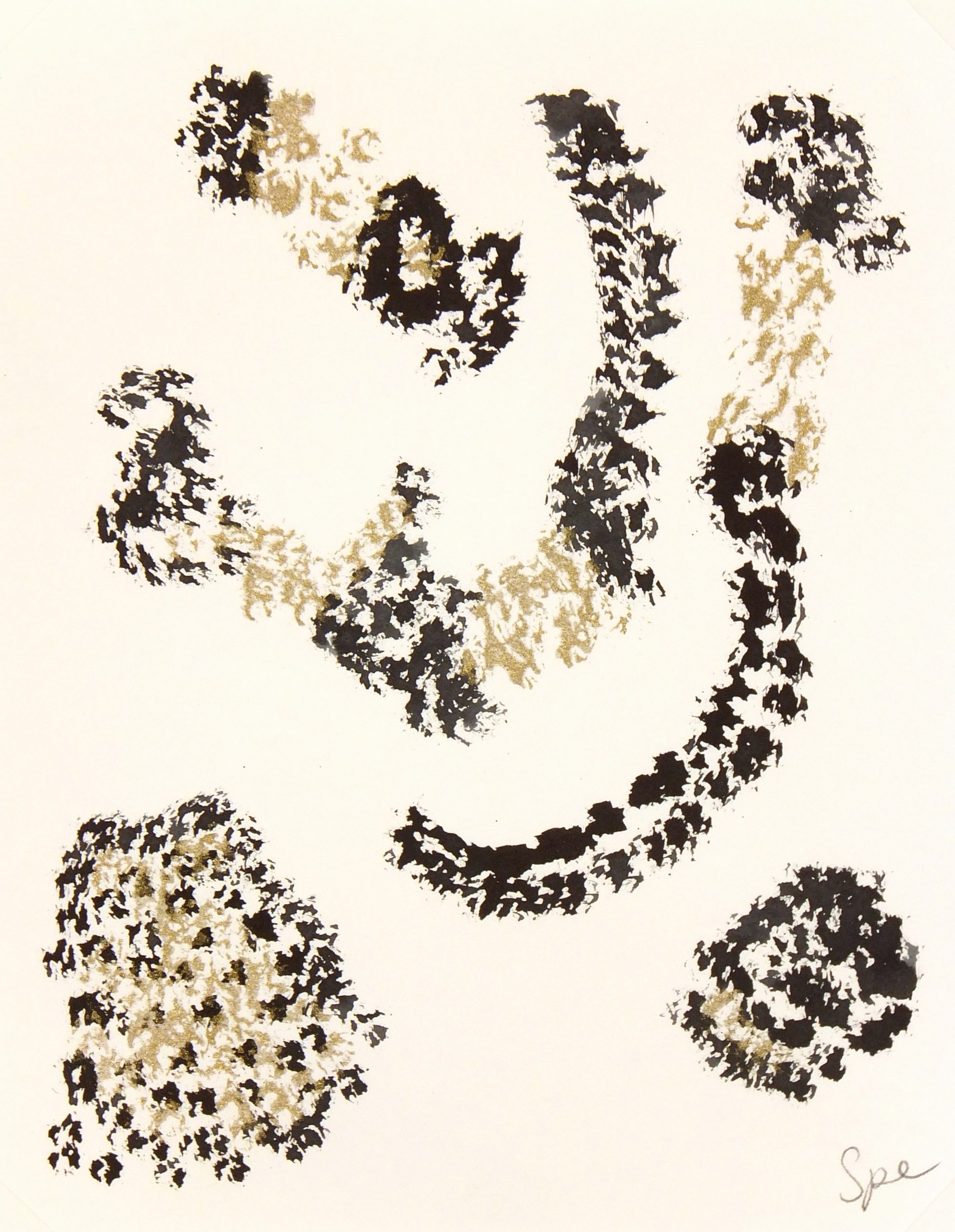 Abstract painting of various shapes made up of stippled dots of black and gold by Spe, 2011. Signed lower right.