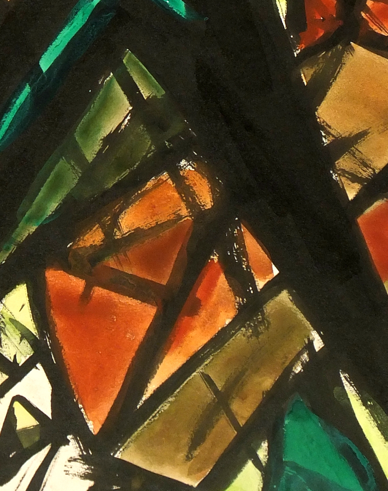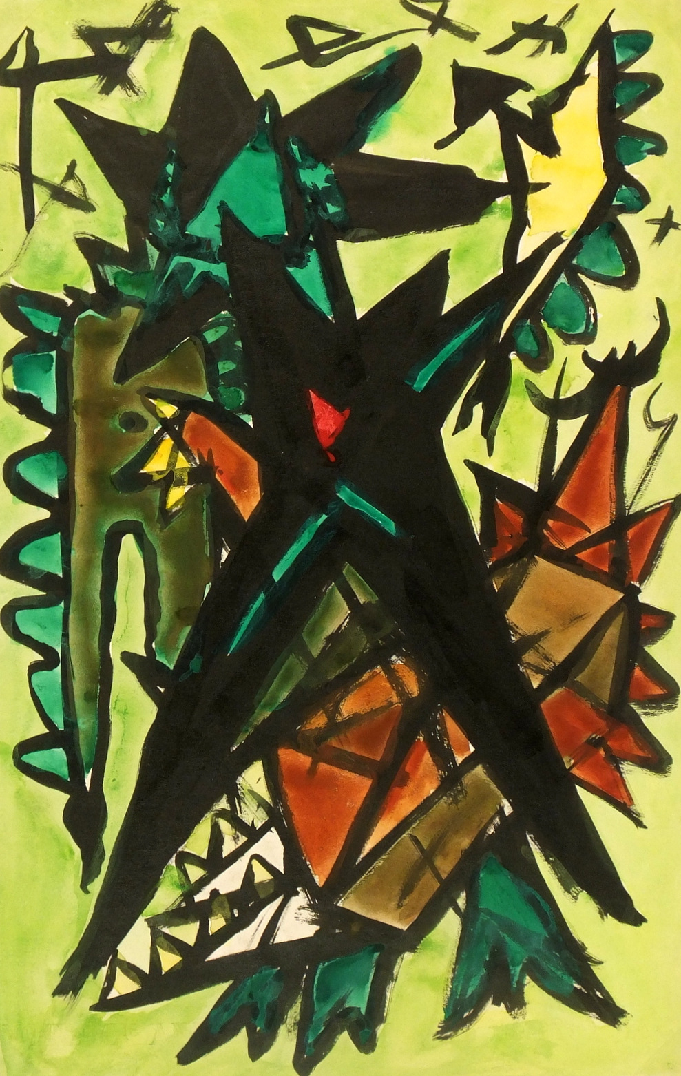 Lively abstract painting of various geometric shapes in lush foliage hues, circa 1960.